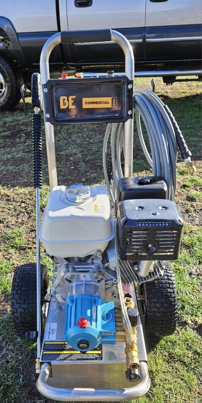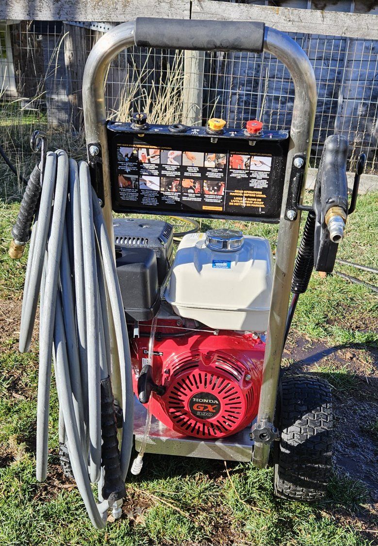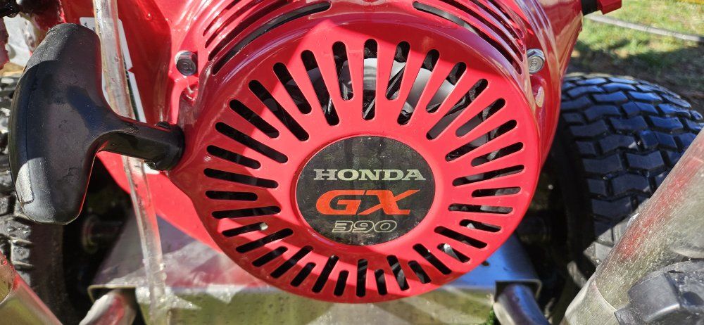 SS frame Cat pump Honda GX390 engine Flat free foam filled tires 50' 3/8" steel braided hose 0, 15, 40, and soap quick con. nozzles Siphon tube soap application Designed to be used all day every day