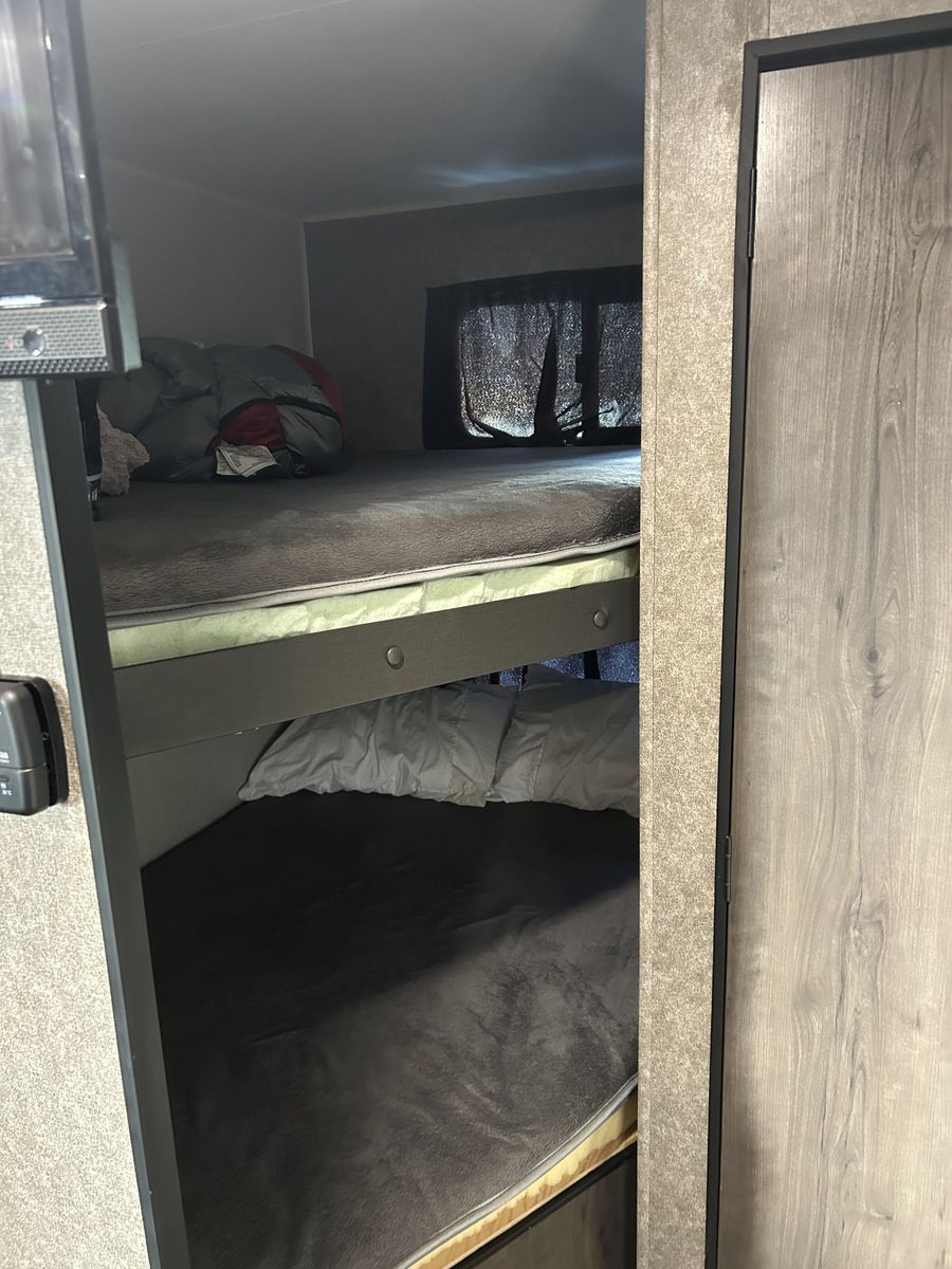 Features: •Solar panel prep (ready for easy solar connection) ️ •Family-friendly layout – comfortably sleeps 7 • Extra wide bunks •Full kitchen (stove, fridge, microwave) •Bathroom with shower •A/C and heater work great •Plenty of storage throughout •Electric awning • Television