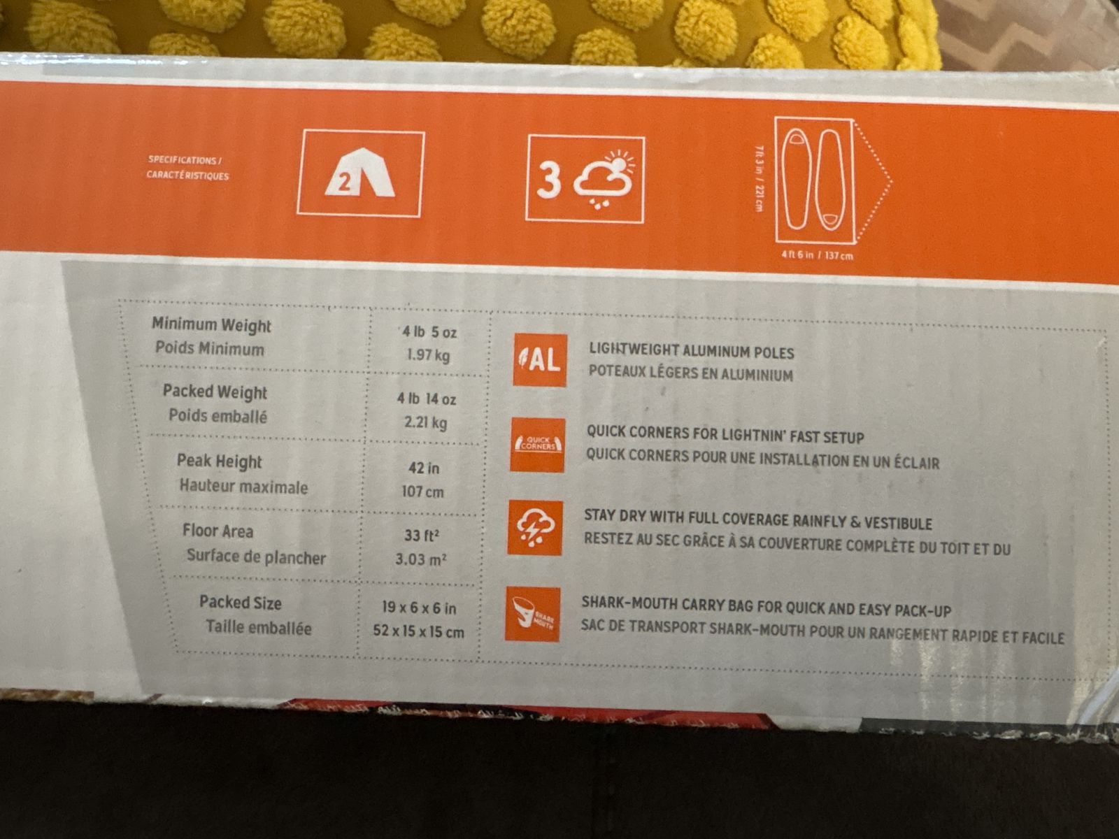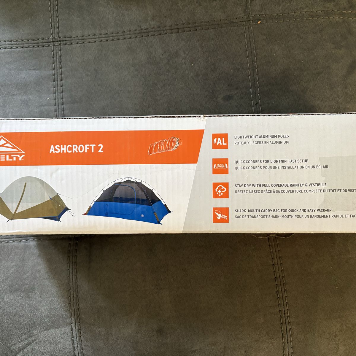 VenmoNew in box Kelty Ashcroft 2 tent. Never used and don’t plan on using. Packed weight 4lb 14oz. Height 42 in floor area 33 square feet. 7 ft 3 in x 4ft 6in.
