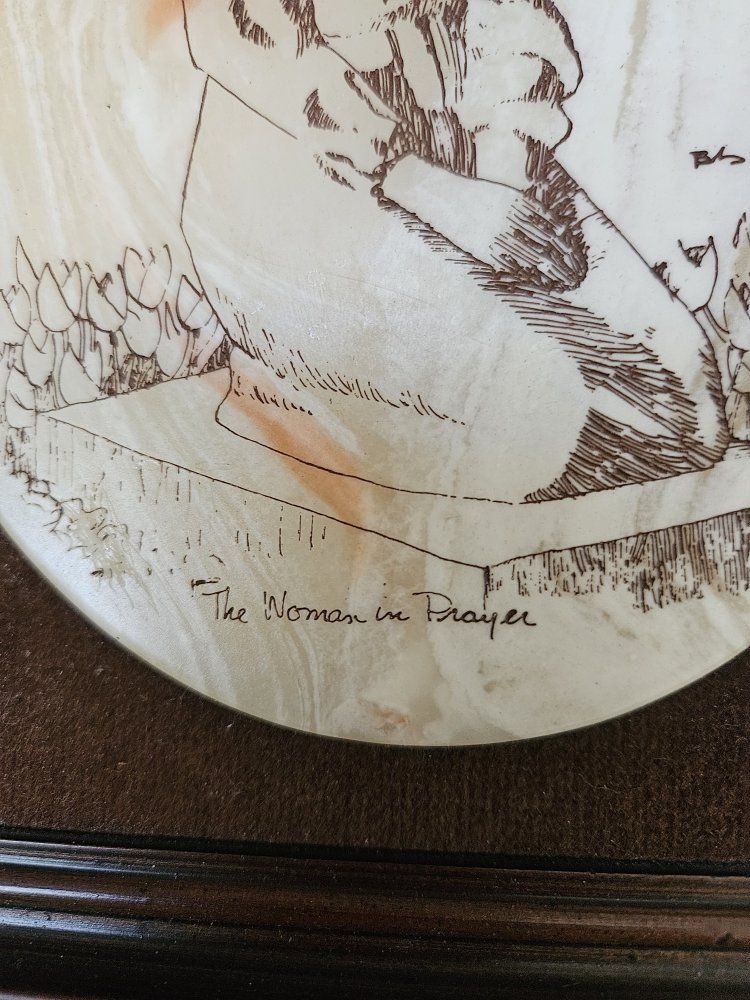 VenmoThis item appears to be a vintage soapstone carving or a similar etcheo material depicting a "Woman in Prayer". It is an oval-shaped plaque featuring detailed line art etched onto a cream- colored surface The carving is mounted in a dark brown wooden frame with a contrasting velvet or suede matting These types of decorative etched olaques often resemble scrimshaw but are frequently made from soapstone or other soft materials. measures tall 9", wide 8". No damage, from a smoke and pet free home. I'm moving from a house to an apartment. Please see my other listings. Thank you!