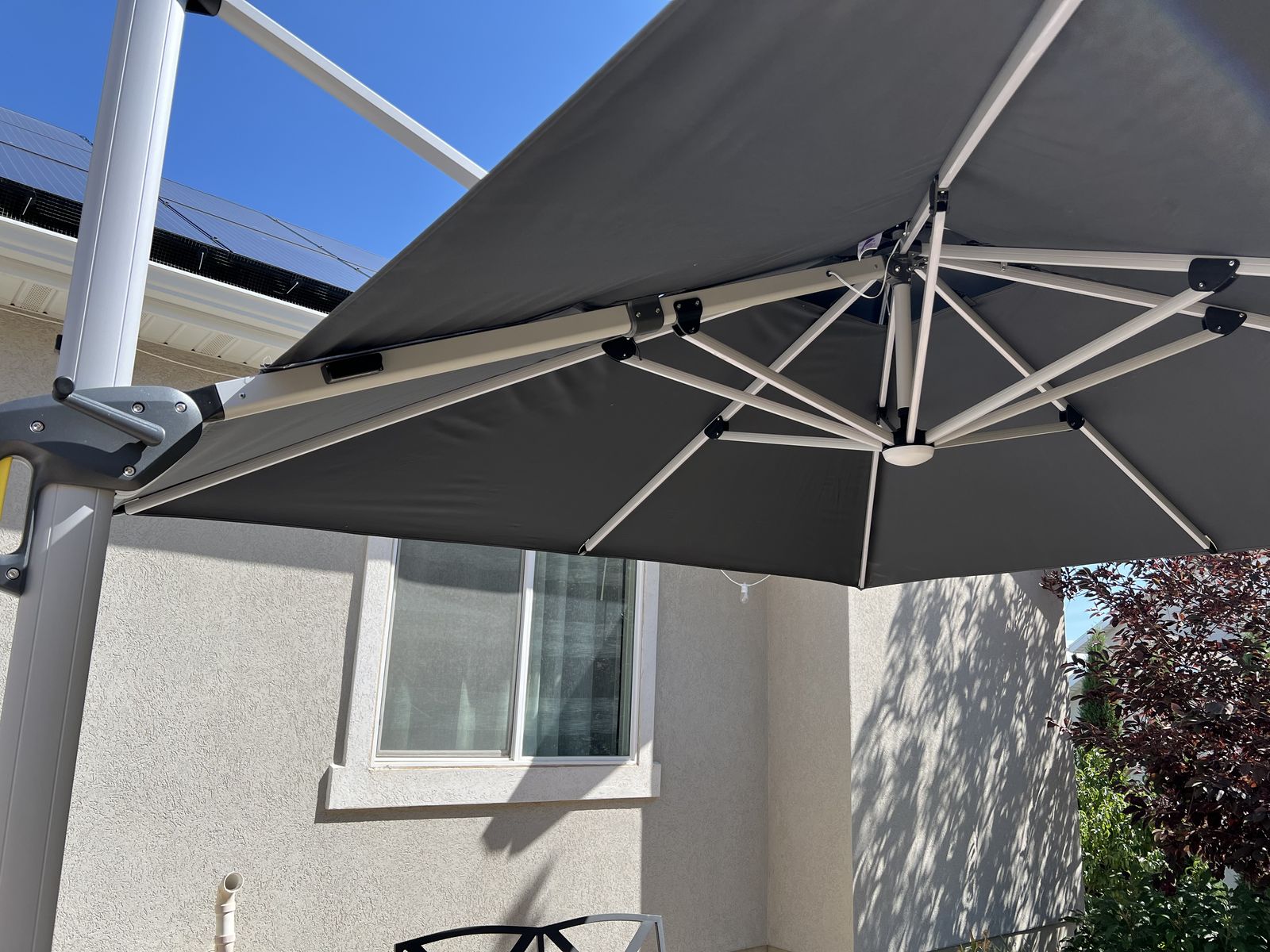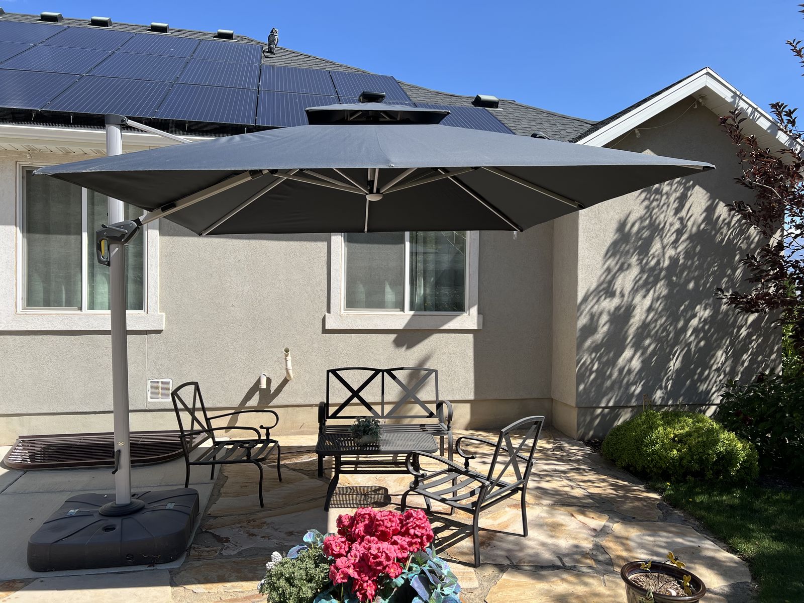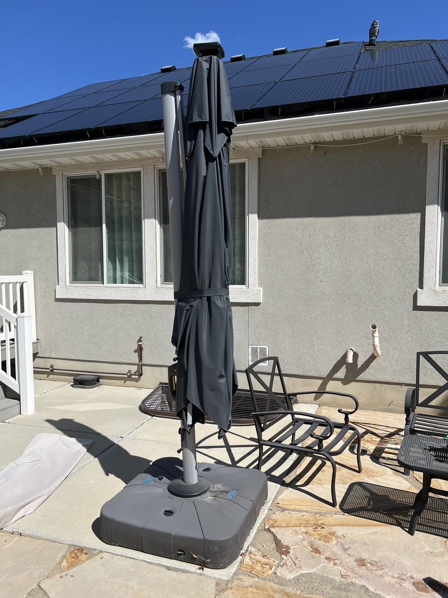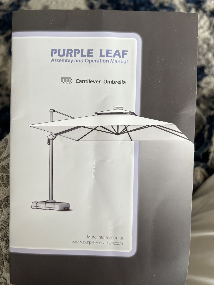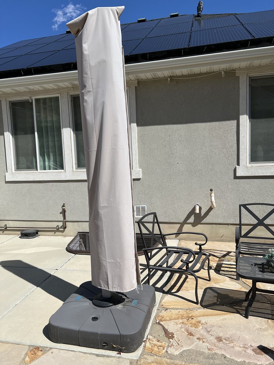 10’X10’ Lg Heavy duty outdoor cantilever Umbrella by Purple Leaf. Lt Grey color. Tilt canopy. 360 degrees rotation. Solar powered light. Cover for when umbrella is closed. Purple Leaf Base Sand/Water filled square 32.2”X32.2”. Excellent condition, like new.