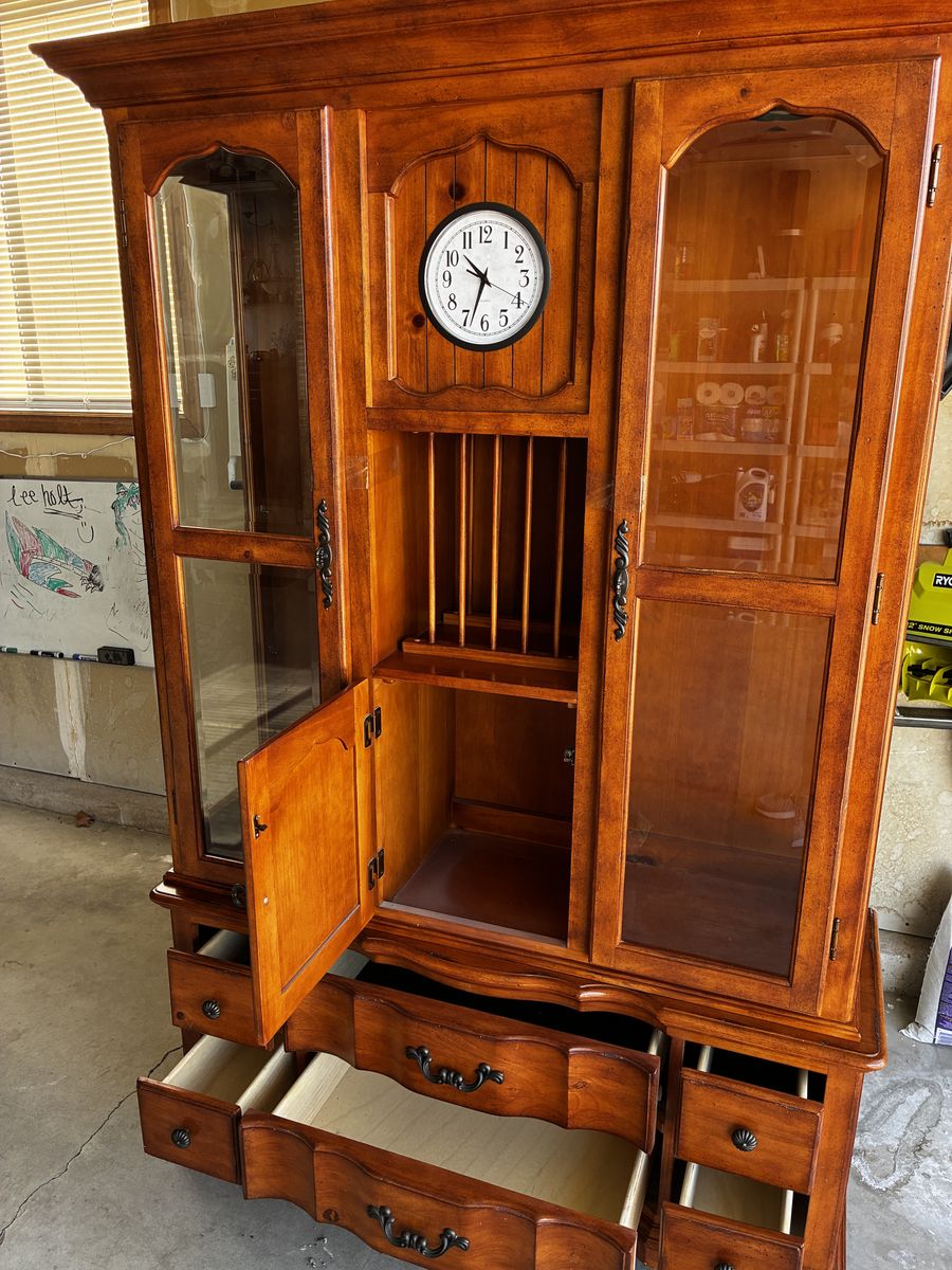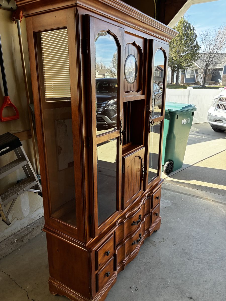 We have a solid wood Curio Hutch for sale that we no longer need. It is approximately 76” tall, 49” wide and 17” deep. The base and top separate. Working clock and accent lights. Has six glass shelves (not shown). Bottom corner needs a little TLC. Asking $175 or best offer. Will not deliver. Cash only.