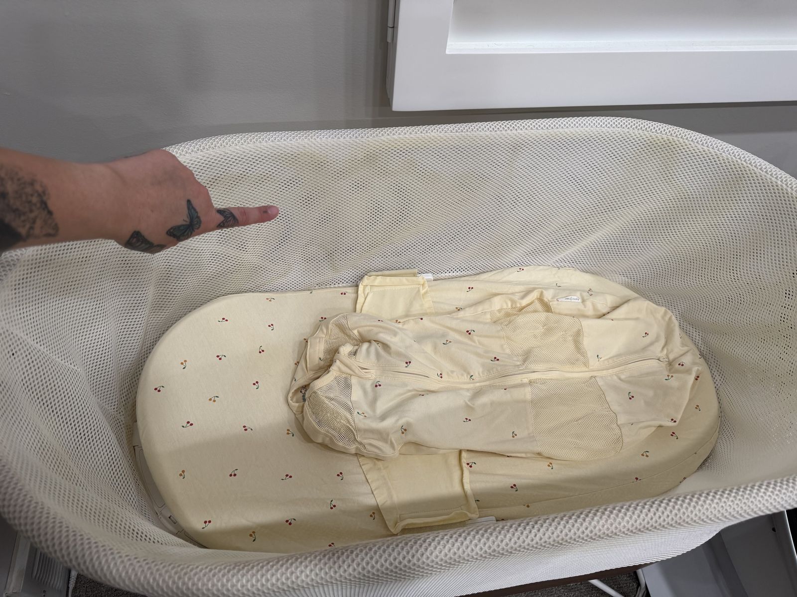 ApplePayUsed snow in good condition needs a good cleaning. Everything works great just a couple of stains about a year old we also have plenty of swaddles in the small and medium and large works amazing