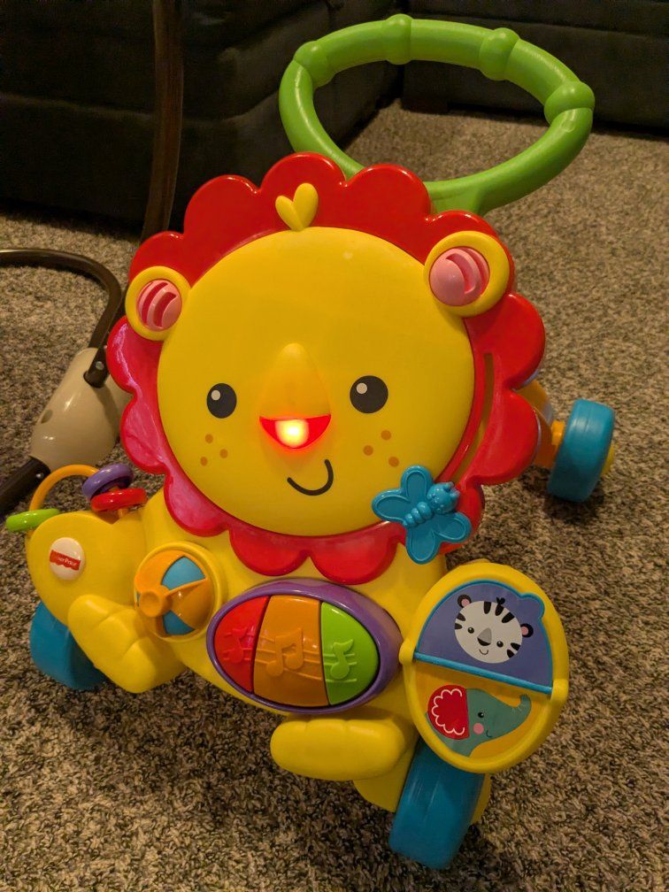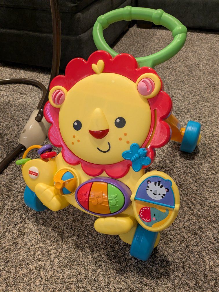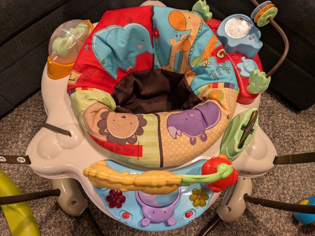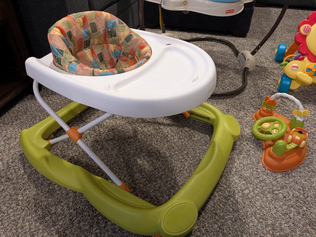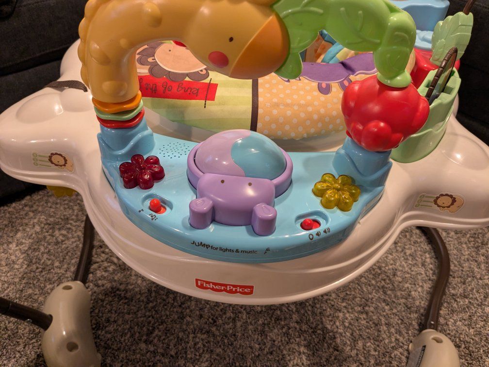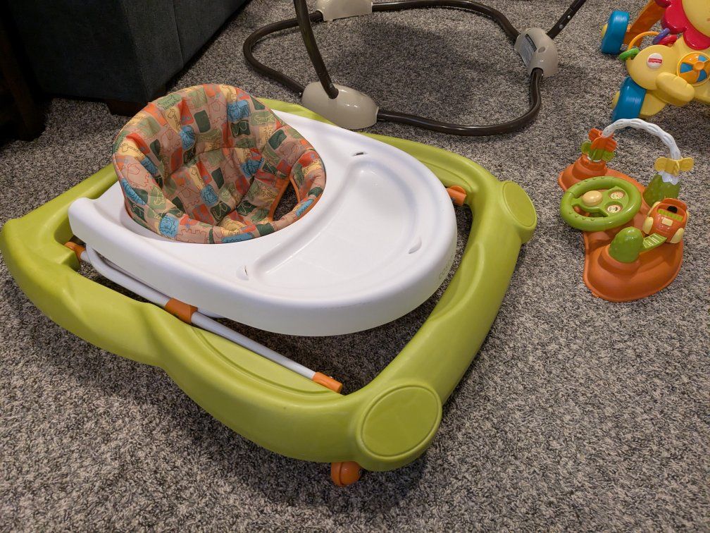 Jumperoo bouncer has lights, music, and cute jungle animal toys. Lion push walker also has music when activated with motion. The seated walker with wheels can be folded down for storage. Has a removable activity tray. All three work great! Comes from a smoke free, pet free home. Cash only please.