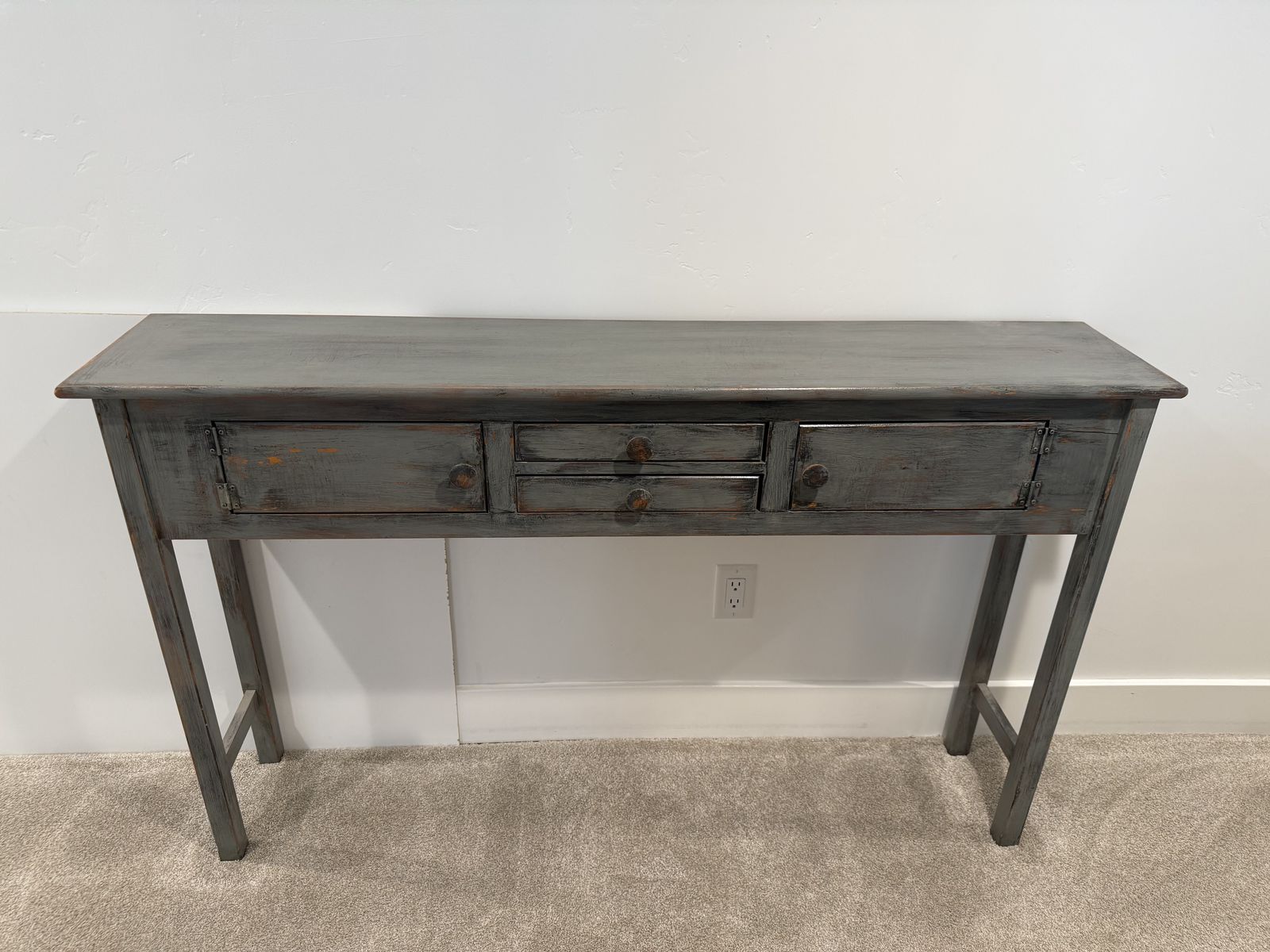 VenmoLight blue console table, been refinished. 11 inches wide, 56 inches long, 34 inches tall