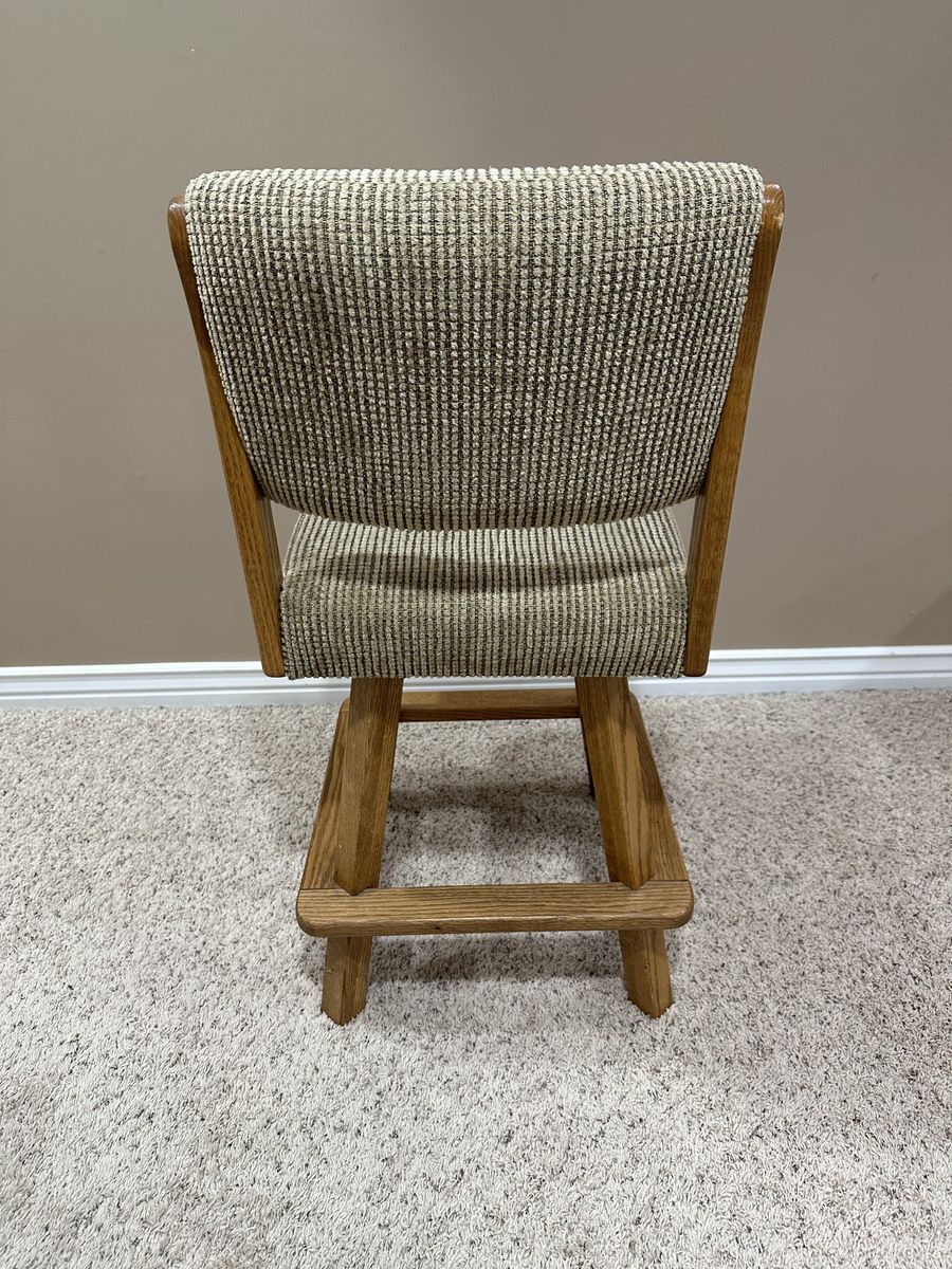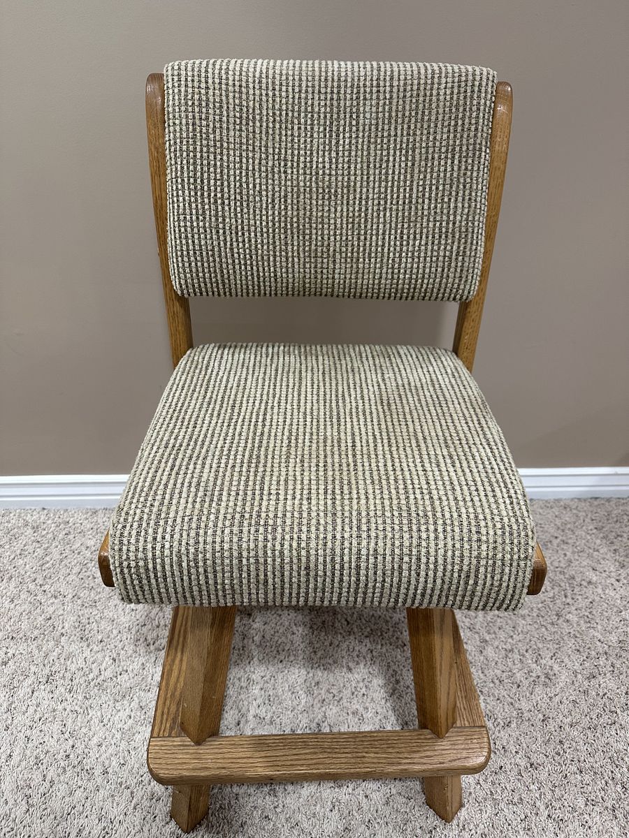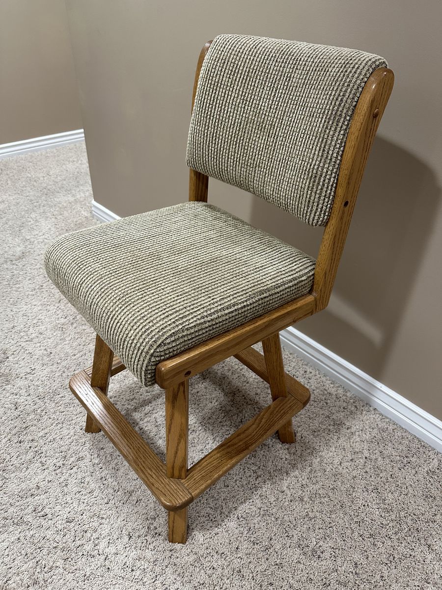Great Condition! Swivels fully around. Sturdy chair. The color is a tan/cream fabric with red/green stitching in between. A little too small for my liking.
