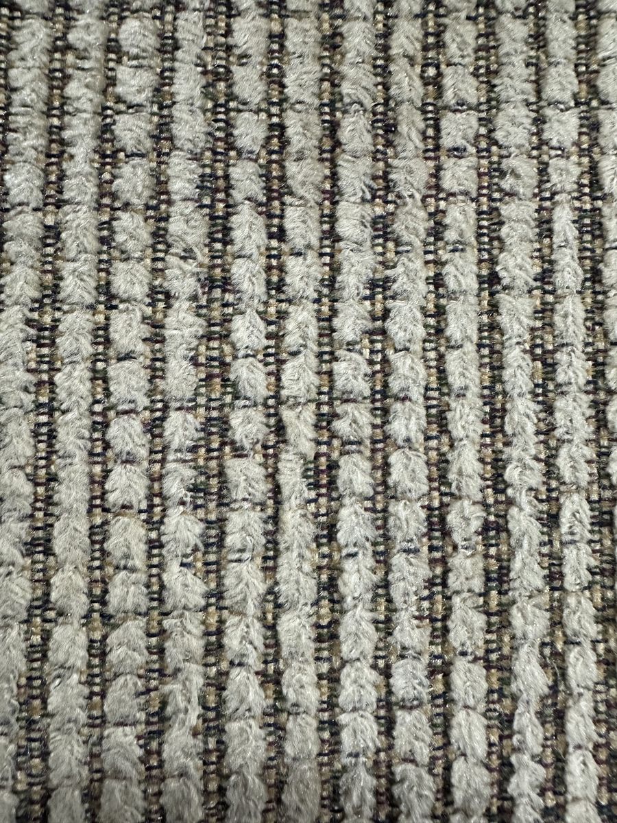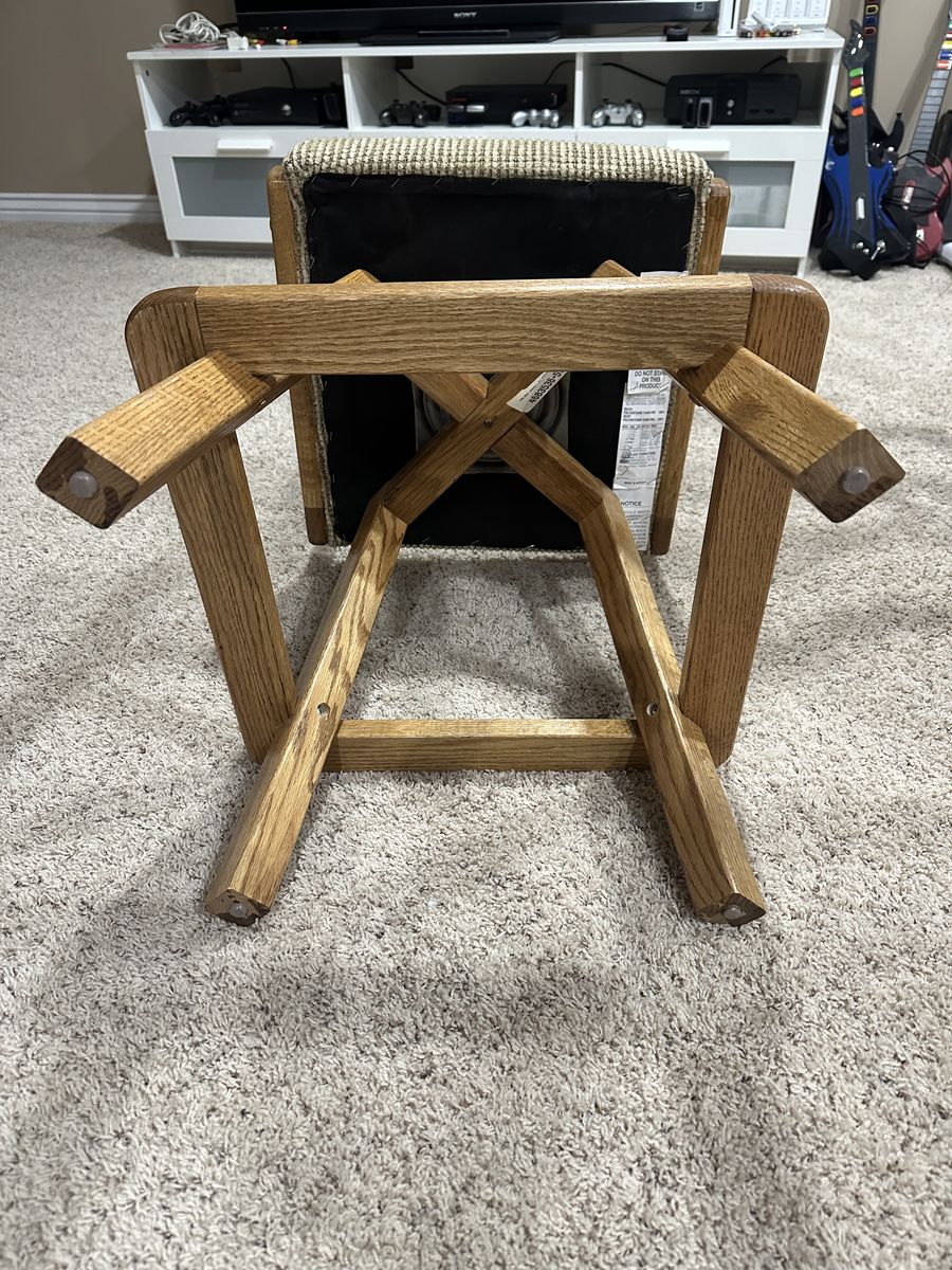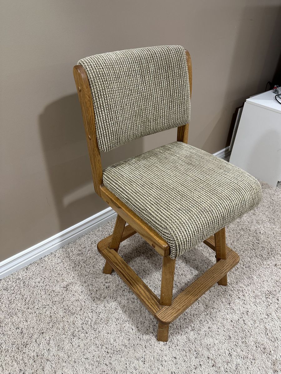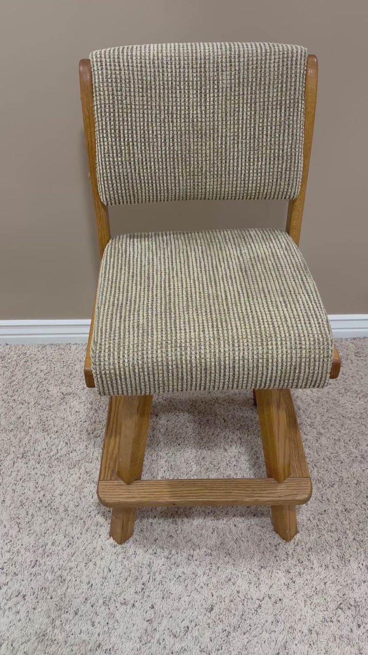 Great Condition! Swivels fully around. Sturdy chair. The color is a tan/cream fabric with red/green stitching in between. A little too small for my liking.
