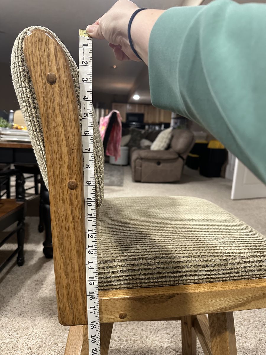 Measurements: Top of Seat to Top of Cushion: about 14 in. Total height of chair: 38.5 in. Depth - back of cushion to front about 24 in. Width - side to side about 20 in. From ground to seat cushion: about 25 in.