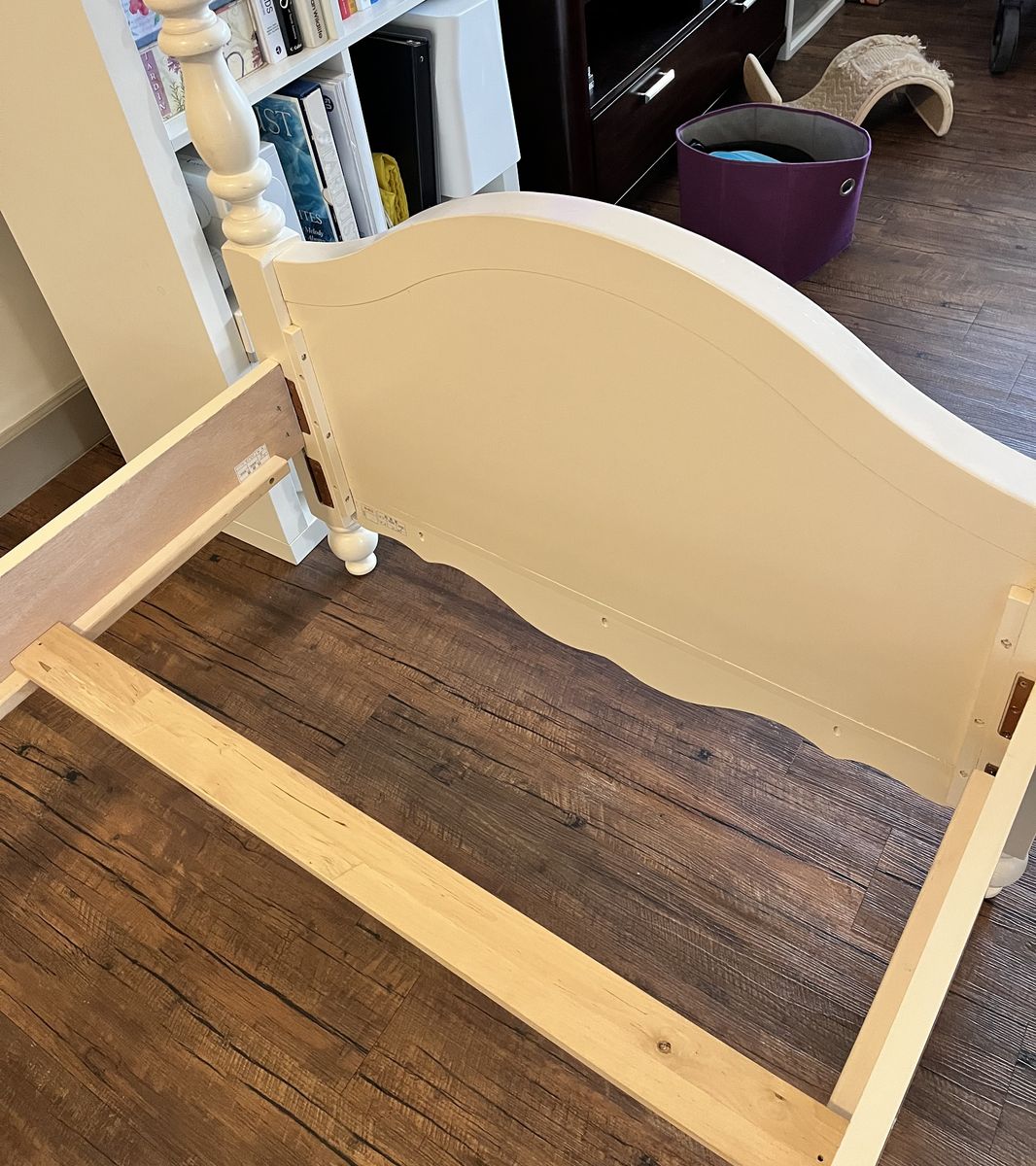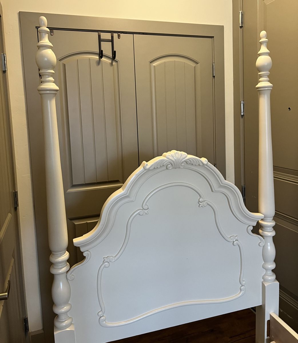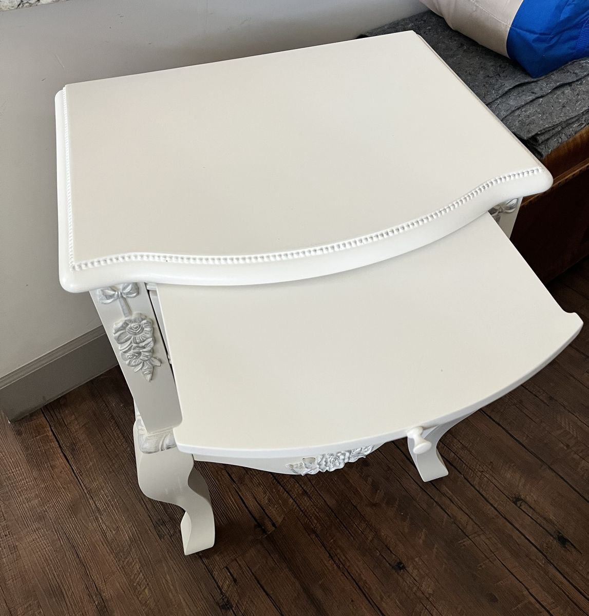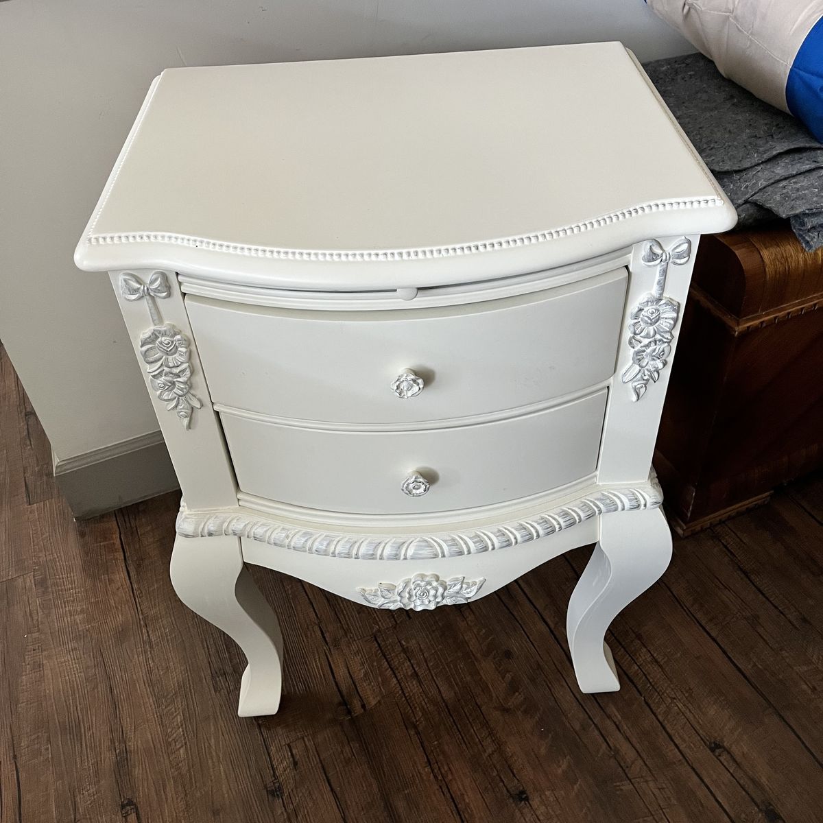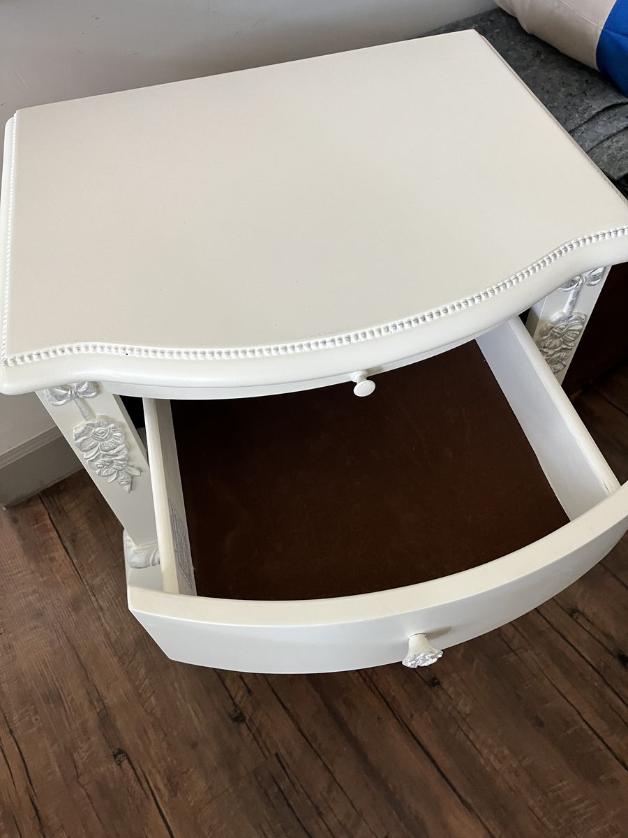 Solid wood bed frame L85" x W44". Leg night stand L22" x W17" x H32".