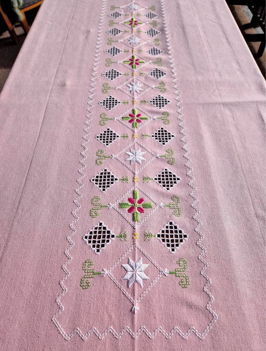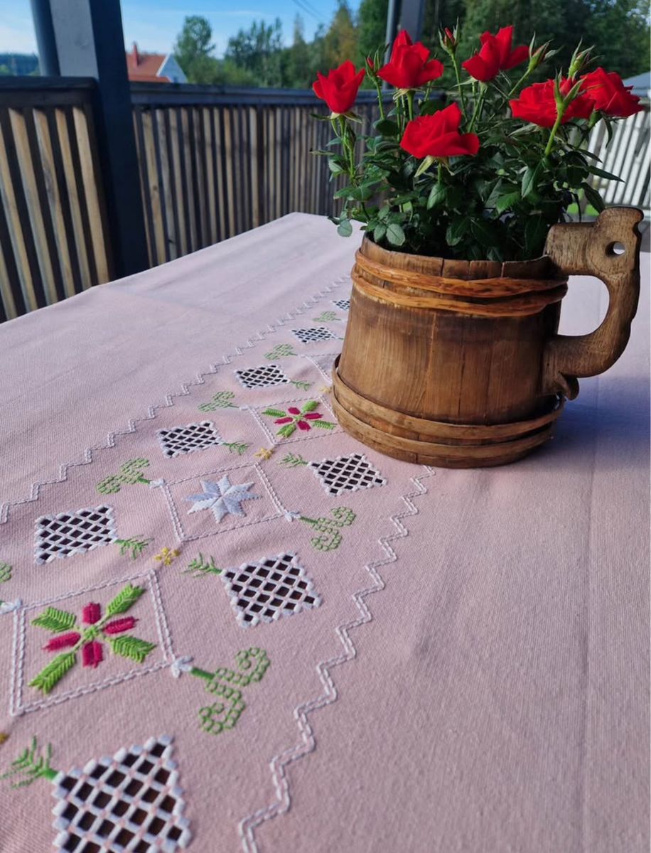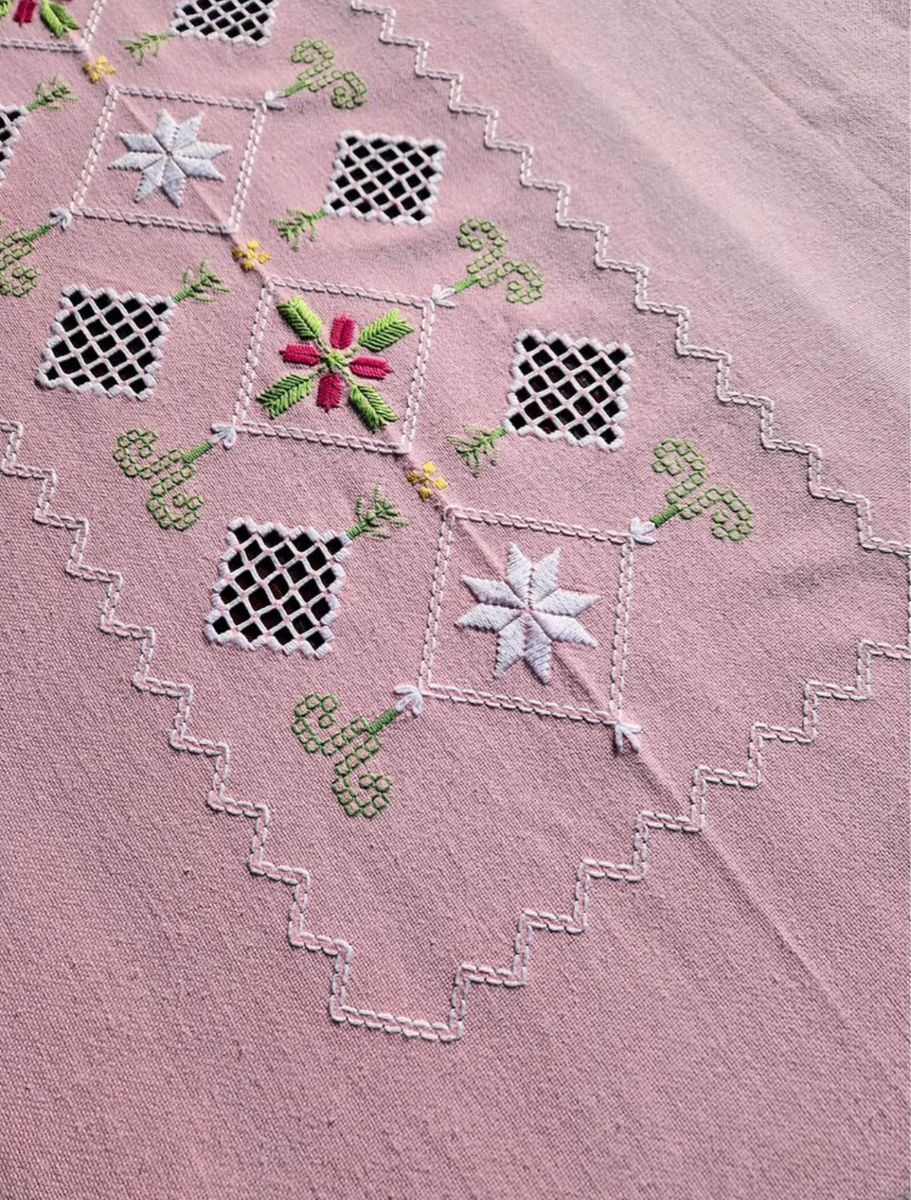 VenmoVintage Norwegian Hardanger embroidered pink table cloth from Norway.