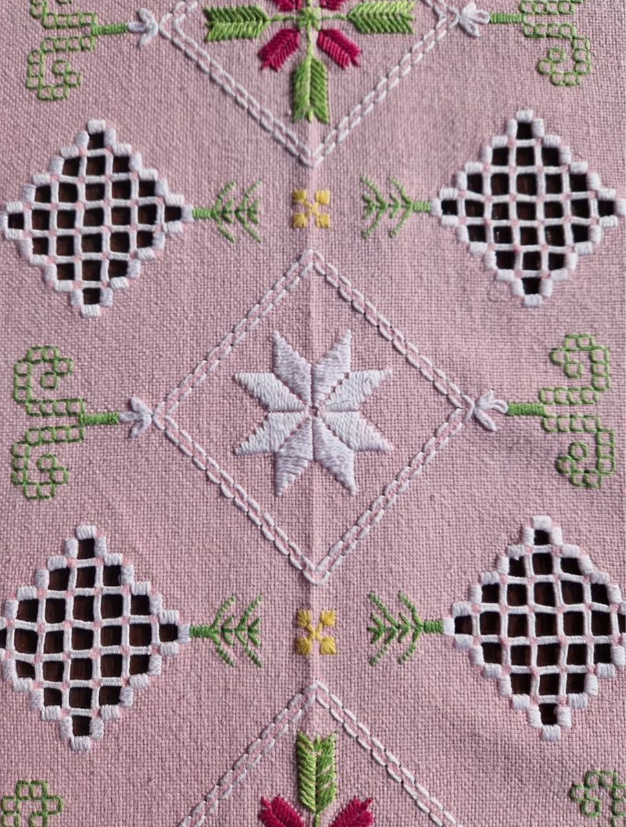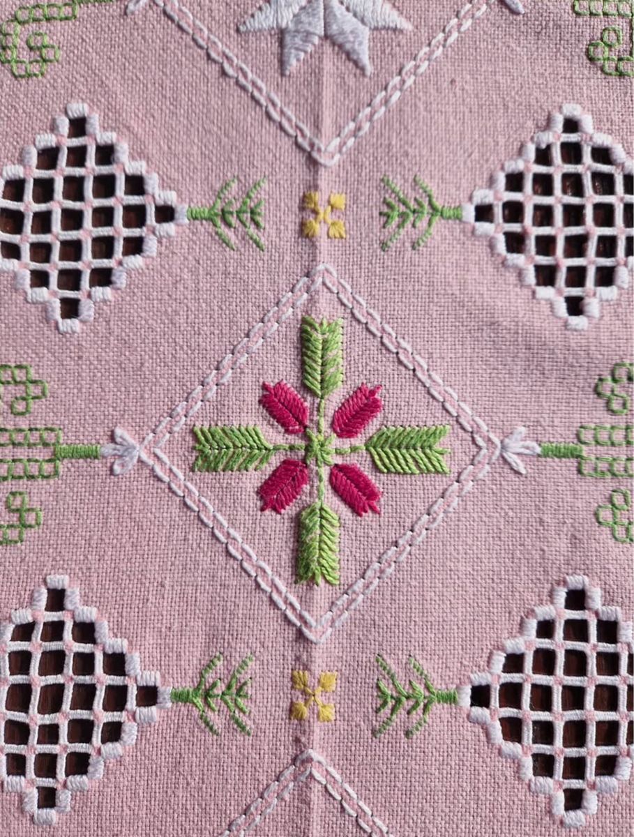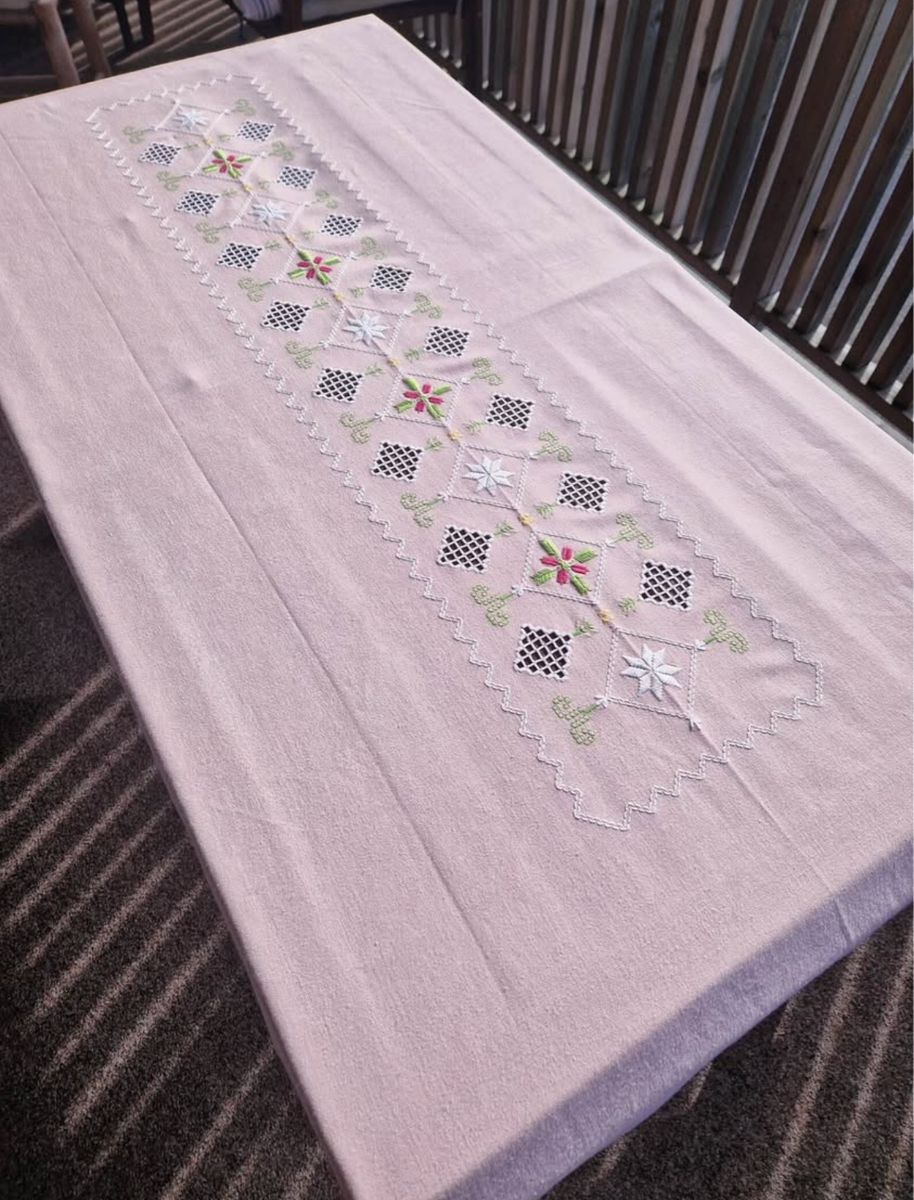 VenmoVintage Norwegian Hardanger embroidered pink table cloth from Norway.