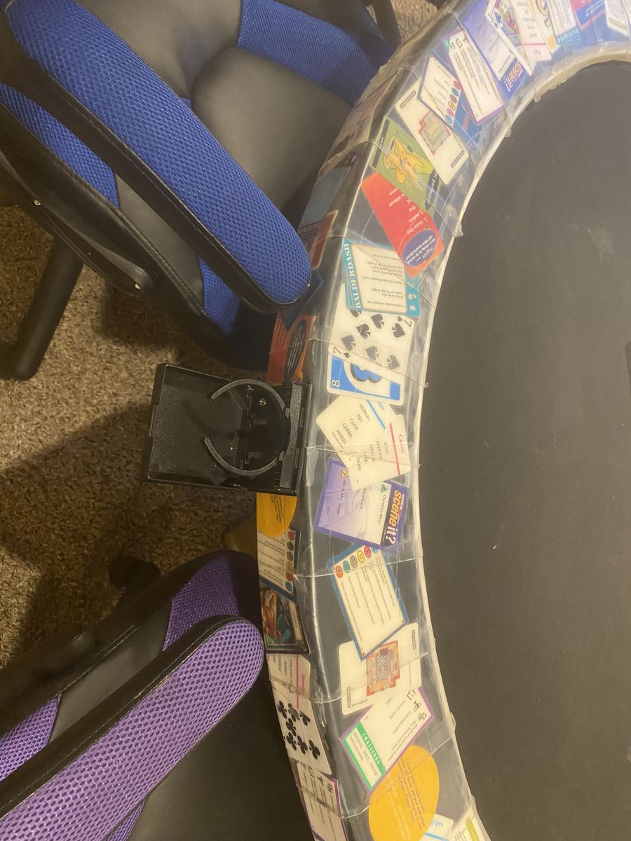 ApplePayCustom made with game cards. Cup holders for each seat. LED lights around the speed cloth - the fabric used on poker tables. Originally over $3,000.