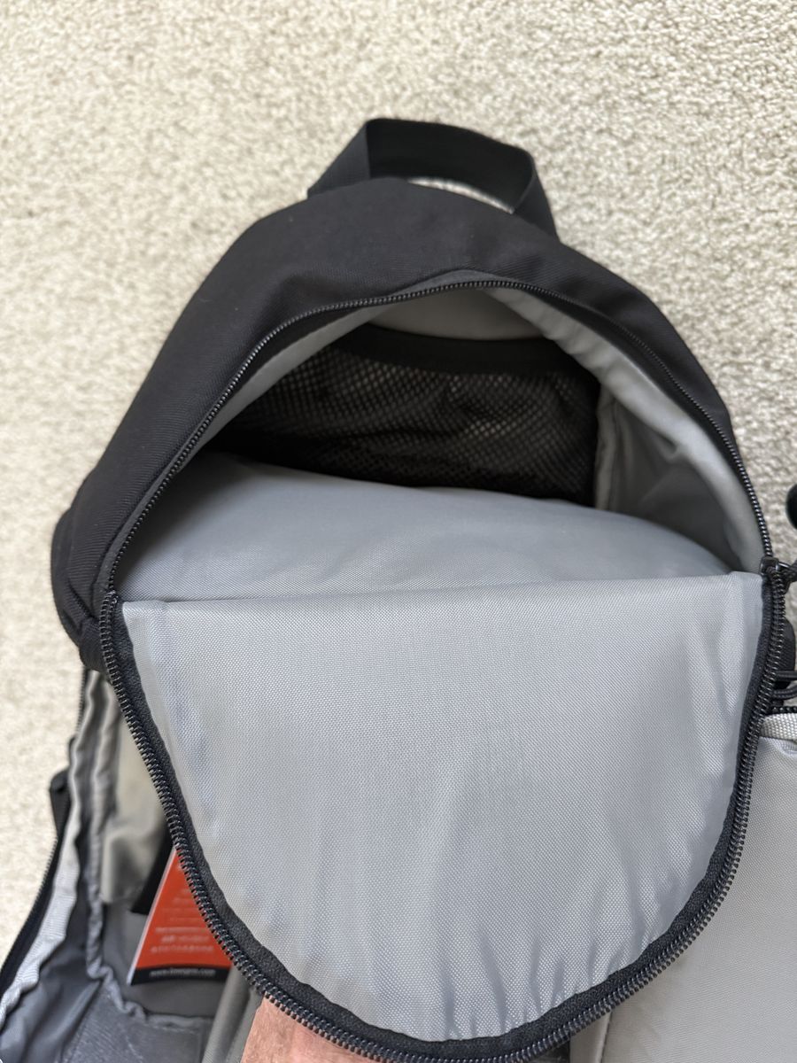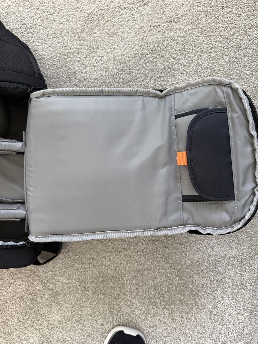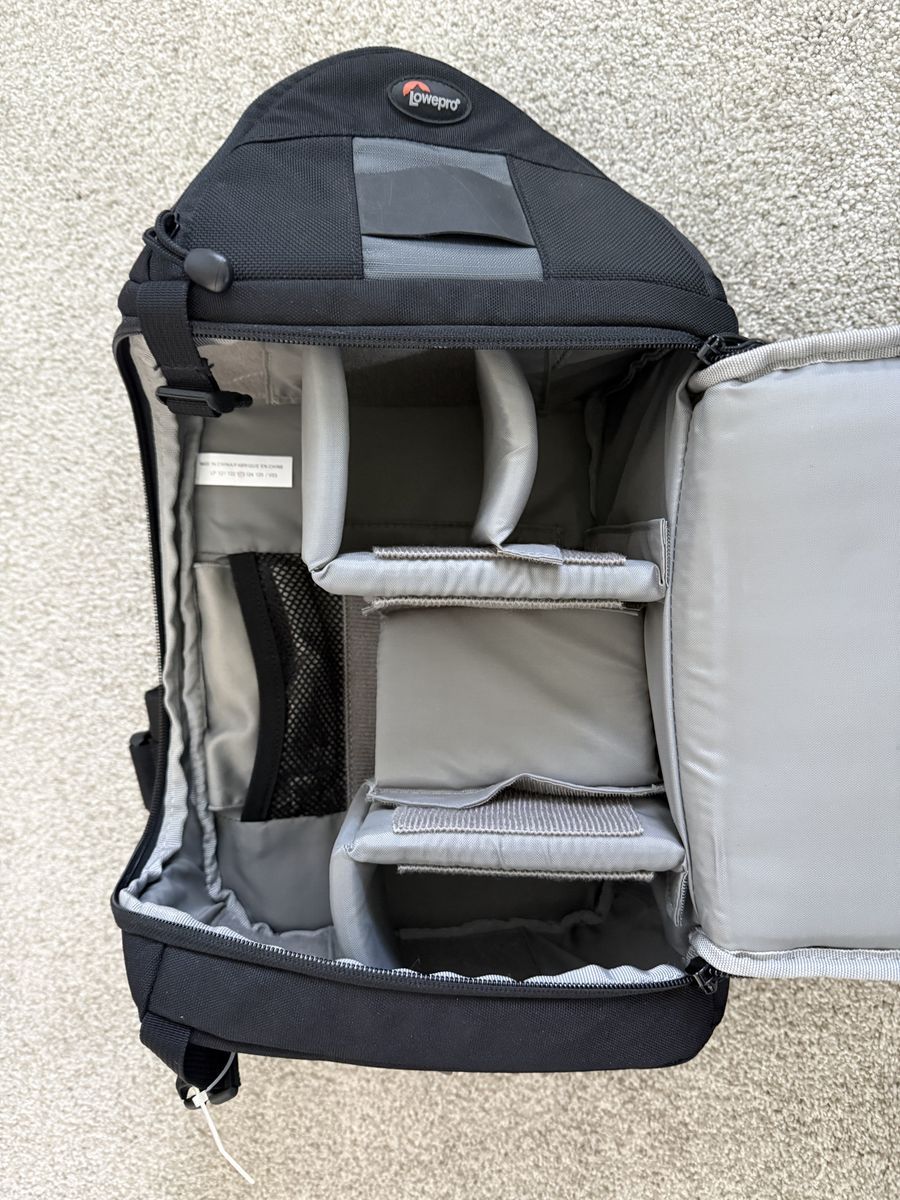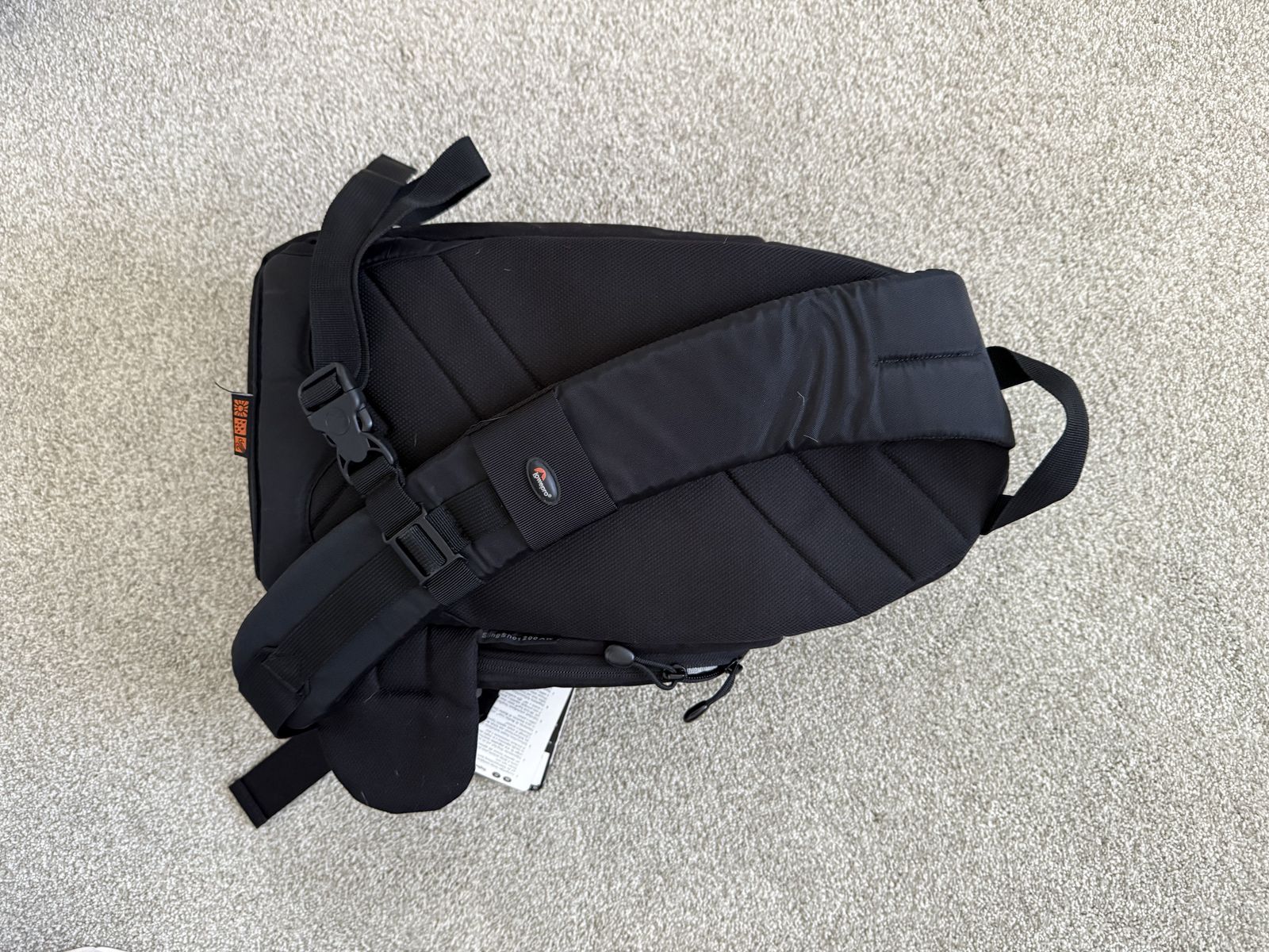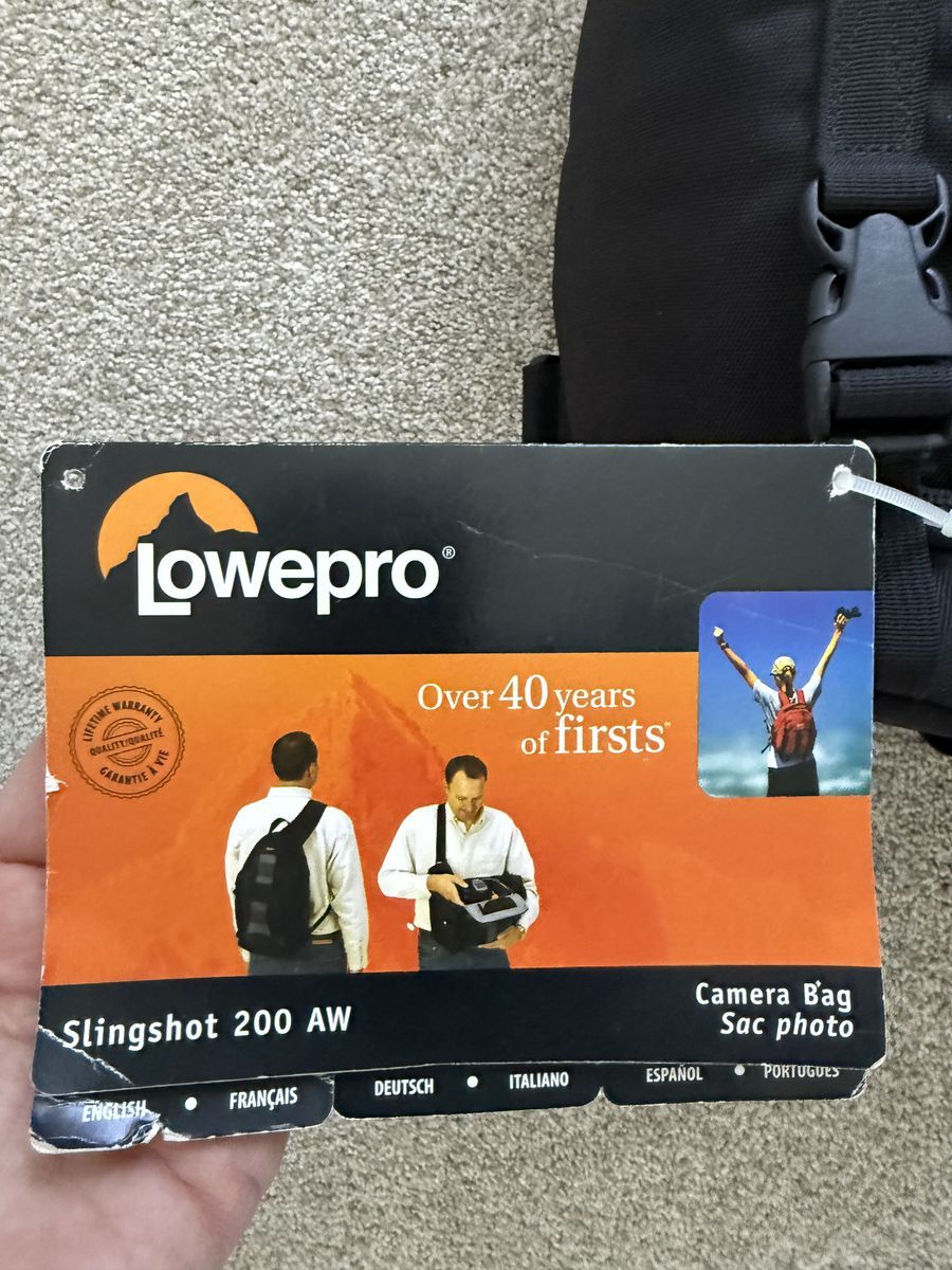 Lowepro Slingshot 200 AW, excellent condition, black, easy access to pack without taking it off, room for several lenses and a body, has a rain cover, a place to store memory cards and batteries, top has room for more gear or lunch and has loops for strapping on additional gear.