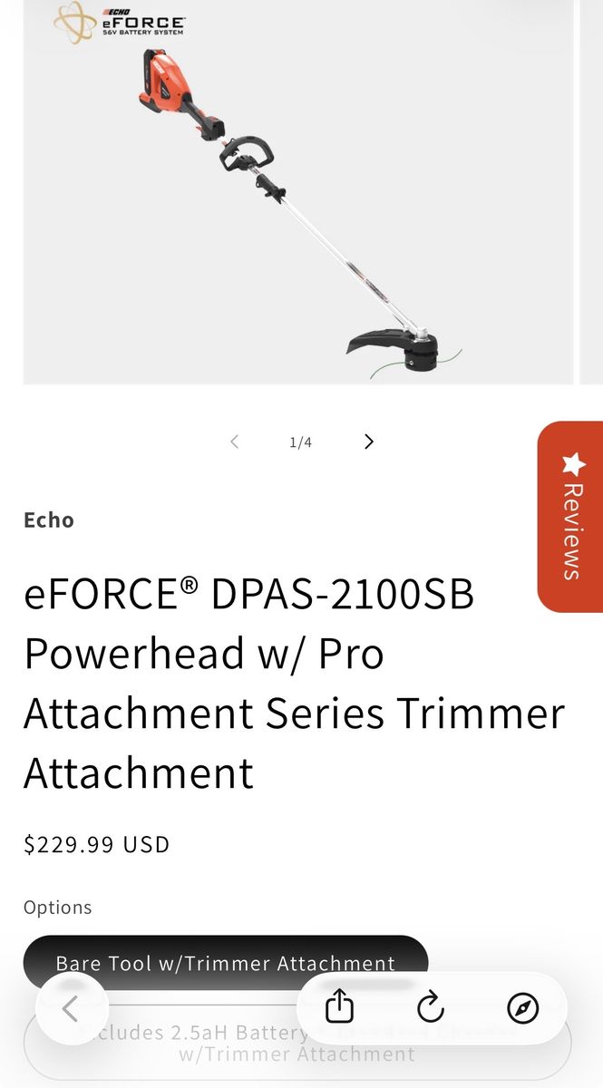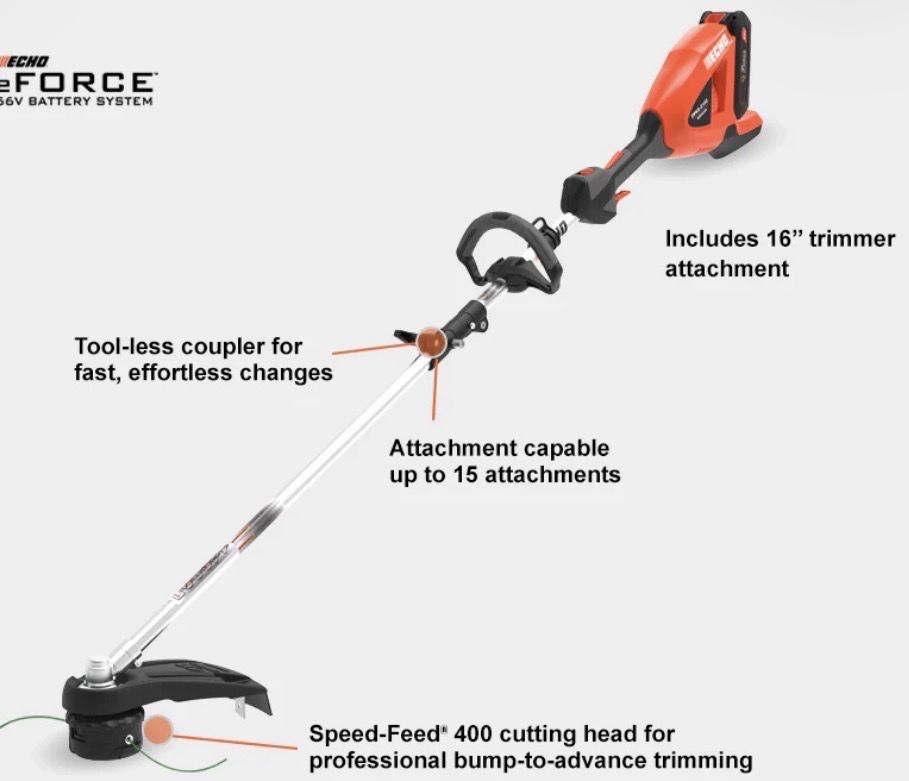 Powerful Echo eFORCE 56V battery system powerhead. Does NOT include the battery DPAS-2100SB model with Pro Attachment Series trimmer attachment. Includes 16" trimmer attachment. Tool-less coupler for fast, effortless changes. Compatible with up to 15 attachments. Features Speed-Feed 400 cutting head for professional bump-to-advance trimming.