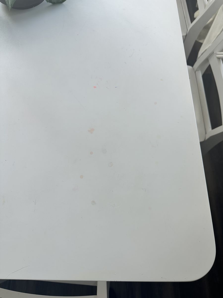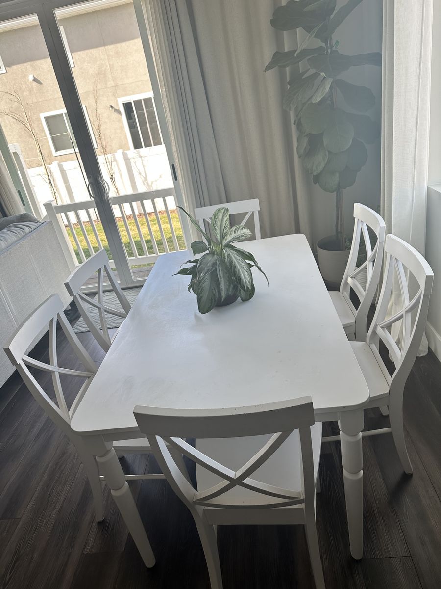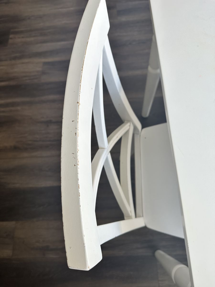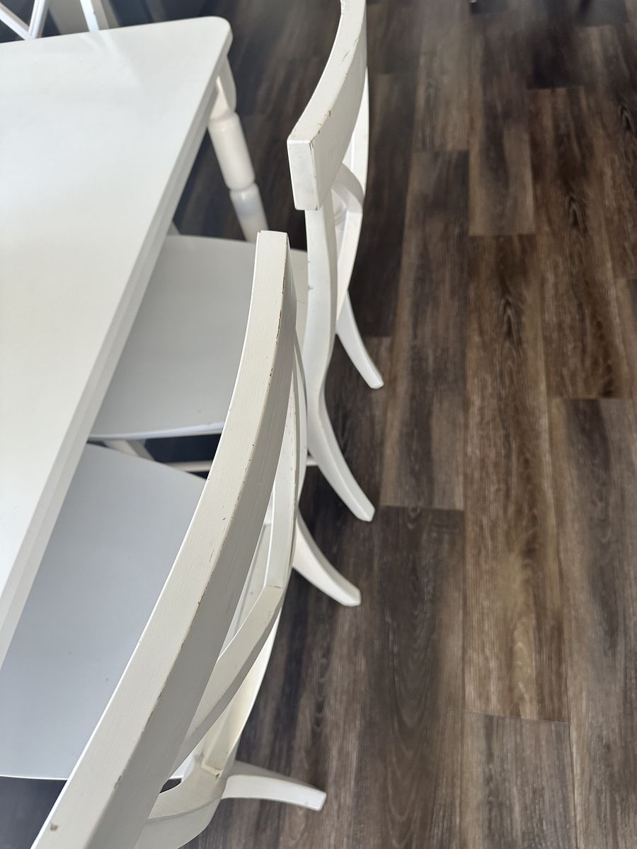 ZelleWhite dining table with 6 chairs. Has a few stains on the table as well as some scuffs on the chairs, but sturdy.