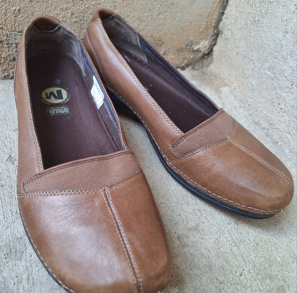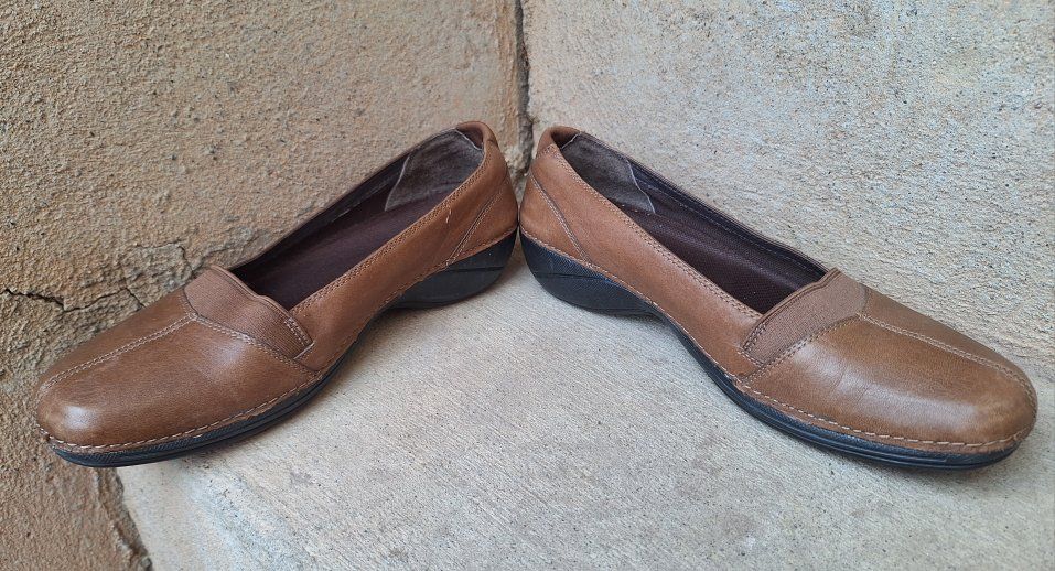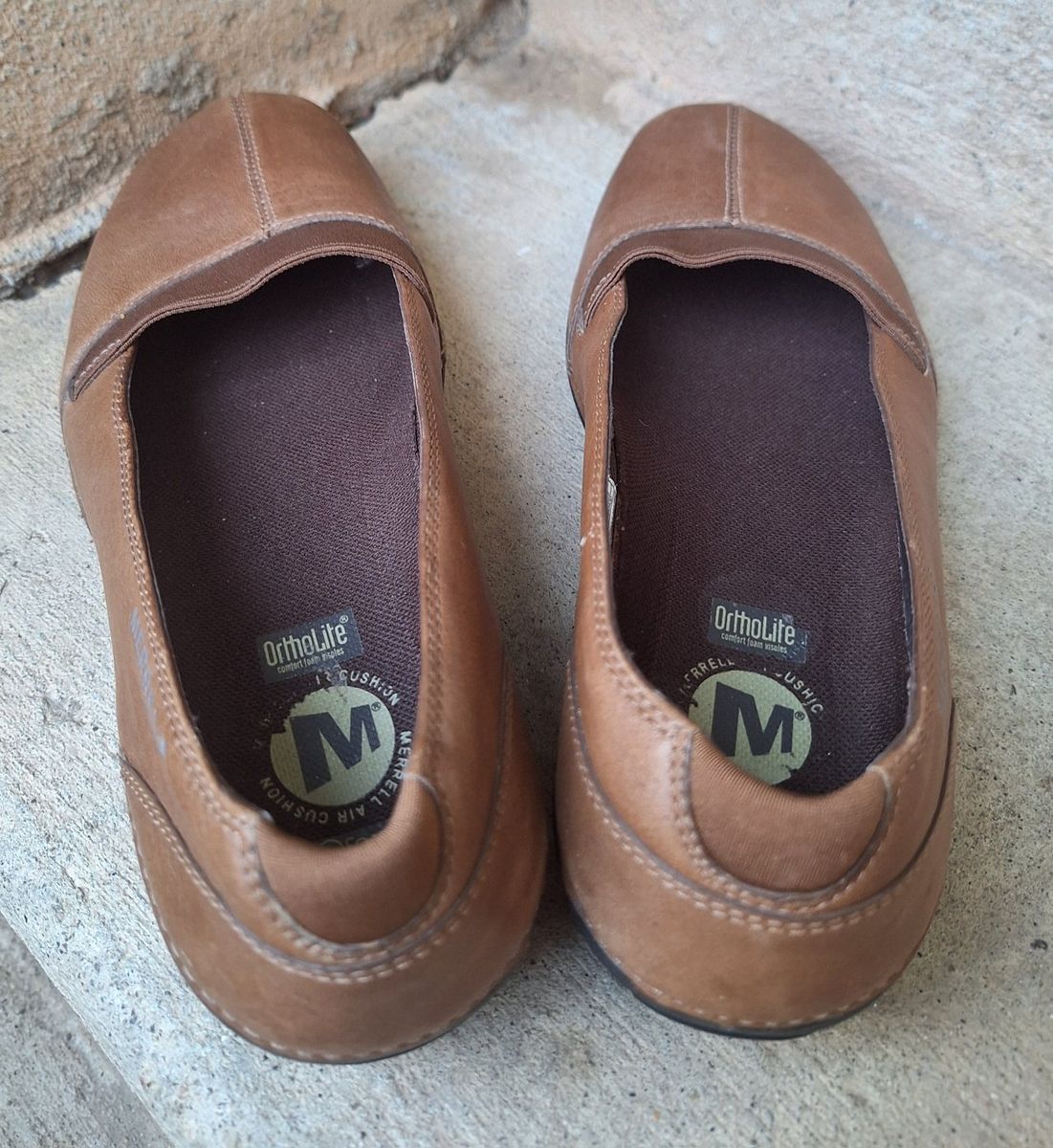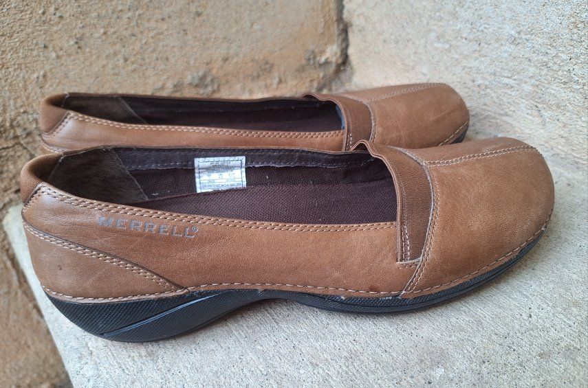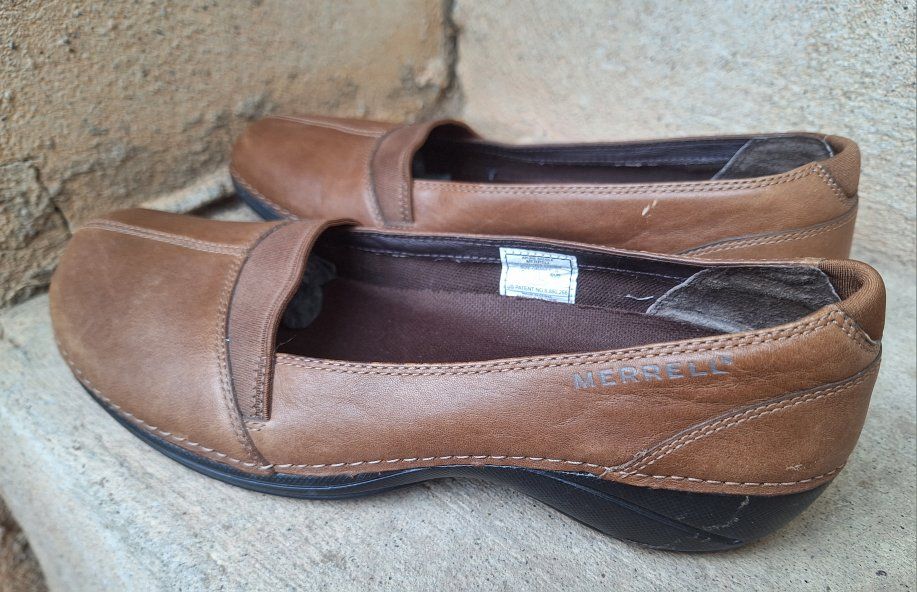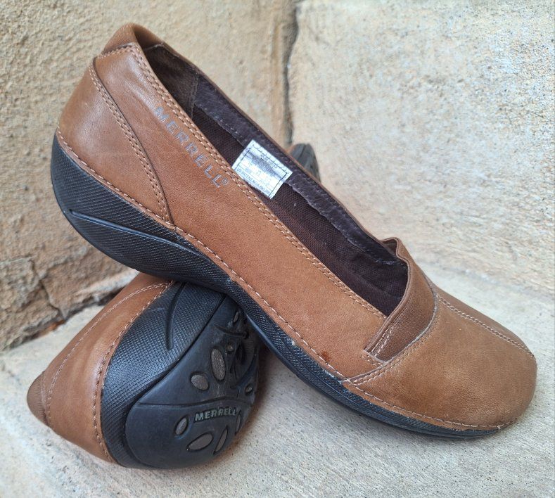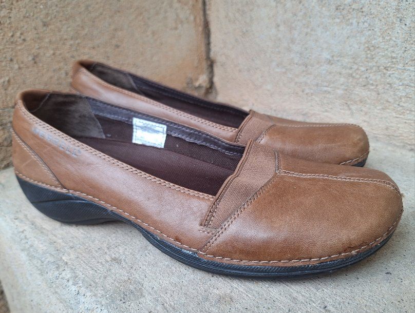 CashAppExcellent Merrell Apure brown leather slip-on shoes! Size is US-7. are a stylish and comfortable option for women. Comes from a clean smoke and pet free environment. Please see photos for closer details, thanks for looking!