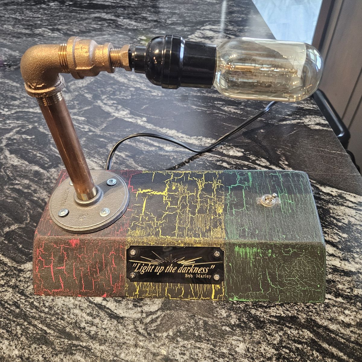 Real pipe construction Warm vintage Edison bulb Bob Marley “Light up the darkness” plate One-of-a-kind piece
