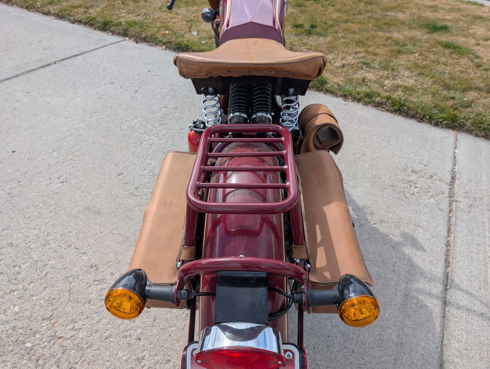 Chrome handle bar Bar end weights for stability Leather/plexi windshieldBook rack Dual leather saddle bags Leather tool pouch Fuel bottle holder Custom paint and hand painted pinstripes Also included is the passenger seat bracket and leather seat pad (replaces the book rack). This model has the dual clocks (rpm / speedometer) common for a more retro look. Janus has since gone to a single unit which I don't think looks as good.