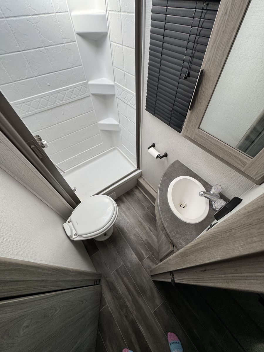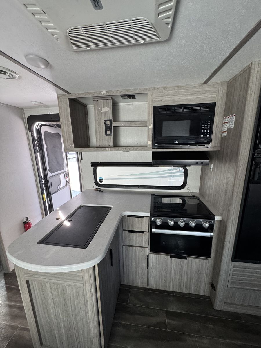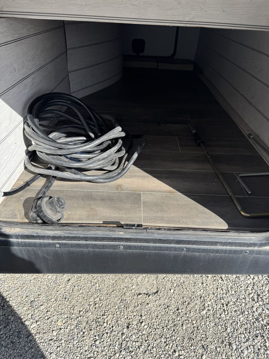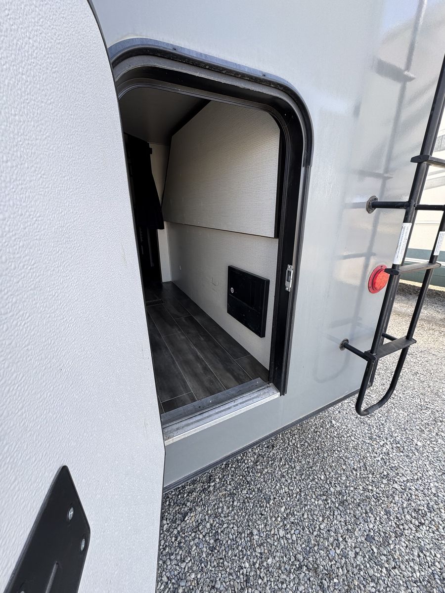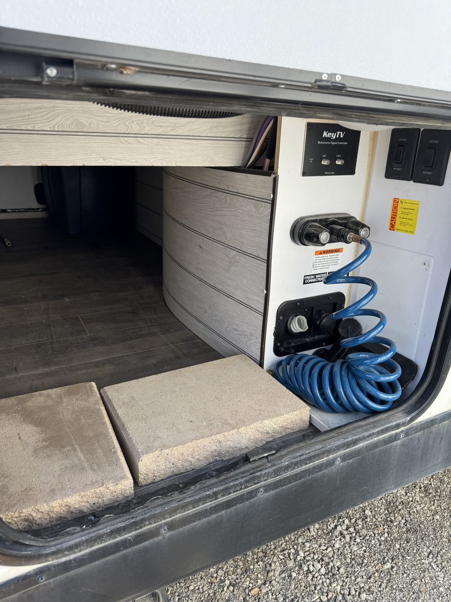 All electronics and plumbing work great! New bathroom hardware. Large awning, outdoor kitchen, and sound system for the summertime. Power jacks and stabilizers make for an easy setup and take down. Large grey, black, and fresh water tanks to minimize emptying/filling trips. Slots for two batteries and two propane tanks. Tons of storage space and a convenient rear entry door.