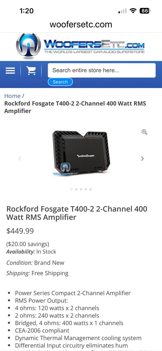 CashAppRockford Fosgate T400/2. 2 channel amplifier if you need something with royal base something that lasts a long time this is what you go with if anybody knows anything about Rockford Fosgate they last forever and they never disappoint. $200. You’re saving yourself $300 this cost 449 with tax it’s over $500 for the amplifier. It’s only two months old.