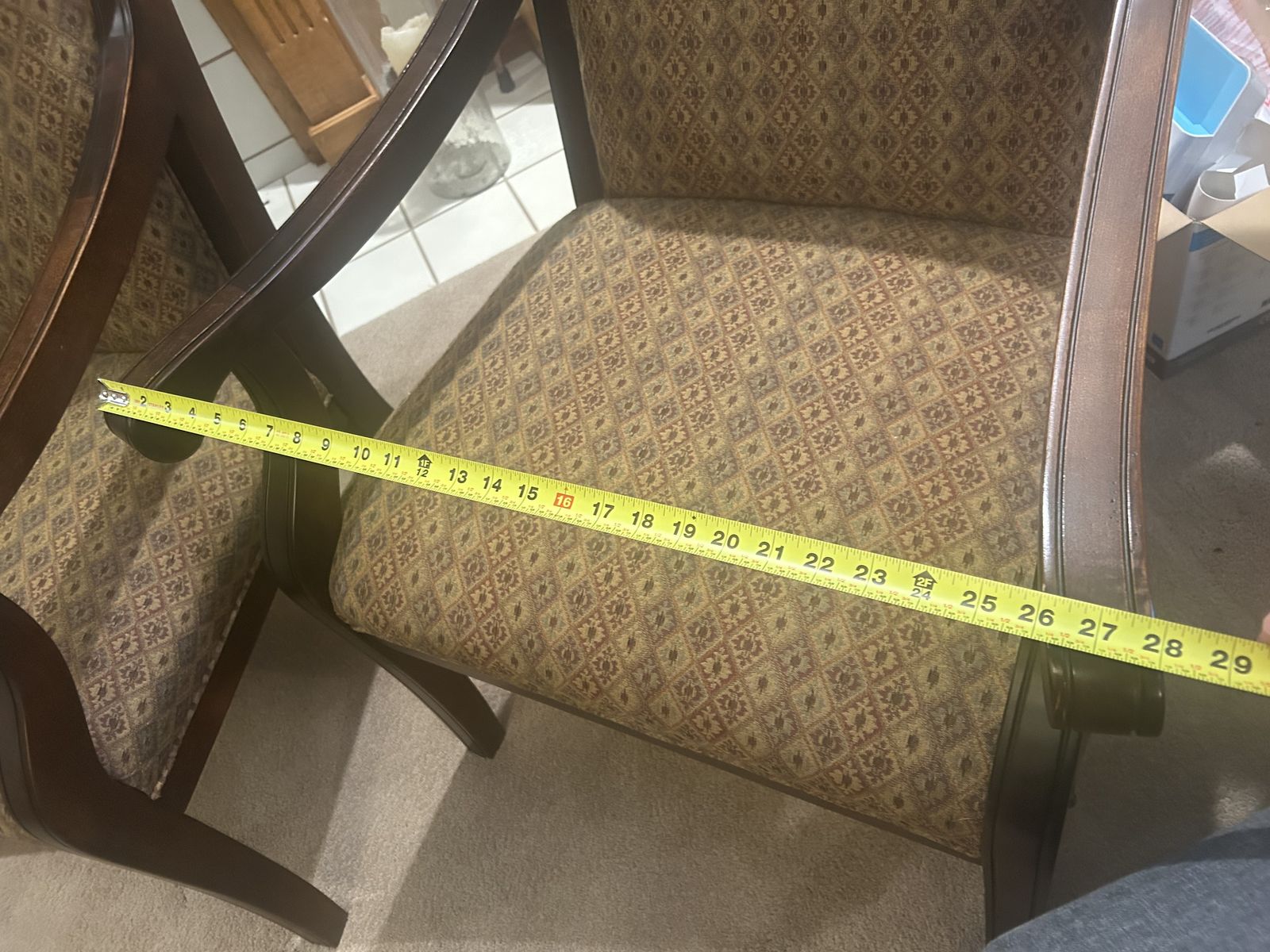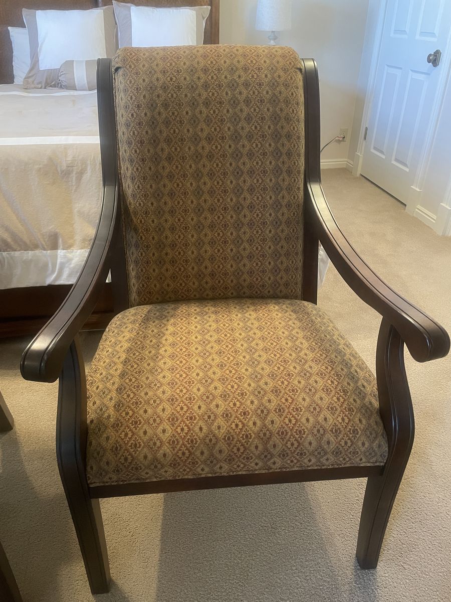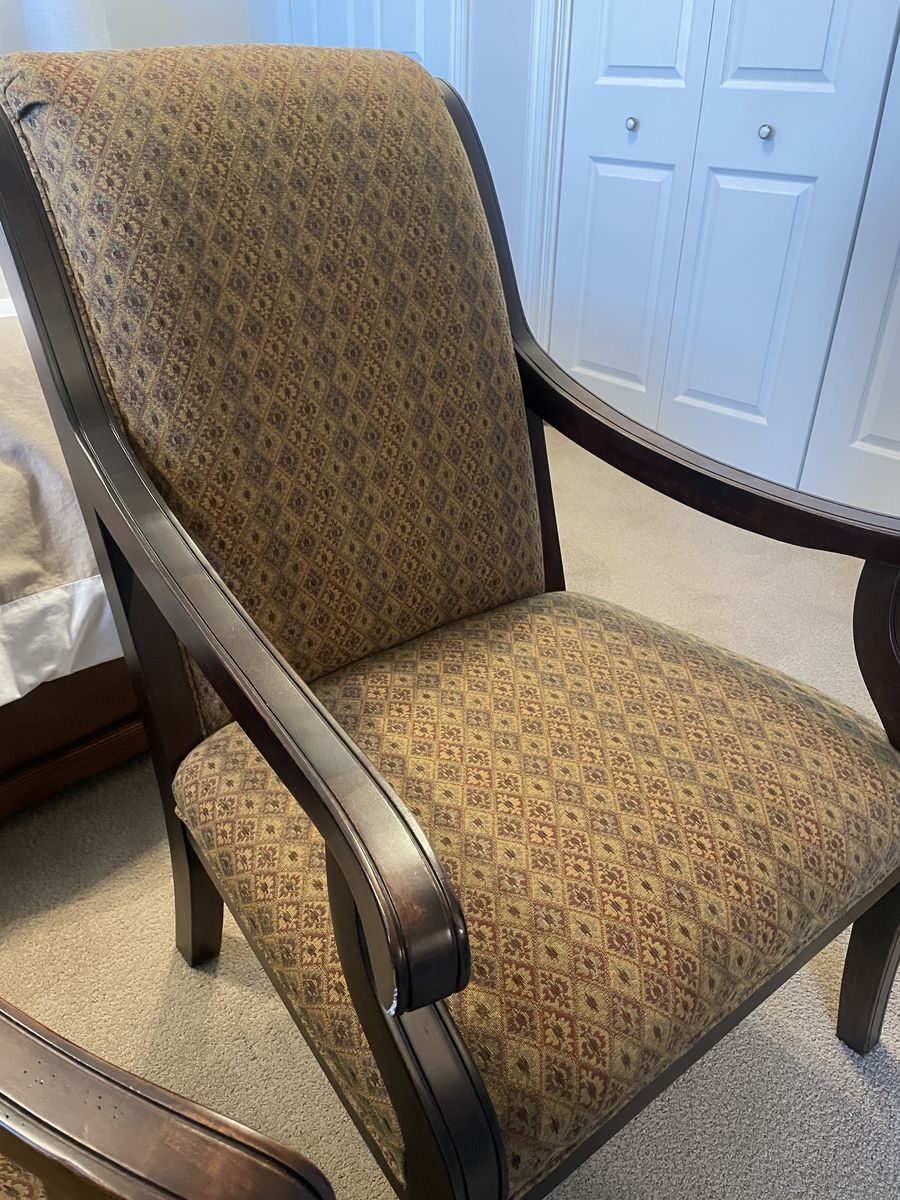 For sale: Matching pair of authentic Fairfield Chair Company formal armchairs, purchased new in 2004. These high-quality, American-made pieces feature solid dark wood frames with elegant curved arms, high backs, and straight legs. Upholstered in a beautiful woven fabric with a repeating diamond/floral pattern in neutral brown/beige/gold tones—timeless and versatile for any room. Dimensions Approx. 41–42”H x 28-30” W 27–30” Condition: Excellent vintage condition—no stains, rips, or major wear