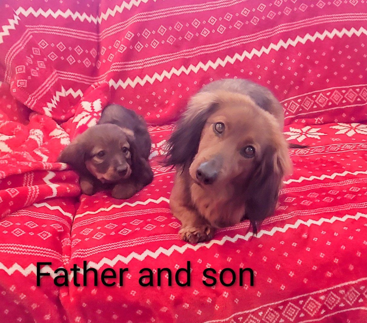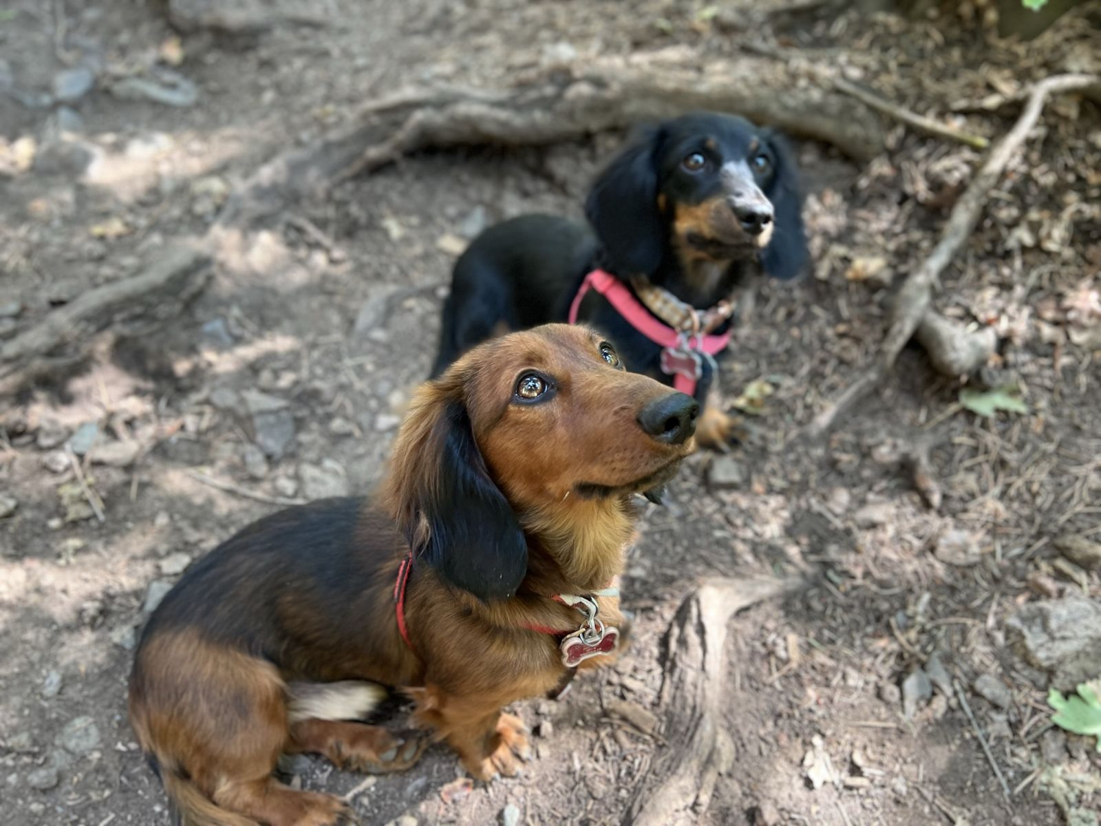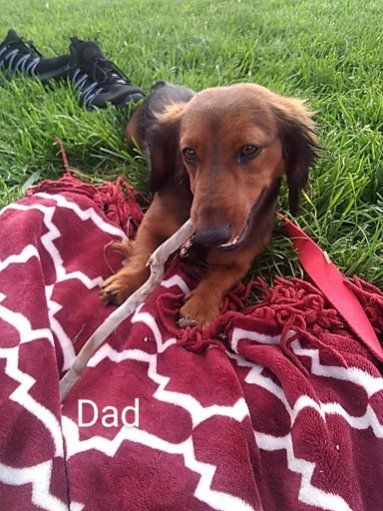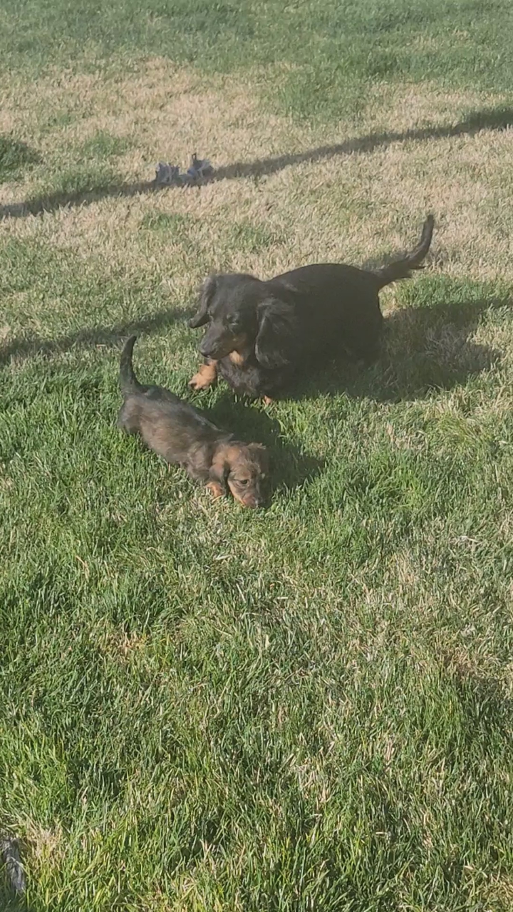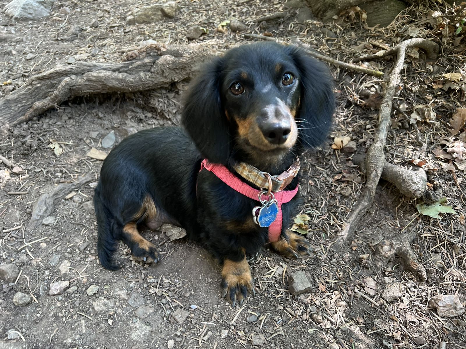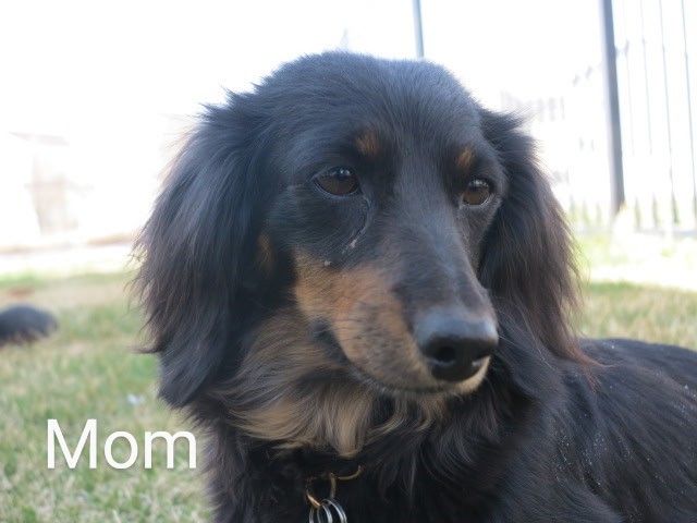 Mom is a long-haired black and tan, 12 lbs and full of energy. She loves to dig for treasures and tell you how she feels, give you sass or the biggest pout. She has a stubborn and free spirit. However, she is oddly very obedient and will stay nearby. She knows all her tricks very well and loves to play “Keep Away”. She loves long hikes so she can explore and conquer the trail. Especially on her way back, she loves to run down the trail as fast as she can, but will stop and wait if she can’t hear, see or smell you. She is driven by food and attention, if another dog is on your lap, she will find a way to fit too. She does not like bodies of water or baths! She is reluctant and sometimes will hide from the bath, but once she’s there, she is obedient until she can run wild and free again.