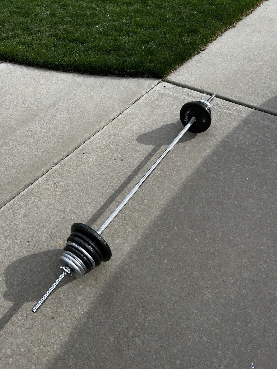 Selling 80 Pounds of Plate Weights Plus 5 Pound Bar for total weight of 85 pounds. Selling all of it for $60.