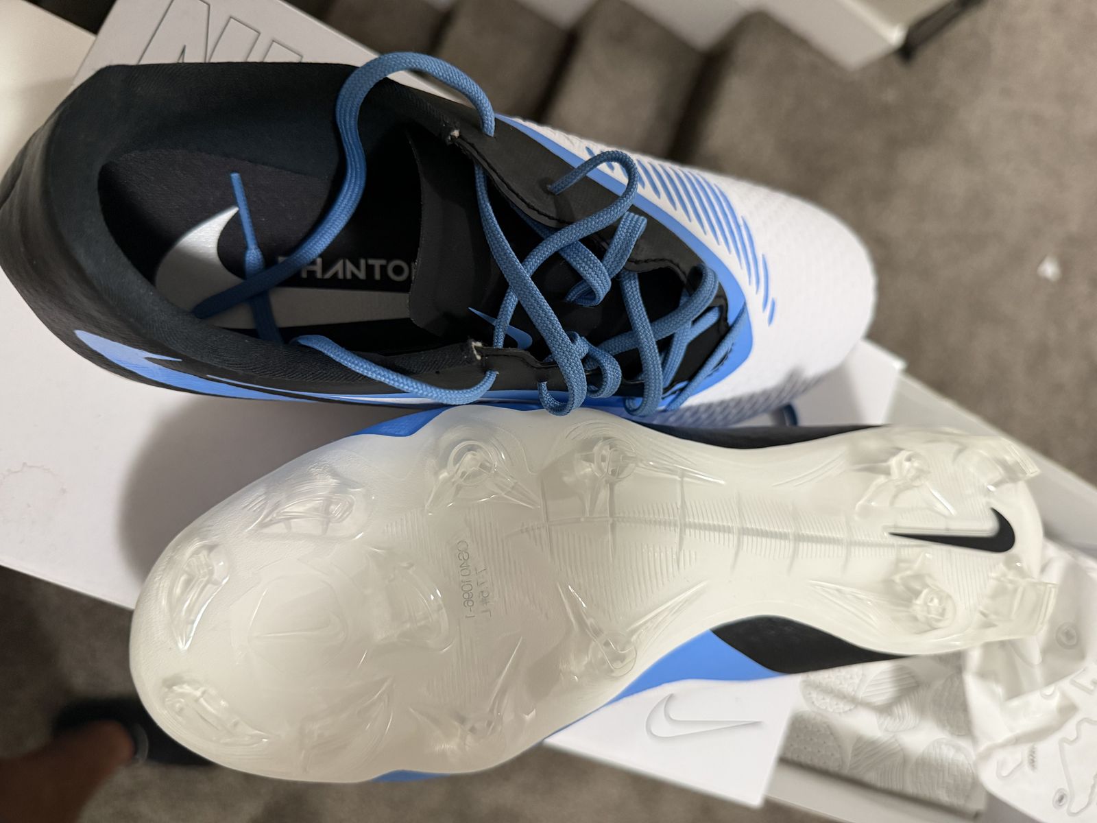 VenmoStart your spring season with these custom Nike Phantom 6 Low Academy cleats—built for precision, control, and speed. These were custom ordered but never worn because they were too small. Custom colors and design. There are two custom markings…a black 14 and black initials EM. Both are nearly impossible to see.