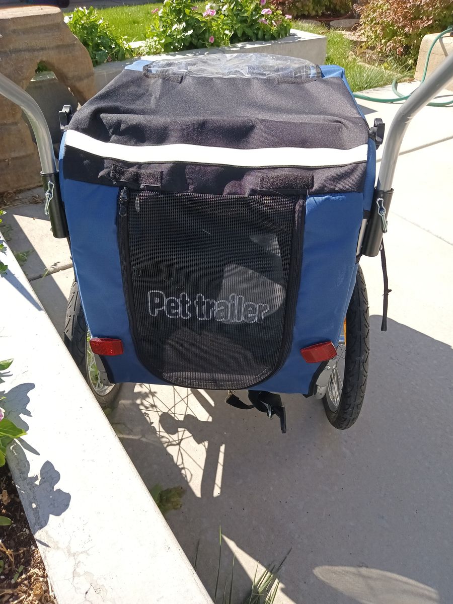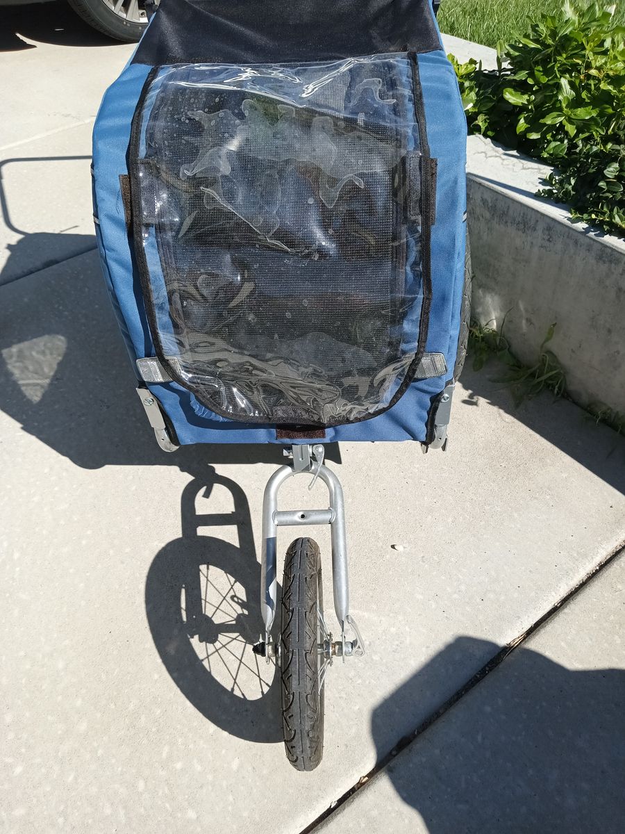 Base is 19inches tall 17.5 inches wide 26 inches long. Big inflatable wheels that go easy over sidewalks. Reflectors on back. And make it easy to jog if you like. I used to put two chihuahuas in to ride. Has a rain cover. Zipper in good shape. Always was stored inside bedroom. Quality stroller in good shape. Cash only. Text only. Porch pickup in East Layton.