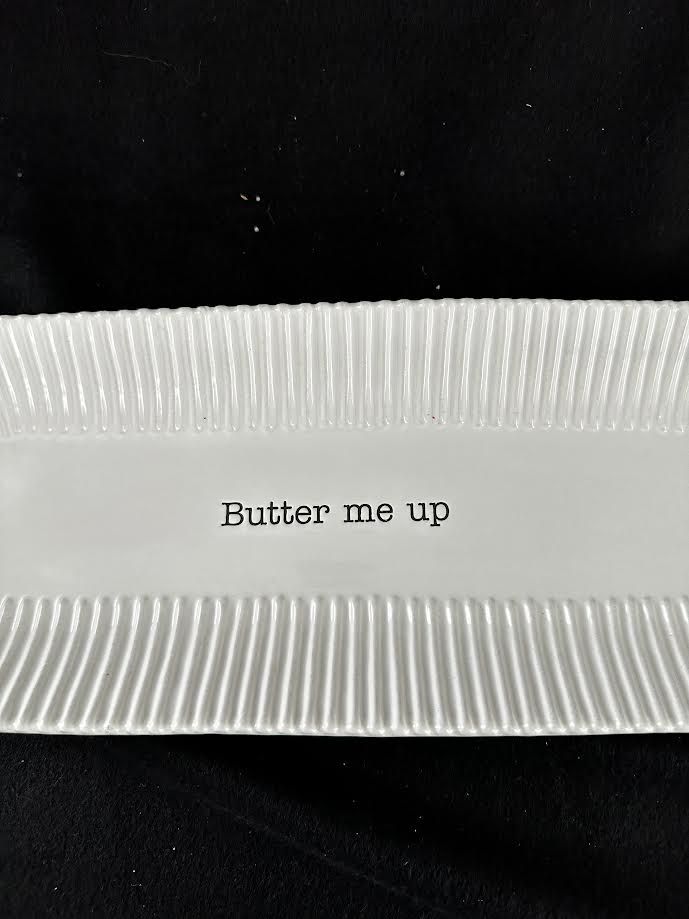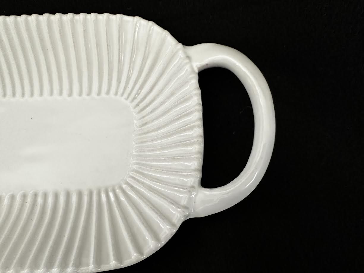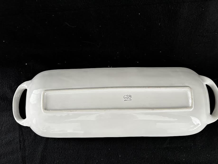 VenmoMud Pie “Butter Me Up” ceramic white bread/rolls platter with handles. Pleated pattern. Measures 15” L x 5.5” W x 1.5” H. Weight 2 lbs. Excellent like new condition.