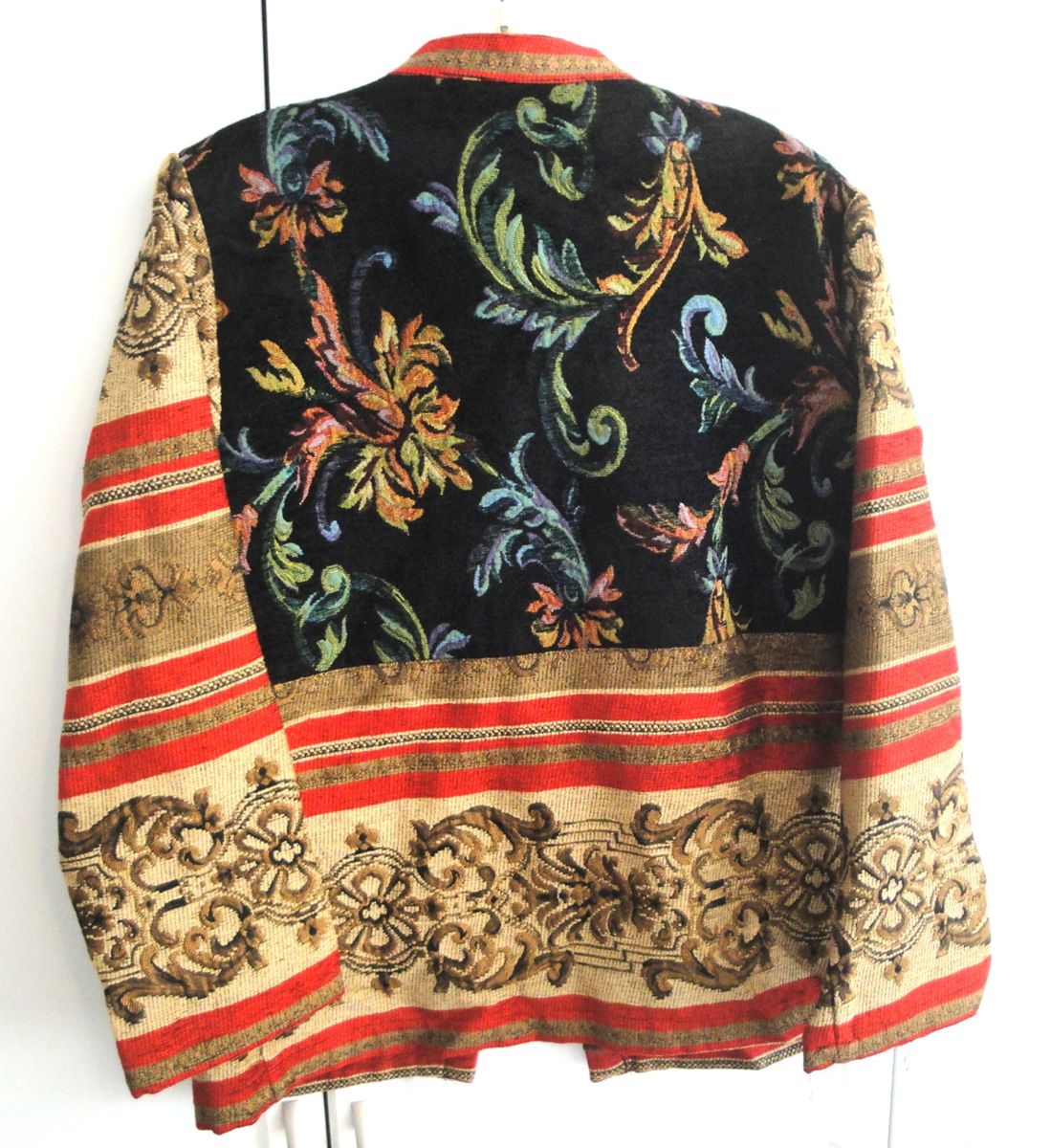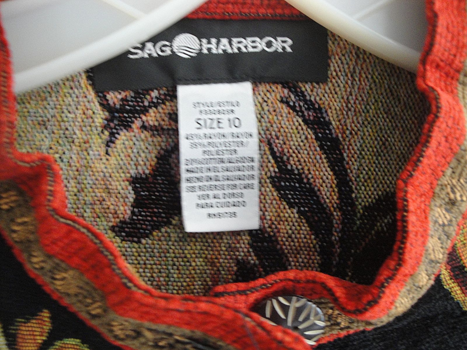 The Vintage Sag Harbor Embroidered Tapestry Jacket in size 10 is a stylish and versatile piece suitable for various occasions. Made from viscose material, this mid-length jacket features a geometric pattern with intricate embroidered accents, adding a touch of artistry to your outfit.