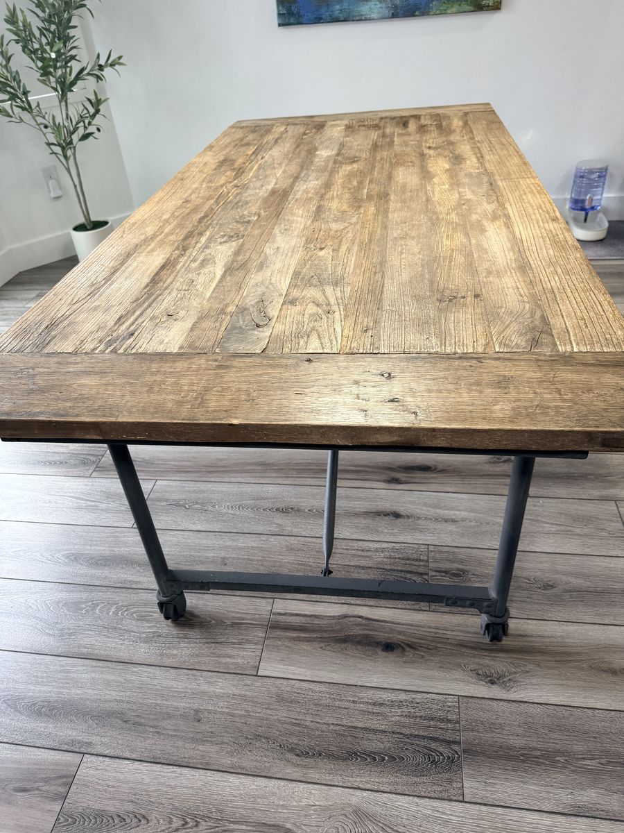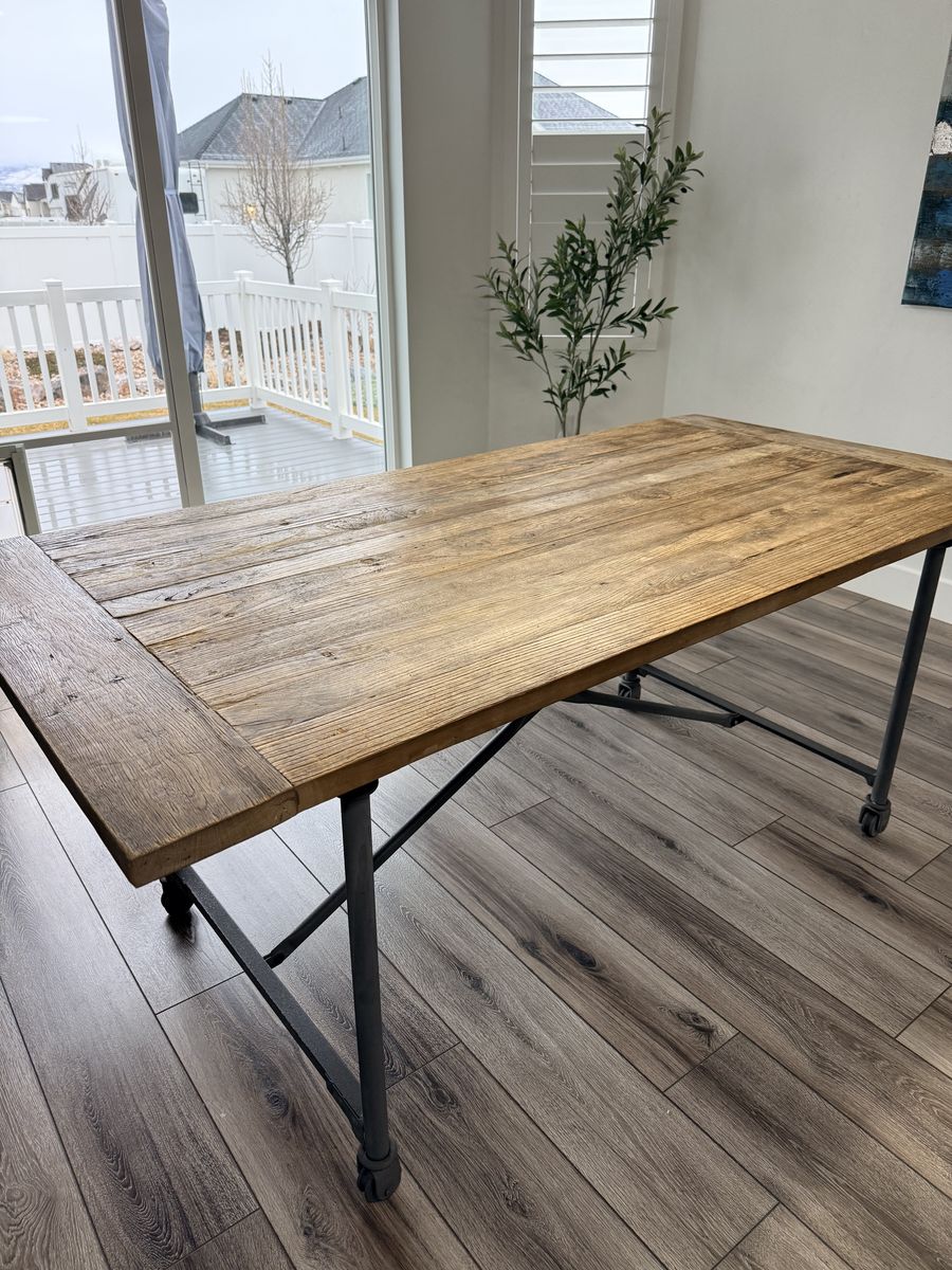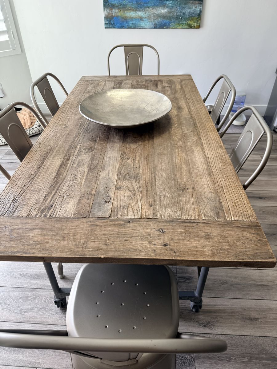 Beautiful Restoration Hardware dining set featuring a solid reclaimed wood table with industrial metal base and caster wheels, paired with 6 matching metal dining chairs.