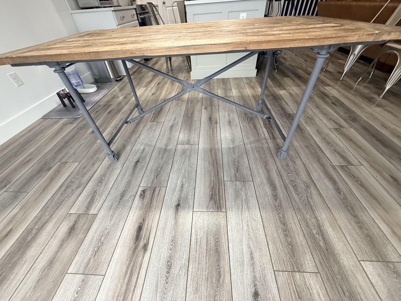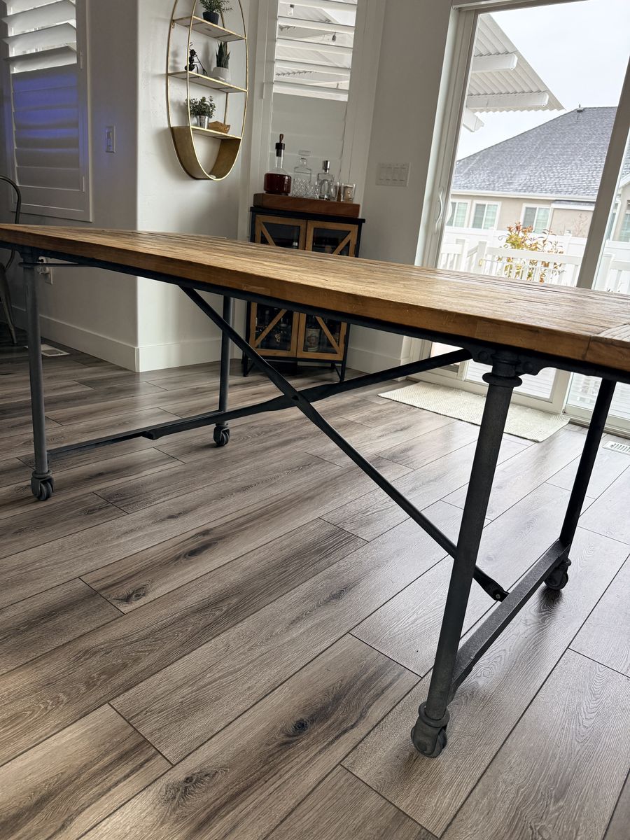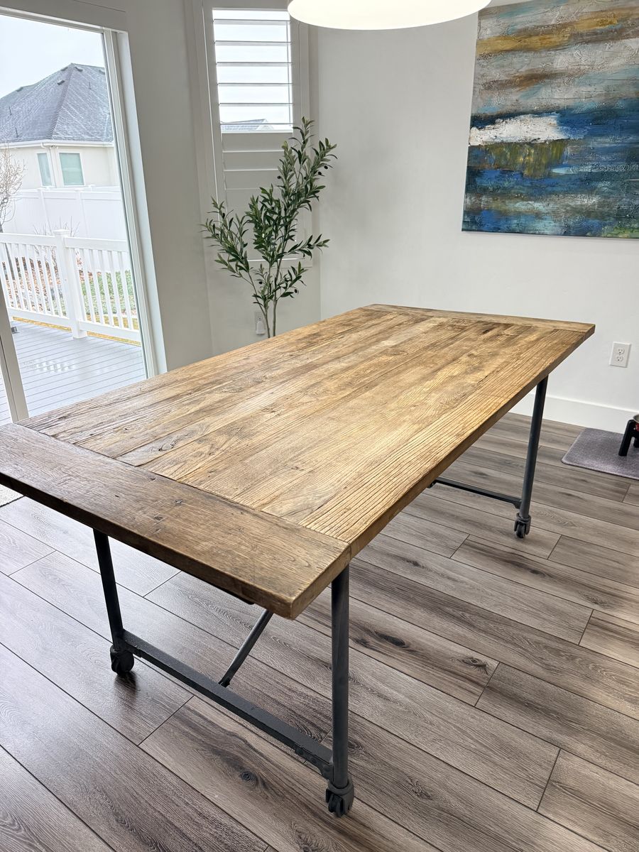 Beautiful Restoration Hardware dining set featuring a solid reclaimed wood table with industrial metal base and caster wheels, paired with 6 matching metal dining chairs.