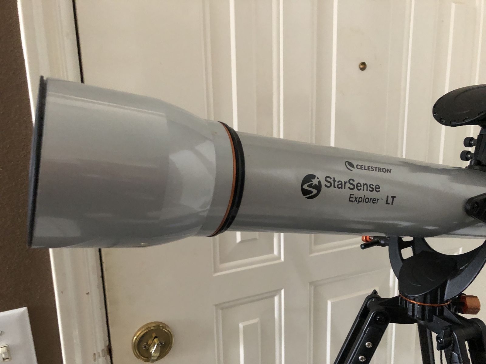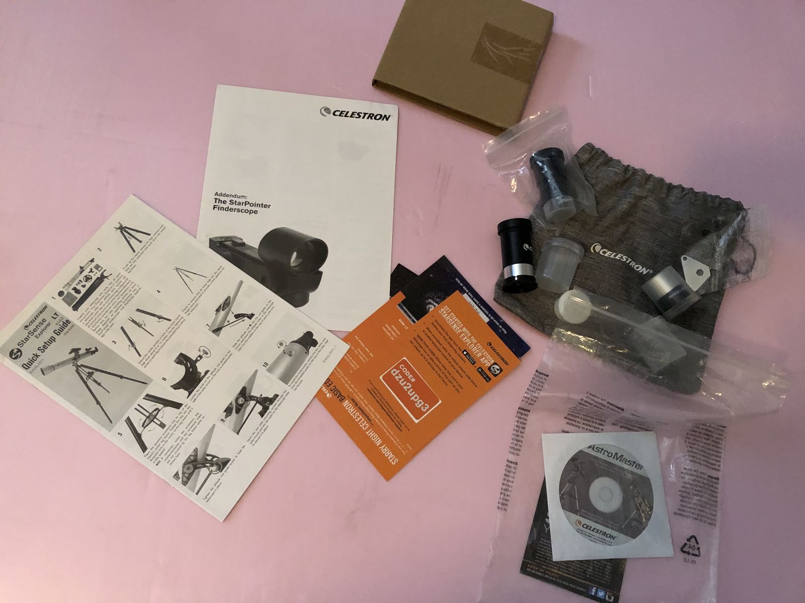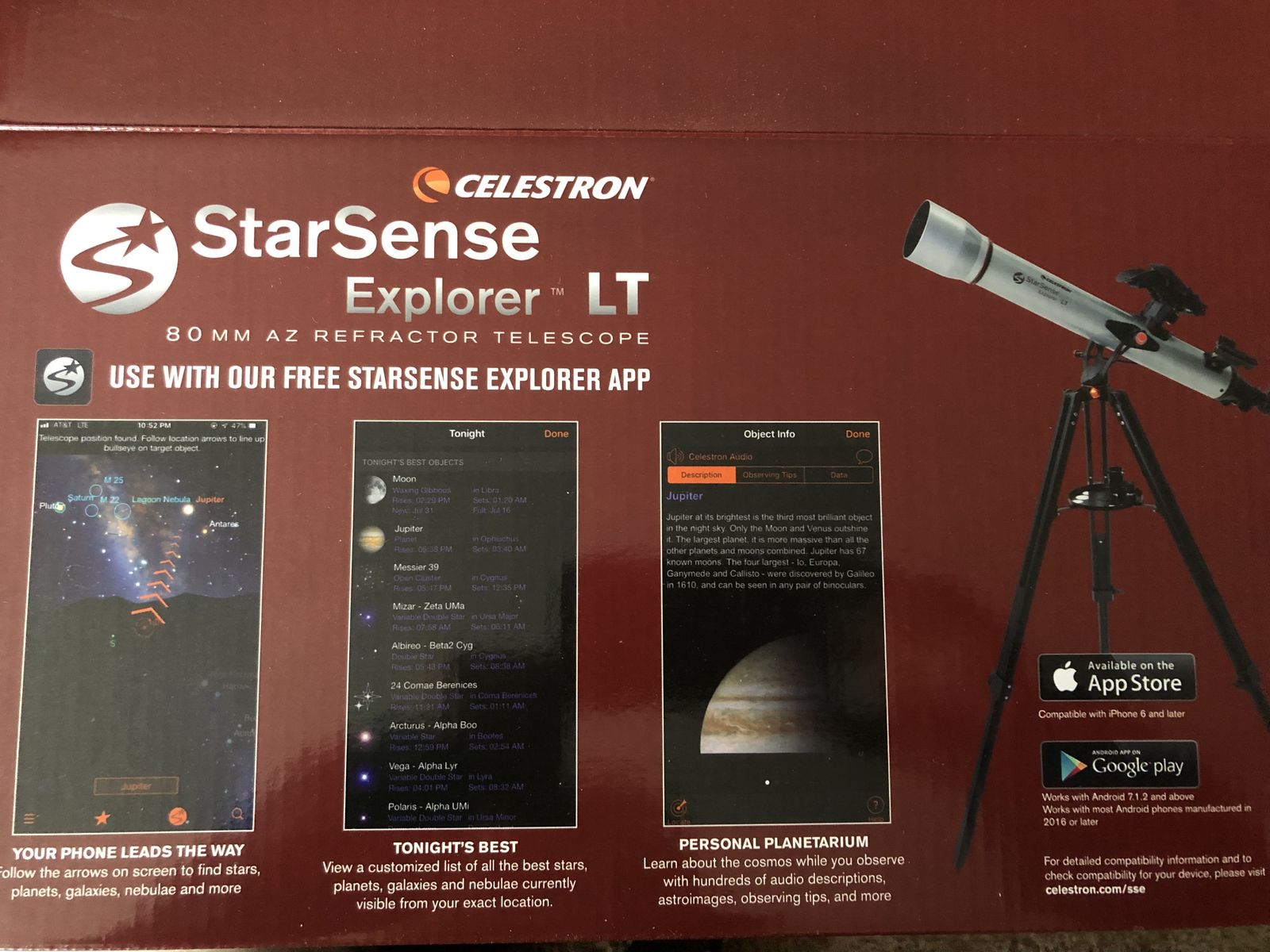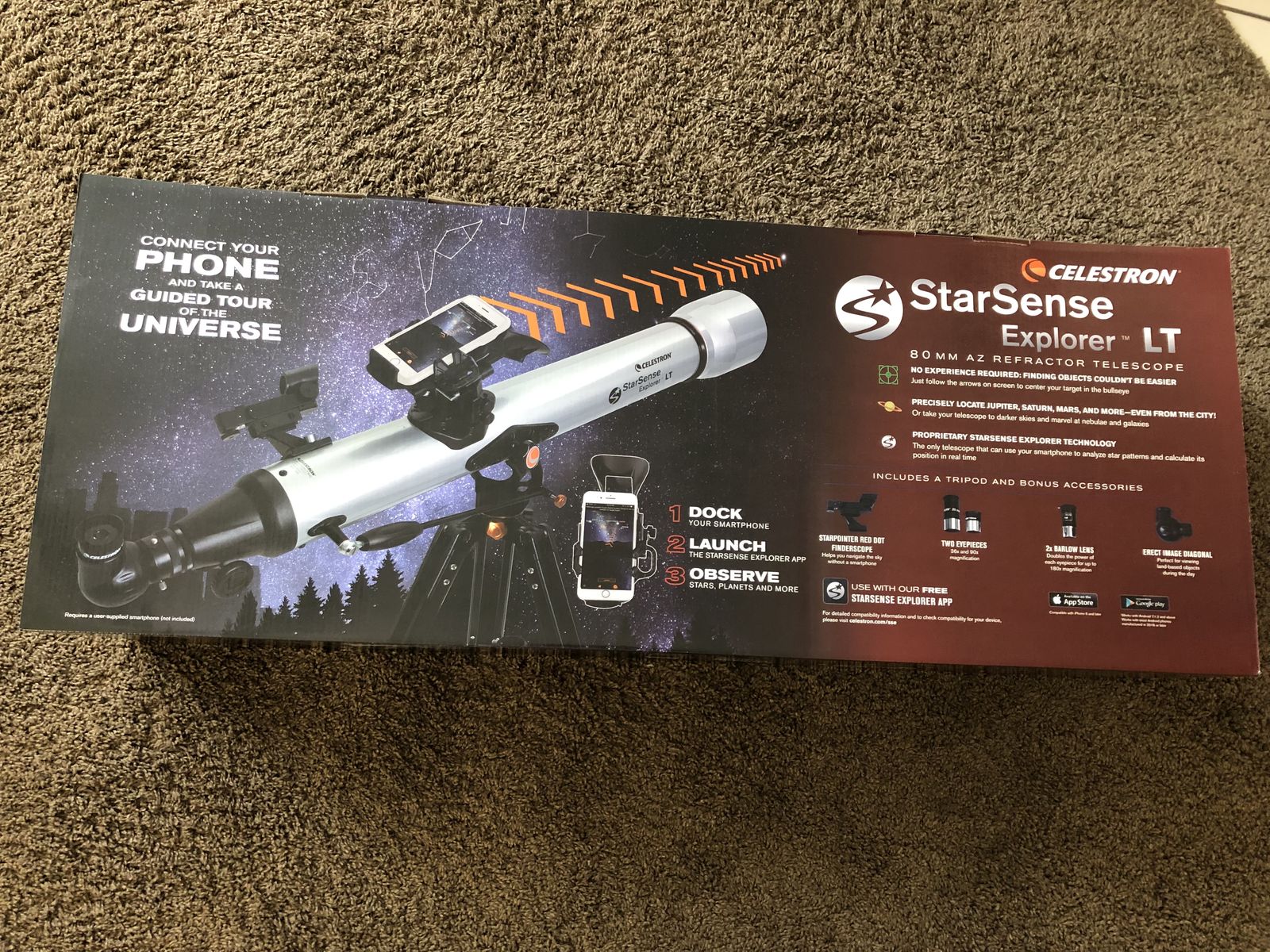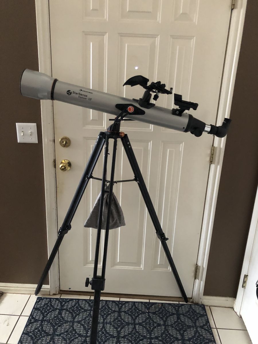 Celestron StarSense Explorer LT 80 MM AZ Refractor Telescope that is new and has never been used at all. We put it together for the photos but it comes with the box and all the accessories (including the accessory tray that doesn't show in photo and is still in the cardboard wrap). This telescope works with an app so so can attach to your iPhone to help find the stars and planets. It comes with the tripod and eyepieces. If you have a future stargazer in your family this is a great price for a new telescope.