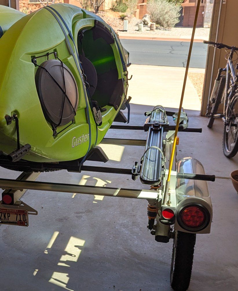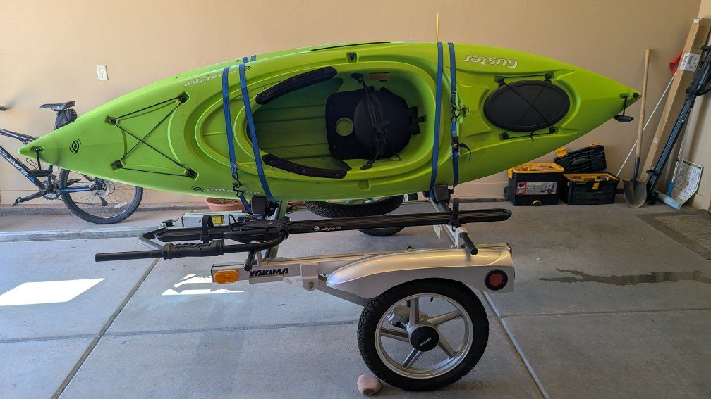 ZelleYakima kayak trailer and accessories includes two 10 ft kayaks with paddles, two j low kayak racks and two rocky mount bike racks all mounted on trailer Also included are heavy duty shocks, spare tire, kickstand.