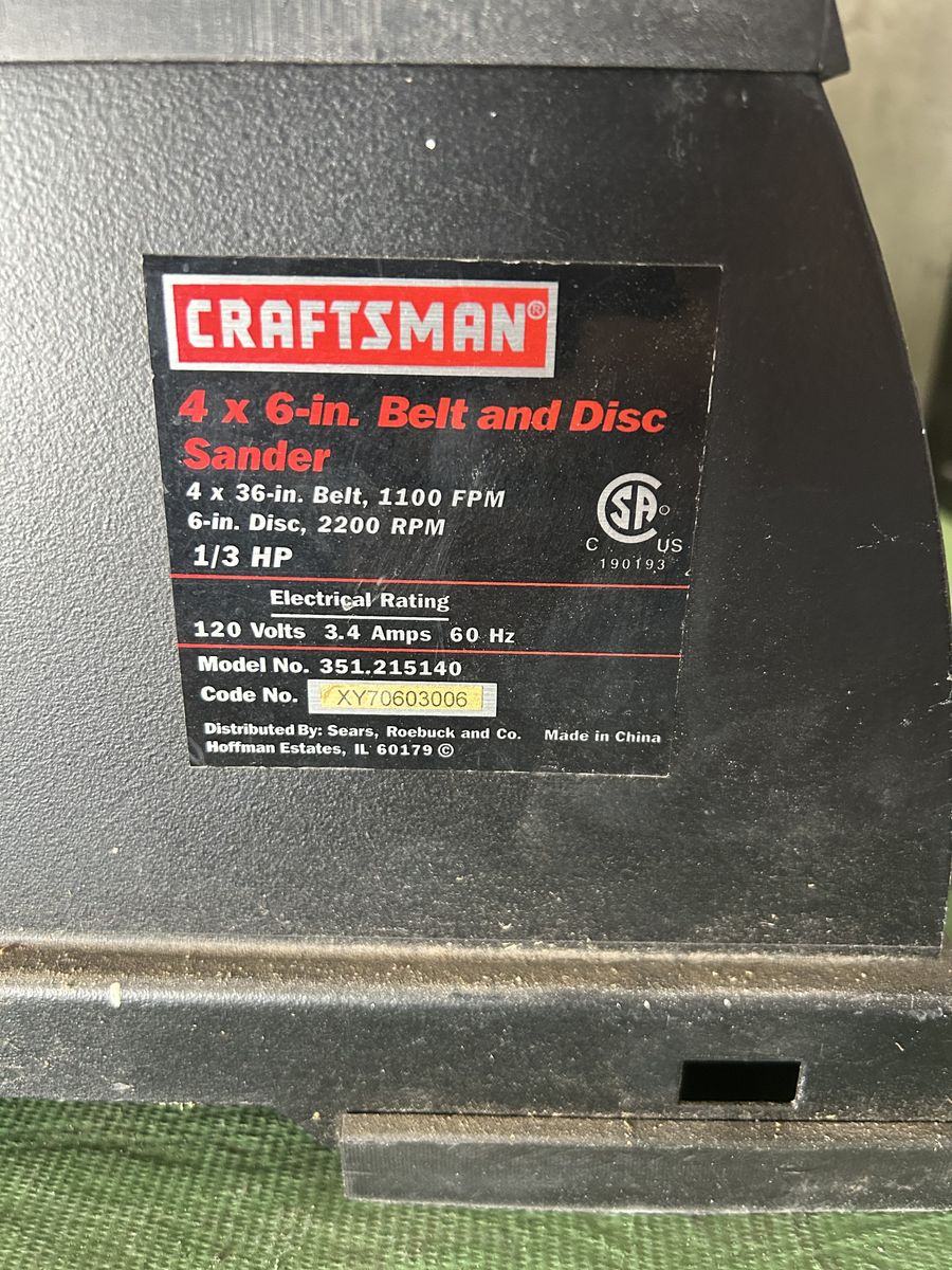 4 x 6 in. Belt and Disc Sander 4 x 36-in. Belt, 1100 FPM 6-in. Disc, 2200 RPM 1/3 HP 190 1 9,3 US Electriçal Rating 120 Volts 3.4 Amps 60 Hz Model No. 351.215140 Code No. XY70603006
