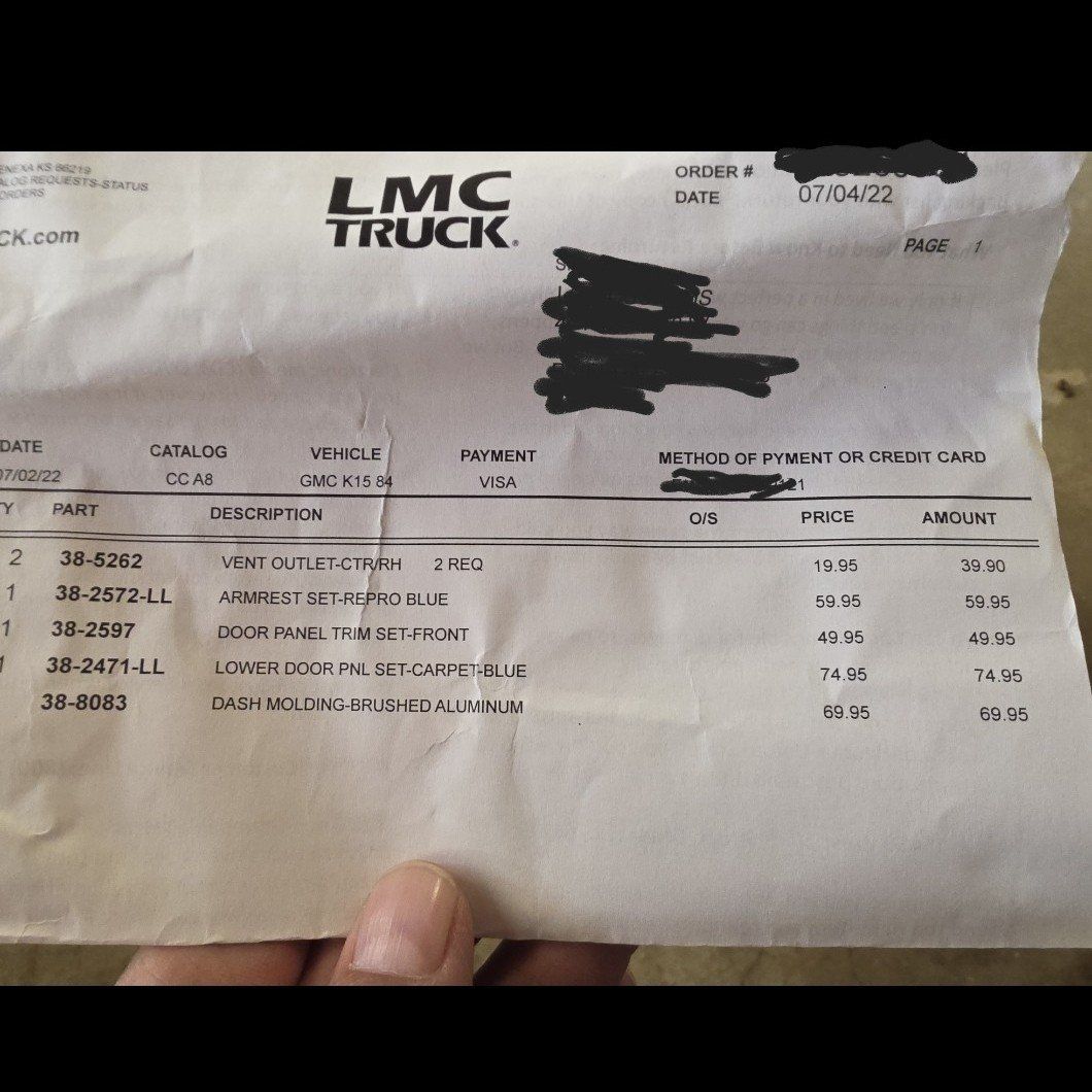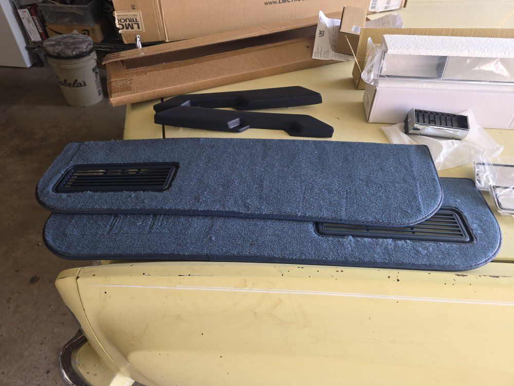 2 vents 1 set of armrest 1 set of door panel trim front 1 set of lower door panel carpet blue 1 dash molding brushed aluminum. I bought these parts from LMC so they are all new. thanks for looking.