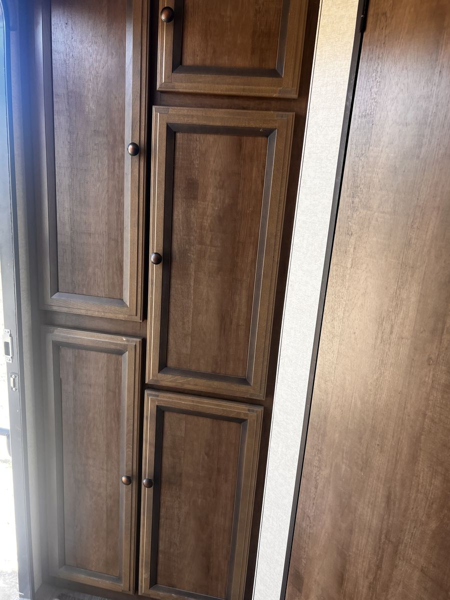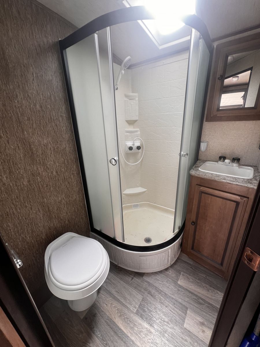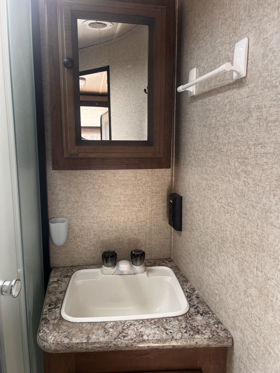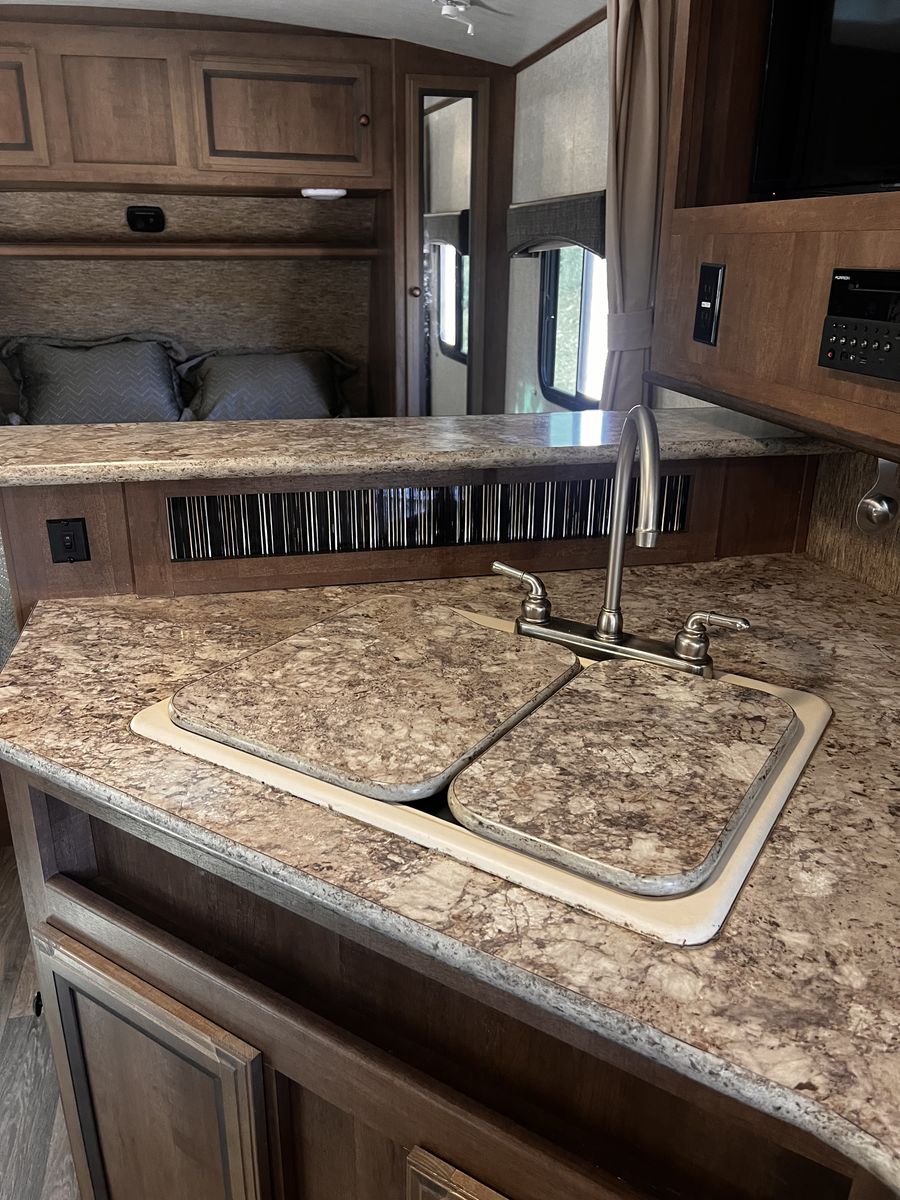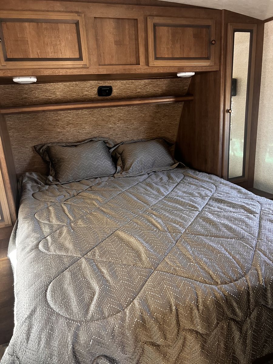 CashAppGreat couples coach. Easily pulled with F150 or similar; walk-around queen, large kitchen with lots of counter space. 3-burner stove, fridge, oven, microwave, TV, outdoor speakers, dinette slide-out that converts to a bed, outside grill, awning with additional shade attachment, and new batteries. Includes a brand new Sinepower Pro 2000W generator, bike rack, anti-sway 3-point hitch, large underneath storage, and lots of cabinet storage. Great camper just switching to a 5th-wheel.