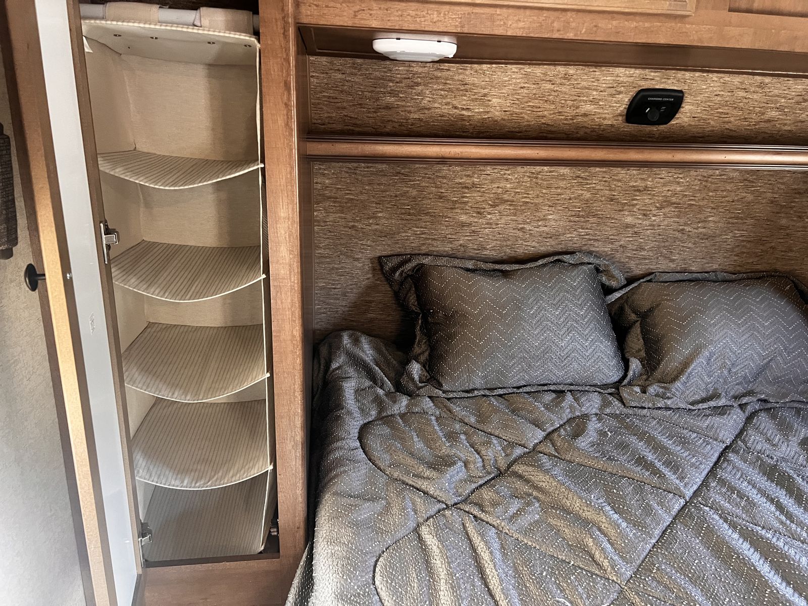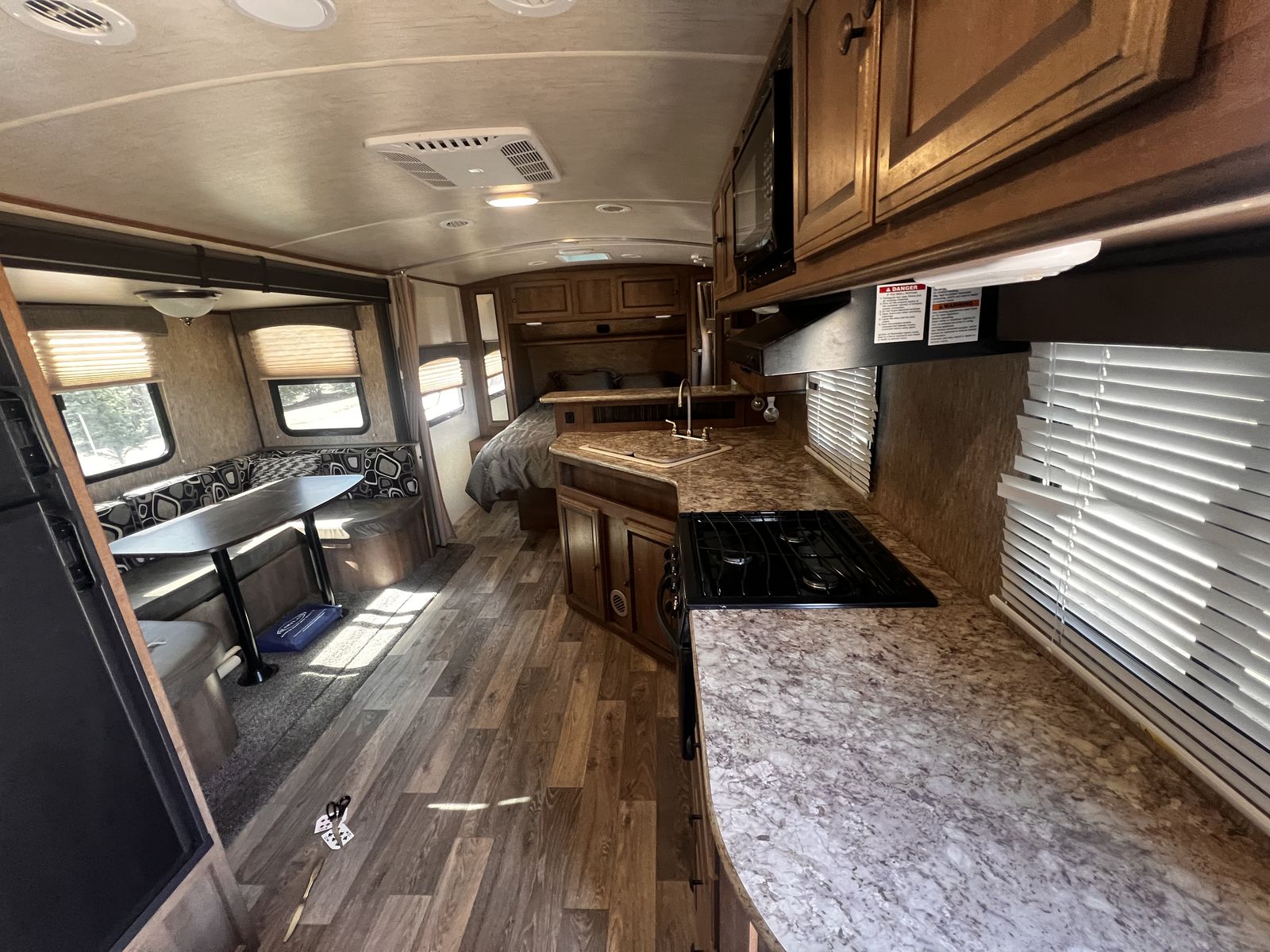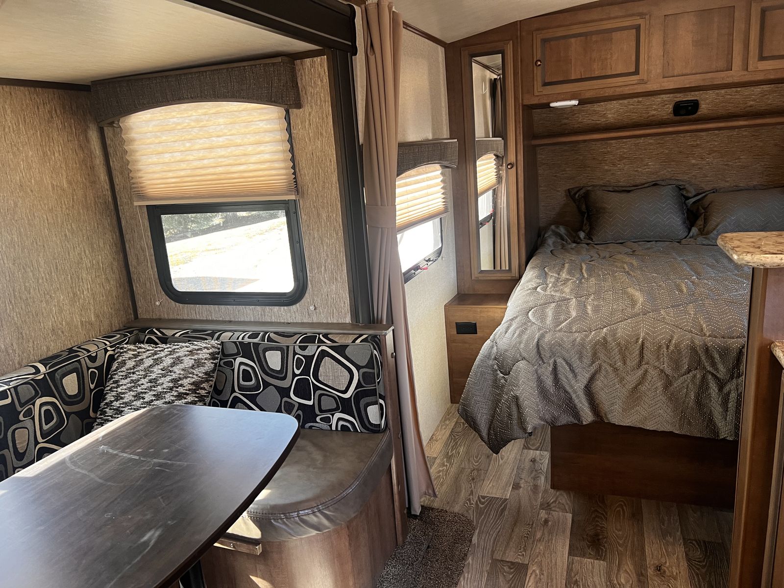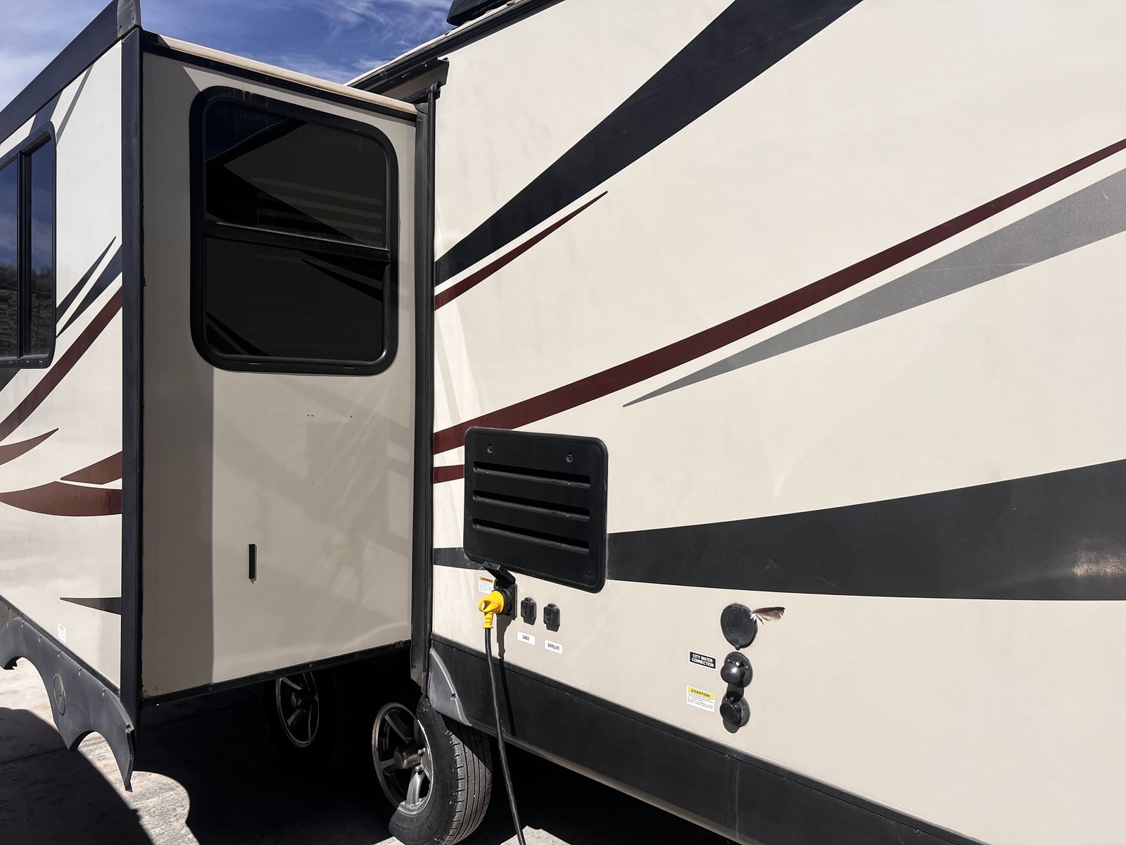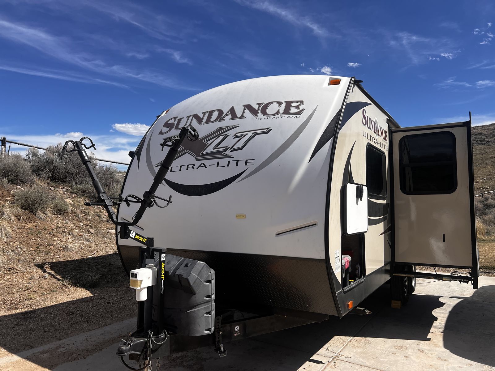 CashAppGreat couples coach. Easily pulled with F150 or similar; walk-around queen, large kitchen with lots of counter space. 3-burner stove, fridge, oven, microwave, TV, outdoor speakers, dinette slide-out that converts to a bed, outside grill, awning with additional shade attachment, and new batteries. Includes a brand new Sinepower Pro 2000W generator, bike rack, anti-sway 3-point hitch, large underneath storage, and lots of cabinet storage. Great camper just switching to a 5th-wheel.