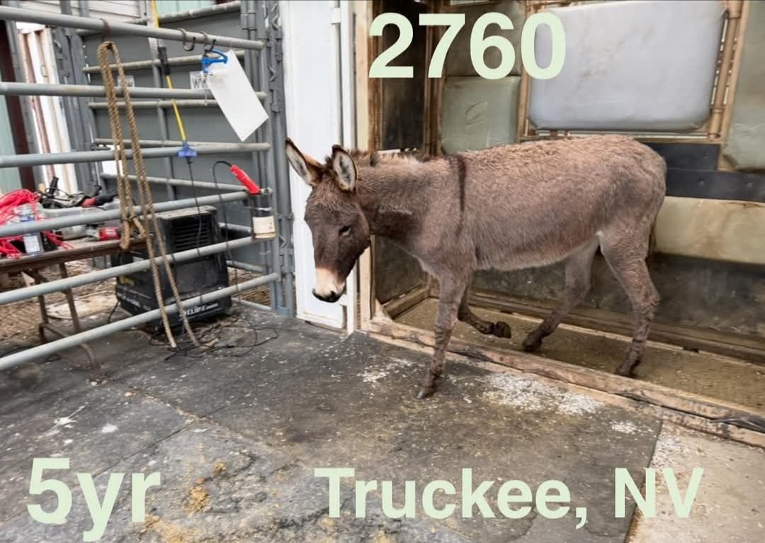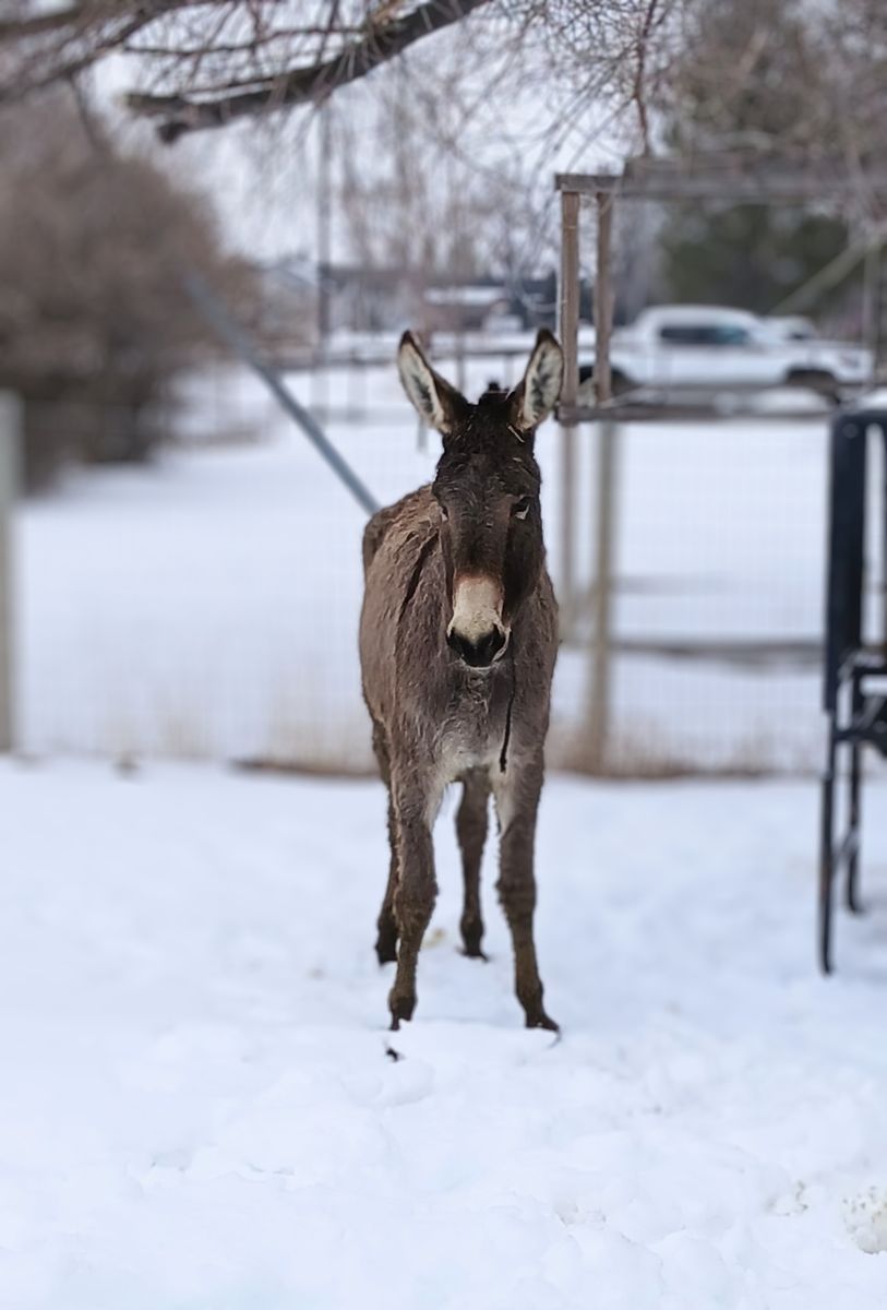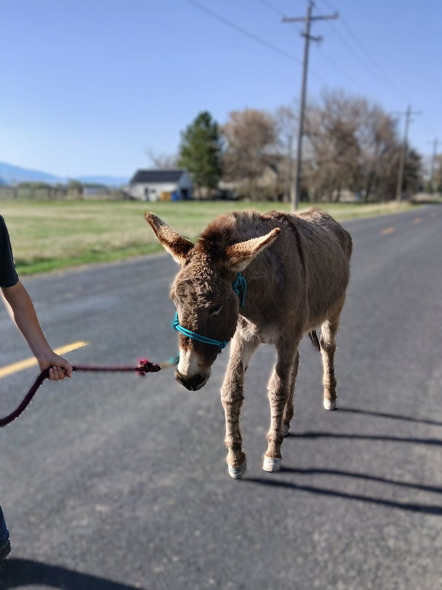 She is 6 yrs old, about 500 lbs and 12 h tall. Good with us picking up her hooves. She's been trimmed once while we've had her. She is due for another trim soon. We had no problems deworming her. She walks around obstacles, over poles, and down the road with no problem, even with vehicles passing. She's been bathed, takes a blanket with no problem, and has walked around with my kids on her bareback. She gets along with our horses, dogs, and cats. She is a SUPER SWEET burro. She's a little wary of strangers and struggles stepping up onto things like a platform or trailer.