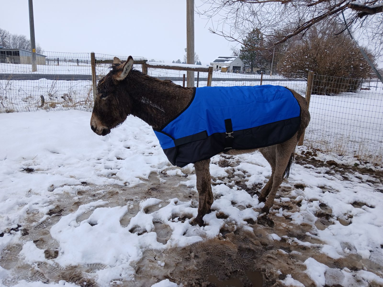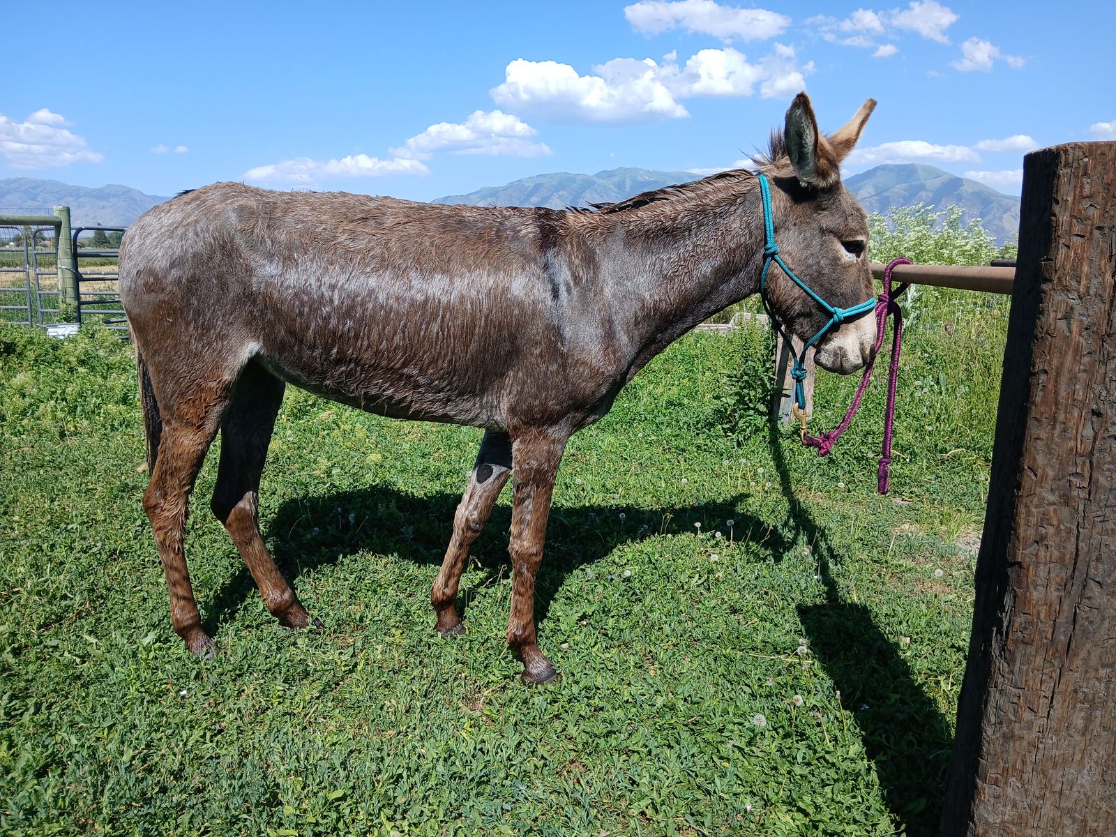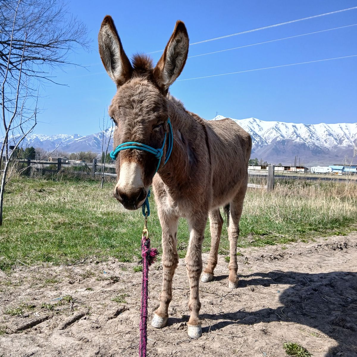 She is 6 yrs old, about 500 lbs and 12 h tall. Good with us picking up her hooves. She's been trimmed once while we've had her. She is due for another trim soon. We had no problems deworming her. She walks around obstacles, over poles, and down the road with no problem, even with vehicles passing. She's been bathed, takes a blanket with no problem, and has walked around with my kids on her bareback. She gets along with our horses, dogs, and cats. She is a SUPER SWEET burro. She's a little wary of strangers and struggles stepping up onto things like a platform or trailer.