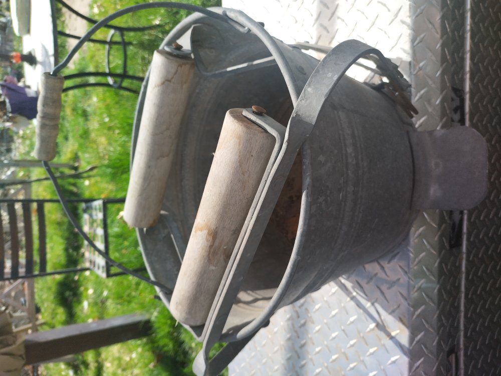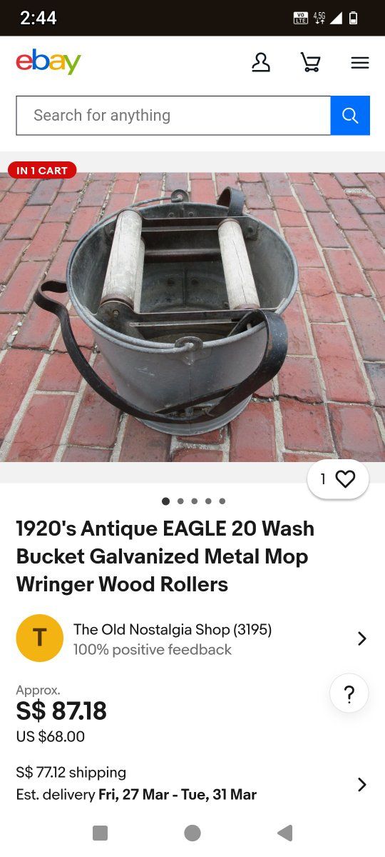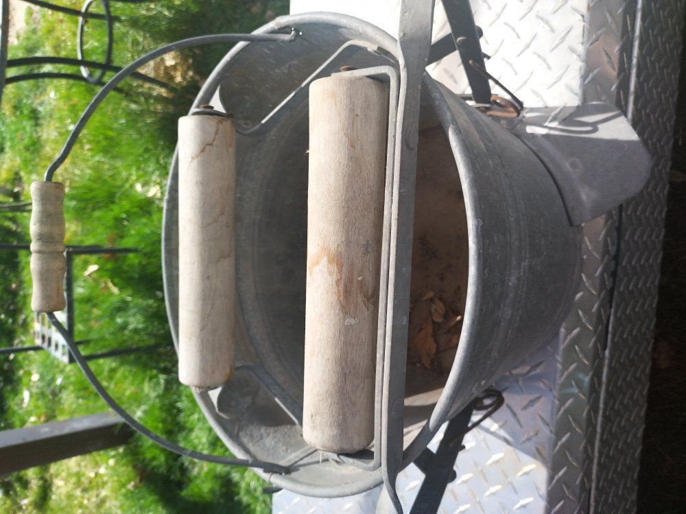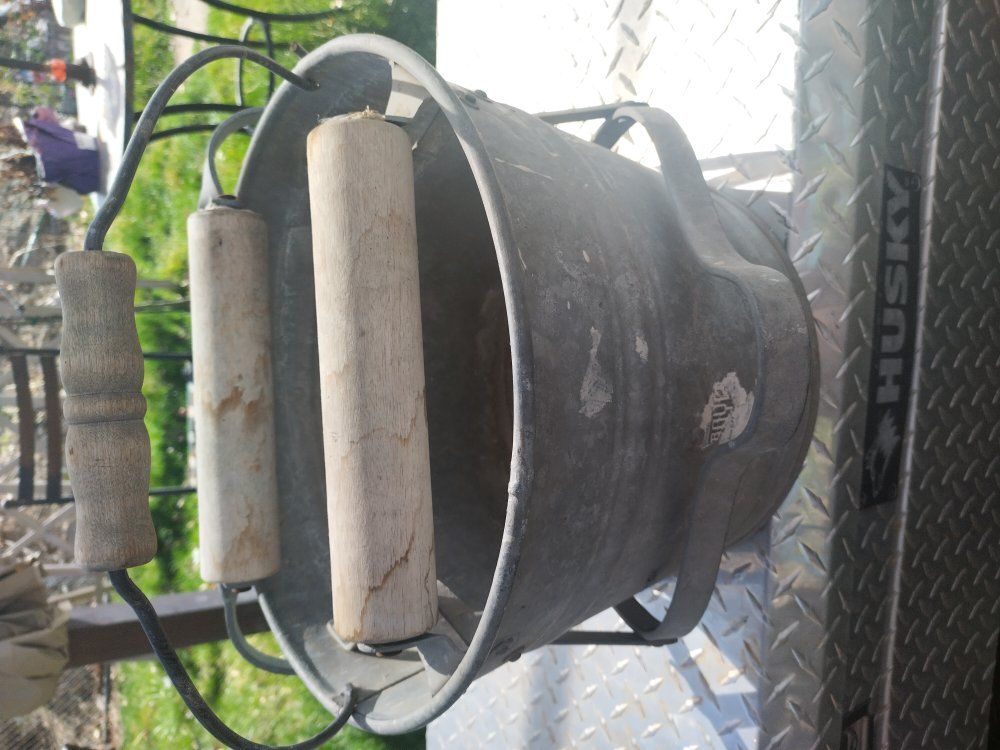This vintage item is a galvanized metal mop bucket with a wooden roller wringer, likely manufactured by Eagle in the early 20th century. Era: Primarily from the 1900s–1940s. Material: Galvanized metal with wooden handle rollers. Use: Industrial cleaning and laundry wringing.