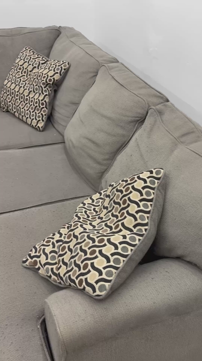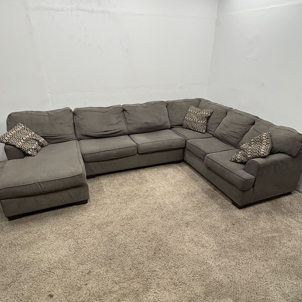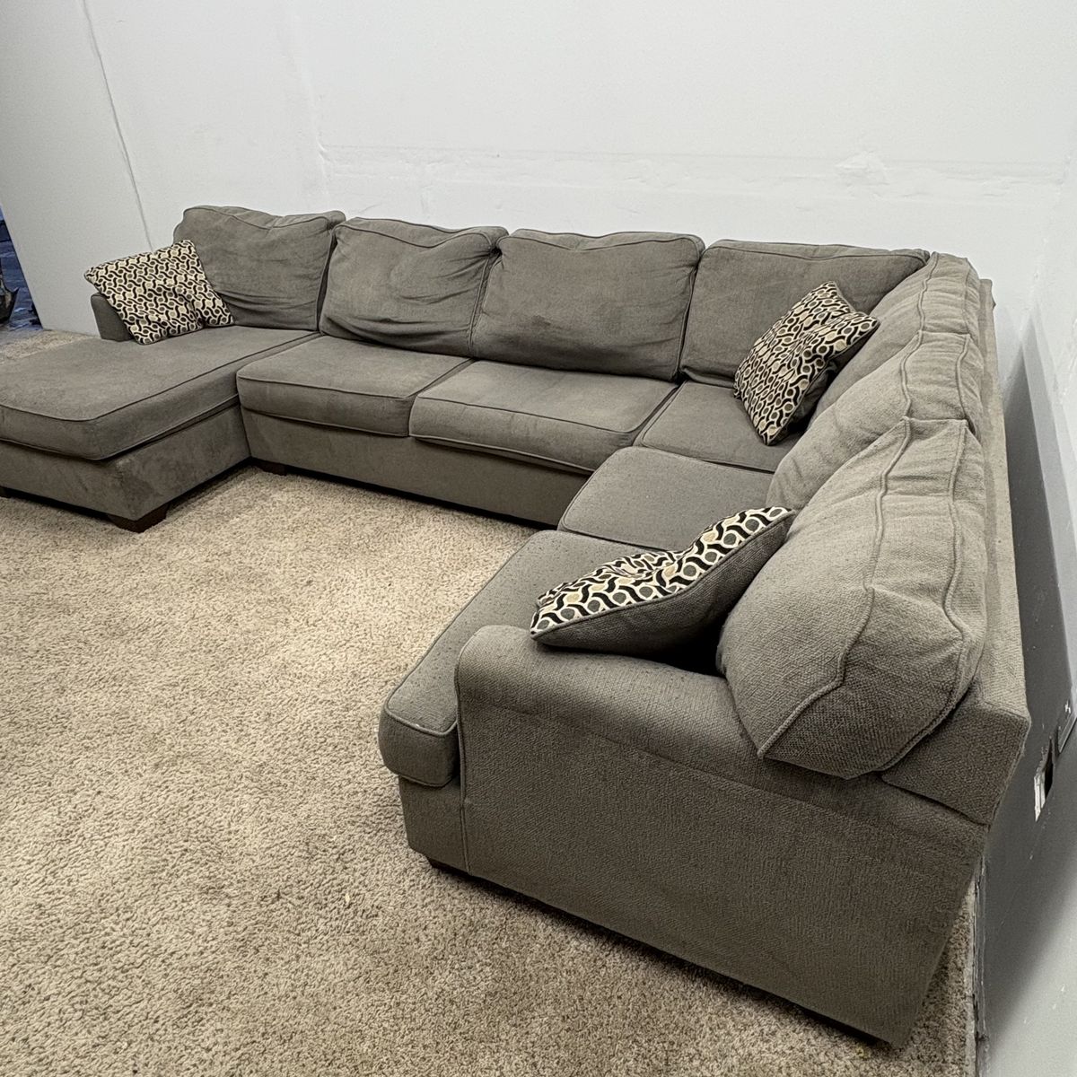 Spacious U-shaped grey sectional sofa. Has a comfy chaise lounge on one end. Comes with the three patterned throw pillows. Great for a living room or basement space. Check the video for more details