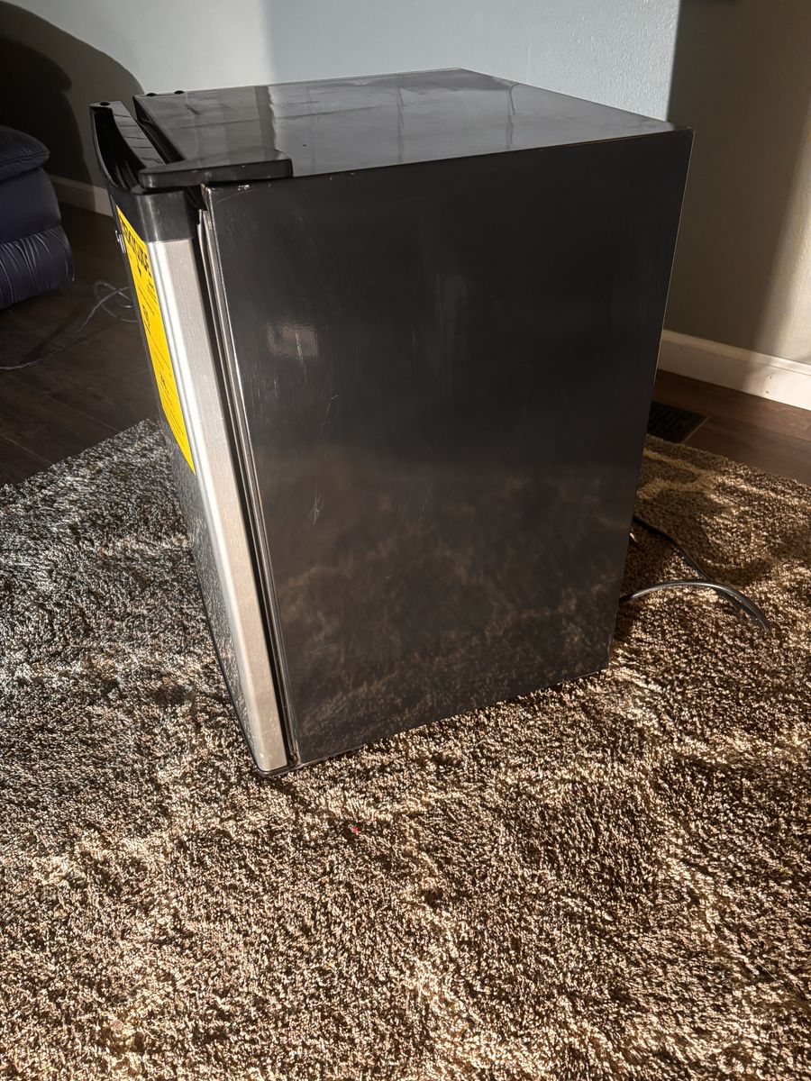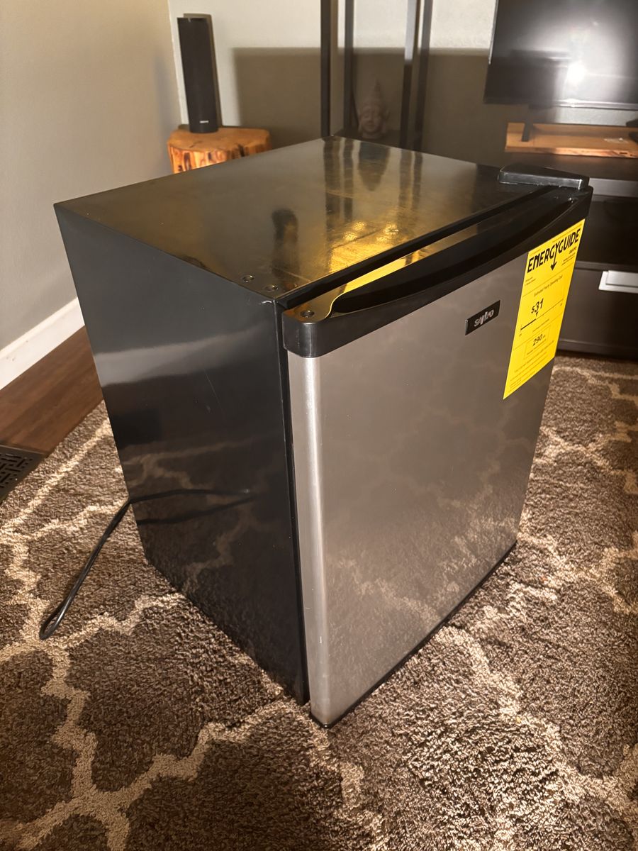 Clean, compact Sanyo mini fridge with stainless/chrome-look door and black cabinet. Great size for office, bedroom, dorm, garage, or bar area.