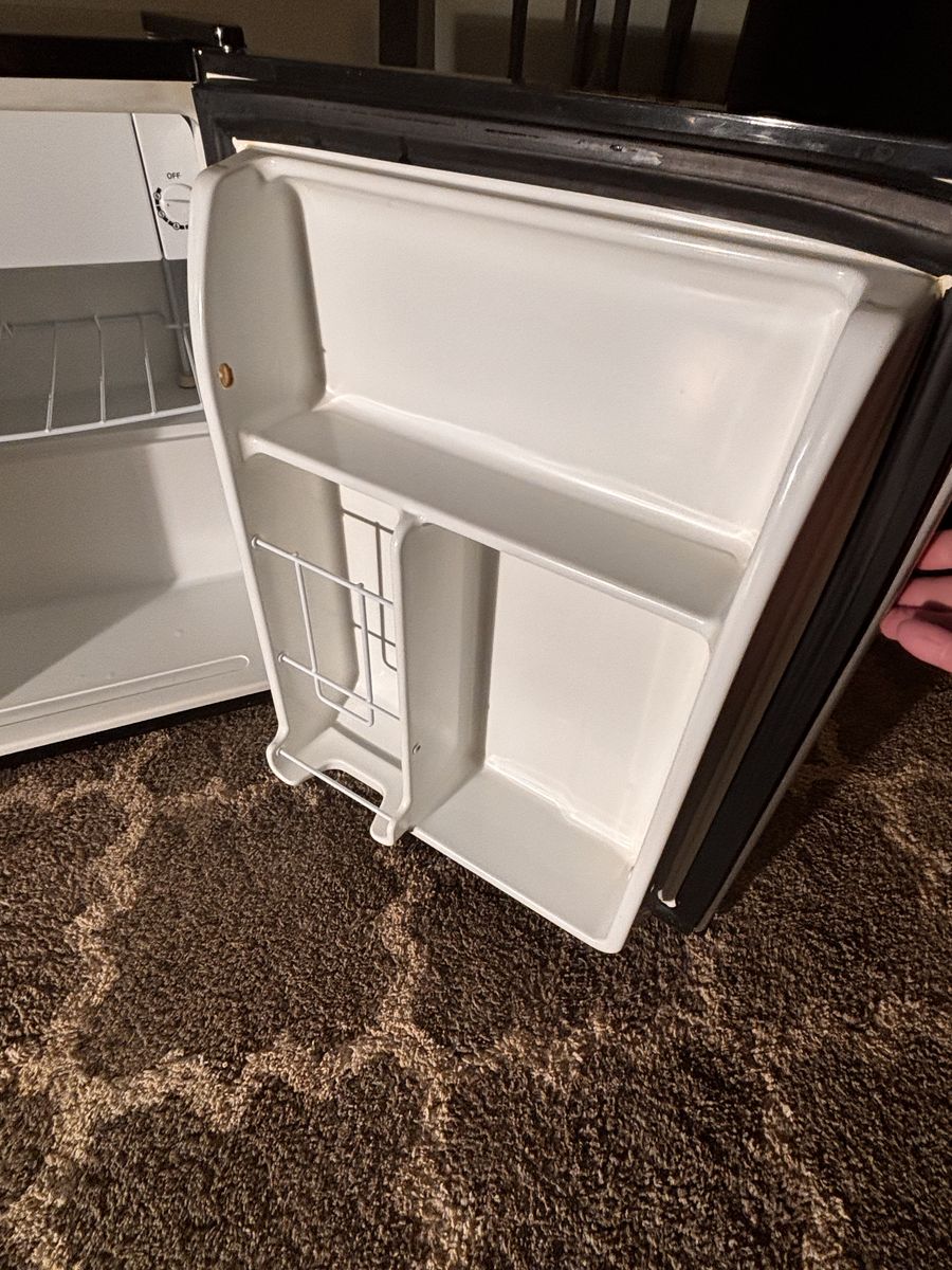 Note: Missing upper door shelf retainer bar. Easy to replace or do without.