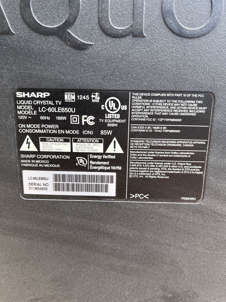 ApplePay60” Sharp Aquos LC-60LE650U in great condition It’s a little dusty but works perfectly. Display is 120Hz 1080p