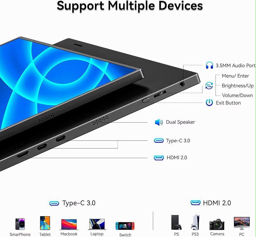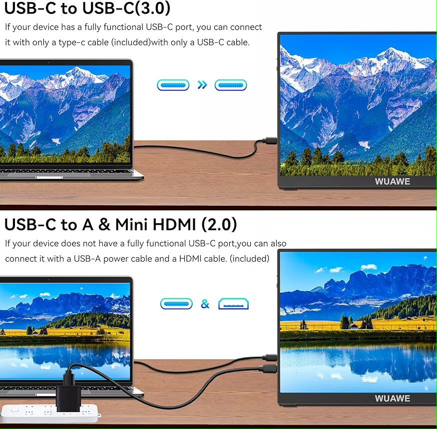Plug and Play External Monitor: WUAWE portable screen just got even more convenient with plug-and-play functionality. Simply connect to power and display signal transmission using a USB Type-C cable - no drivers needed. With 2 full-featured Type-C ports and a mini HDMI port, easily connect to your laptop, PC, cell phone, Mac, PS5/PS4, and Switch for seamless connectivity on-the-go. (Note: Thunderbolt 3.0 or USB 3.1 Type C DP ALT-MODE required for compatibility).