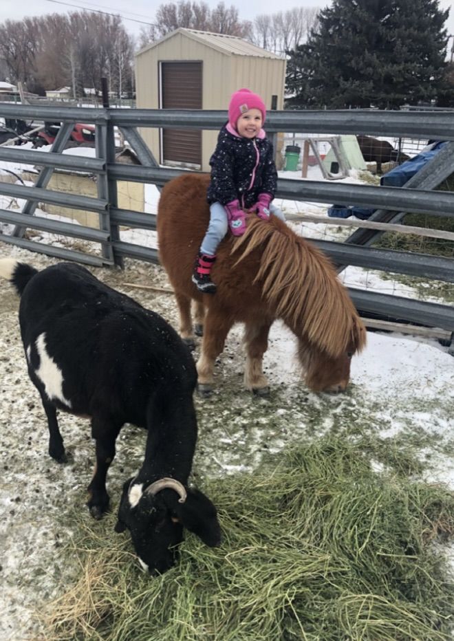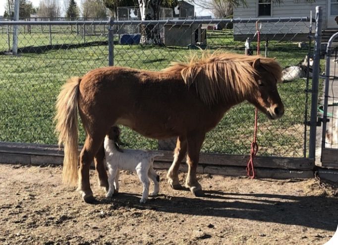 Sweet little pony mare. She loves goat kids and she loves human kids. Our kids climb all over her. Easy to catch, halter, pick up feet. We use her for a lead line pony.