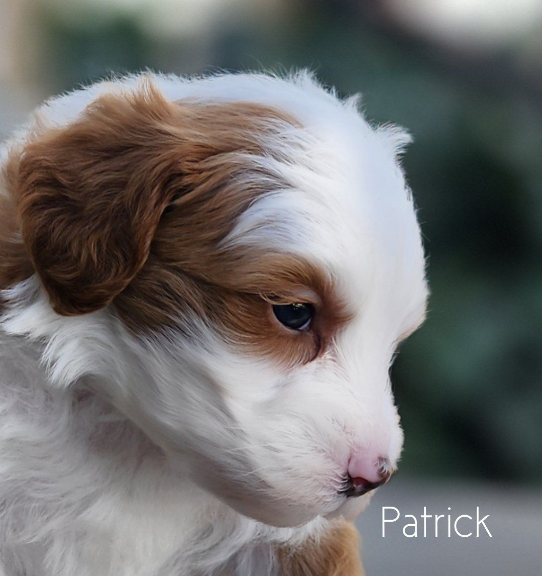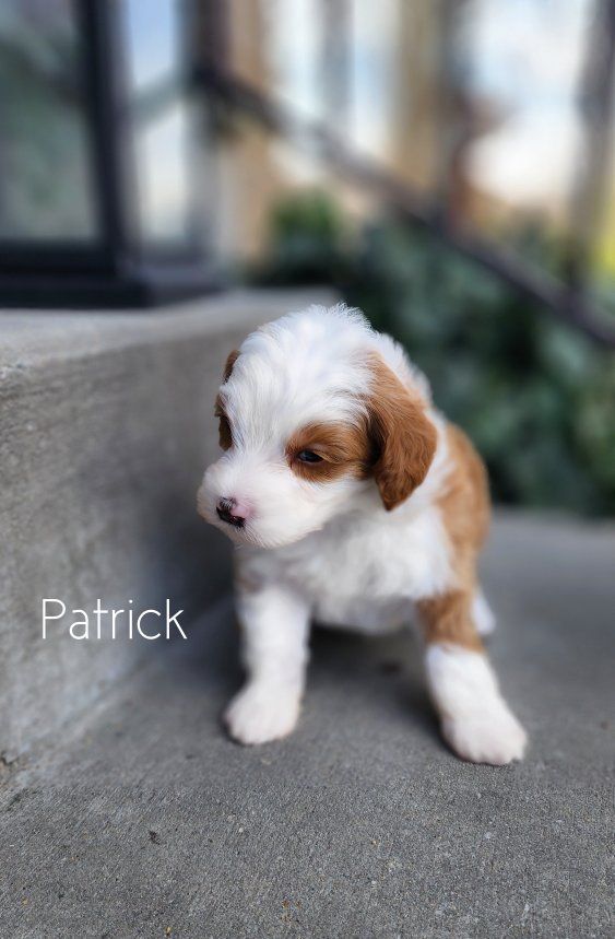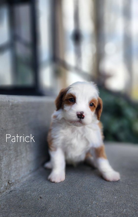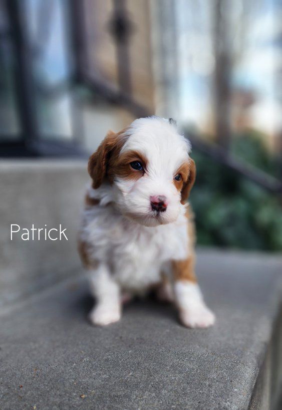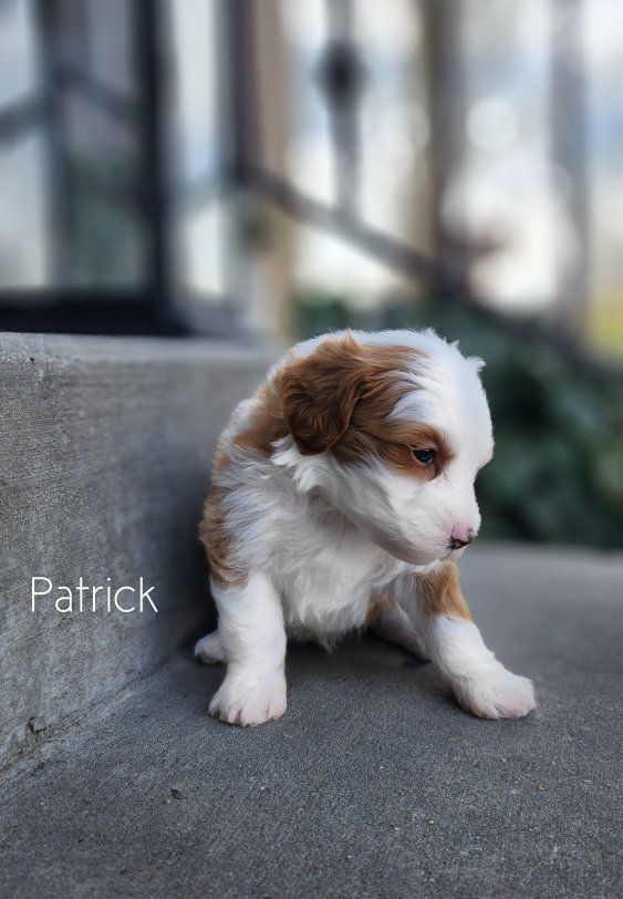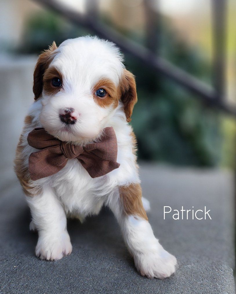 ZelleMeet Patrick 🤍 a Micro Mini Bernedoodle with a look that turns heads and a temperament that melts hearts. With his beautiful white abstract contrasting against deep red and soft, ️wavy️ coat, he offers that low to non-shedding quality many families are looking for allergy considerations—paired with an easy, manageable texture. Patrick is expected to mature to between 10–18 pounds, making him the perfect “take anywhere” companion. Small enough for travel and everyday convenience, yet sturdy enough to keep up with an active lifestyle. Raised right in our home with intention and care, Patrick is being started on proven protocols that focus on temperament development, early socialization, and foundational training. He’s growing into a people-loving little guy who will transition smoothly into family life. If you’re looking for a well-rounded, thoughtfully raised Bernedoodle in a perfectly portable size, Patrick may be just the one 🤍 ️Delivery available. ️3 year Genetic Health Guarantee ️Go home date April 15th! Please follow us, ️Salty Paws Doodles️, on social media for updates, available puppies, and a behind-the-scenes look at how we raise our puppies.