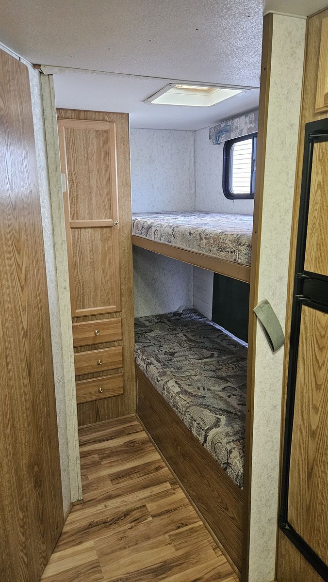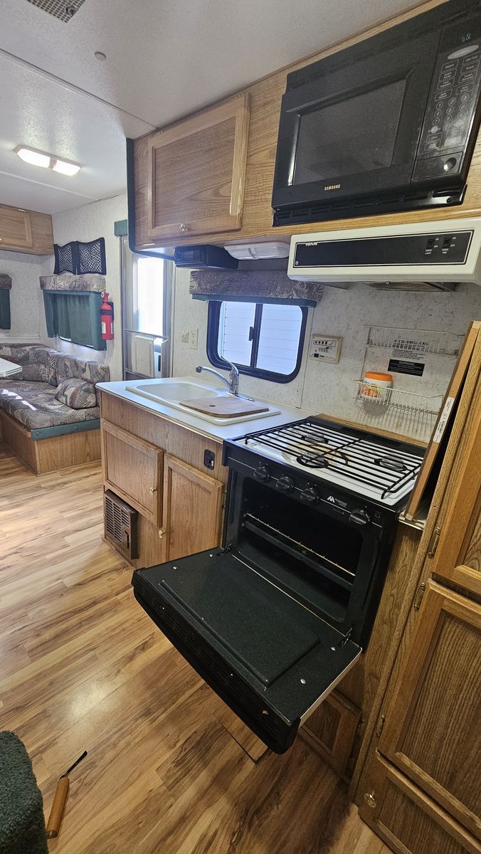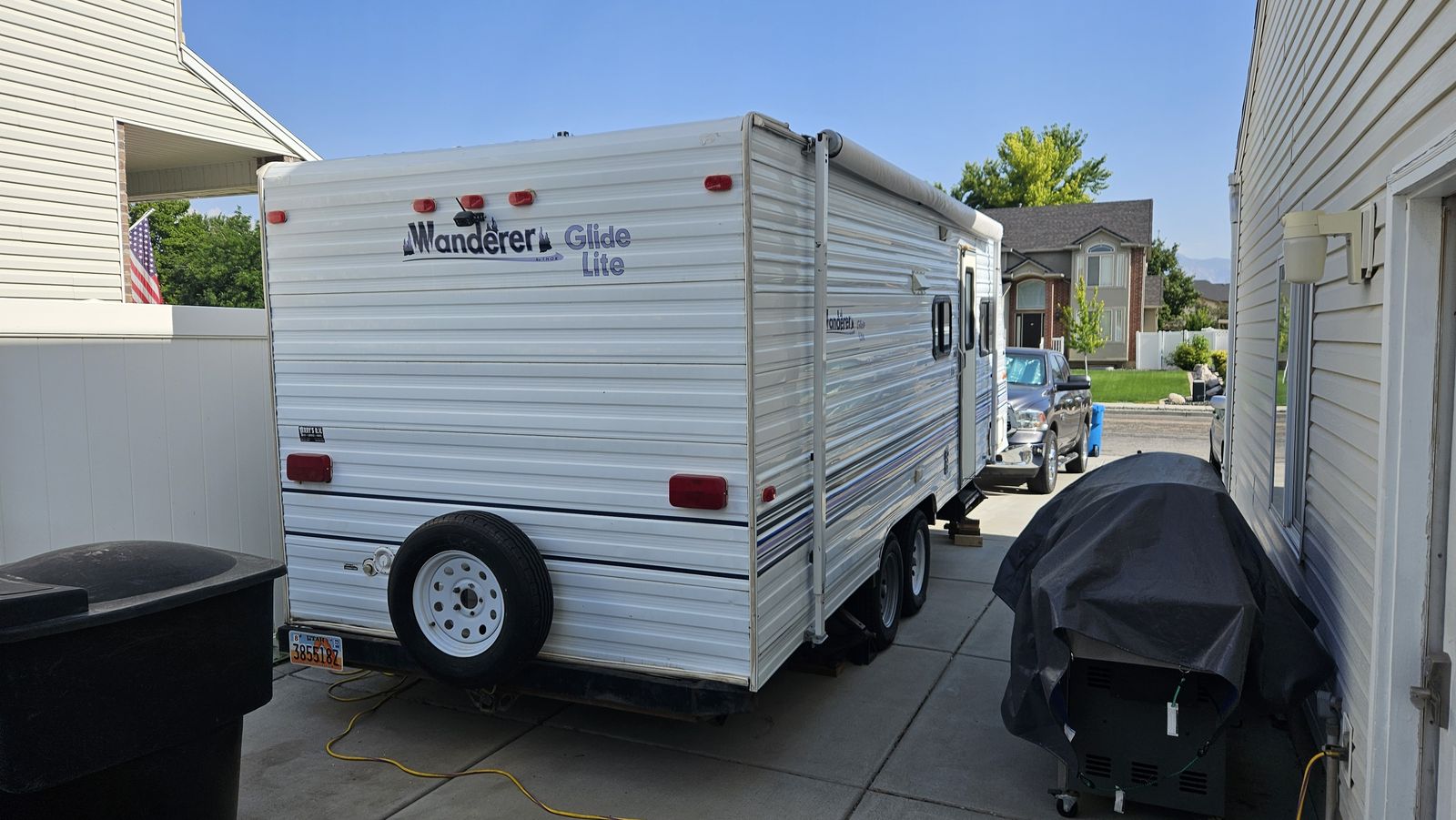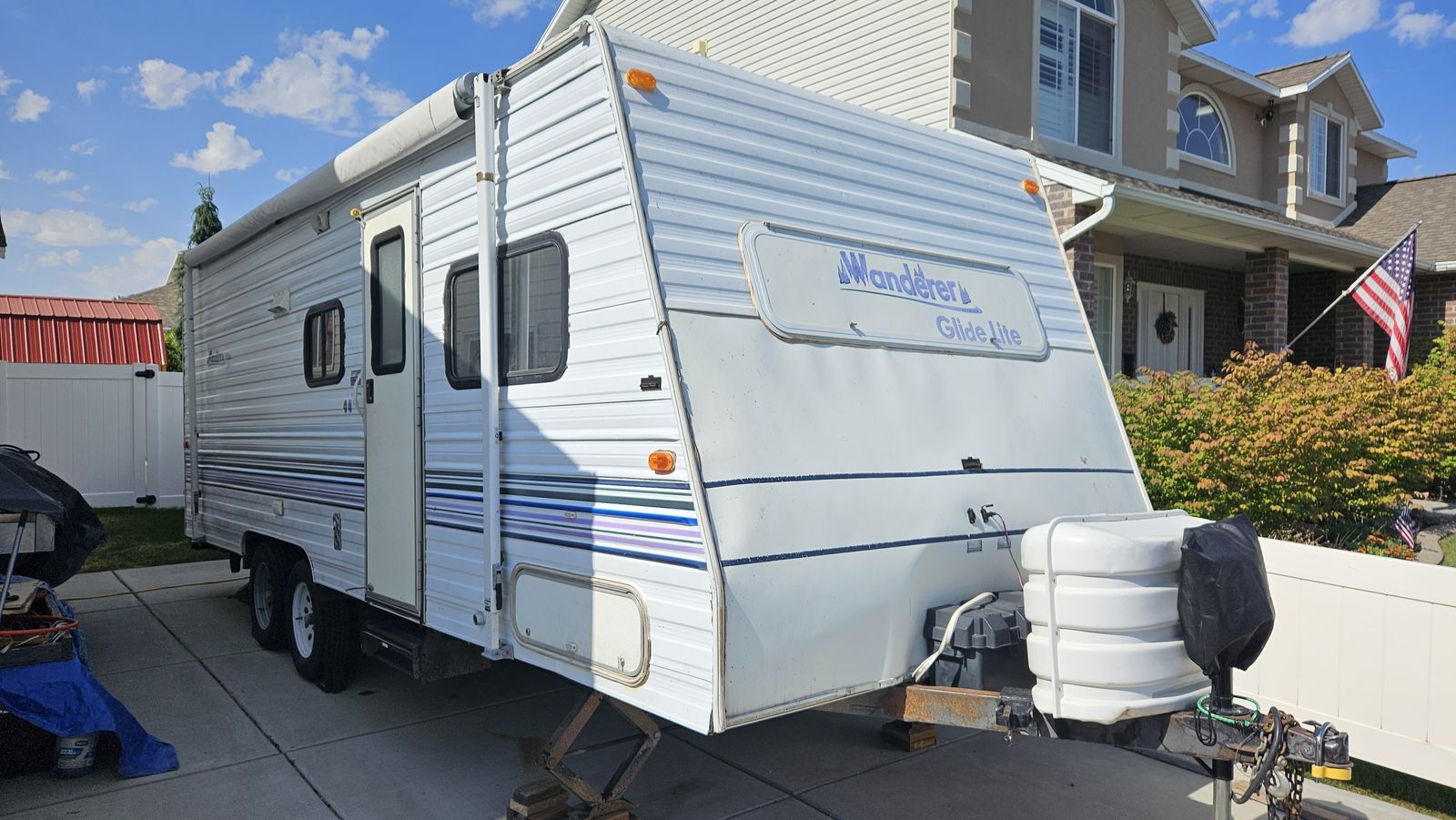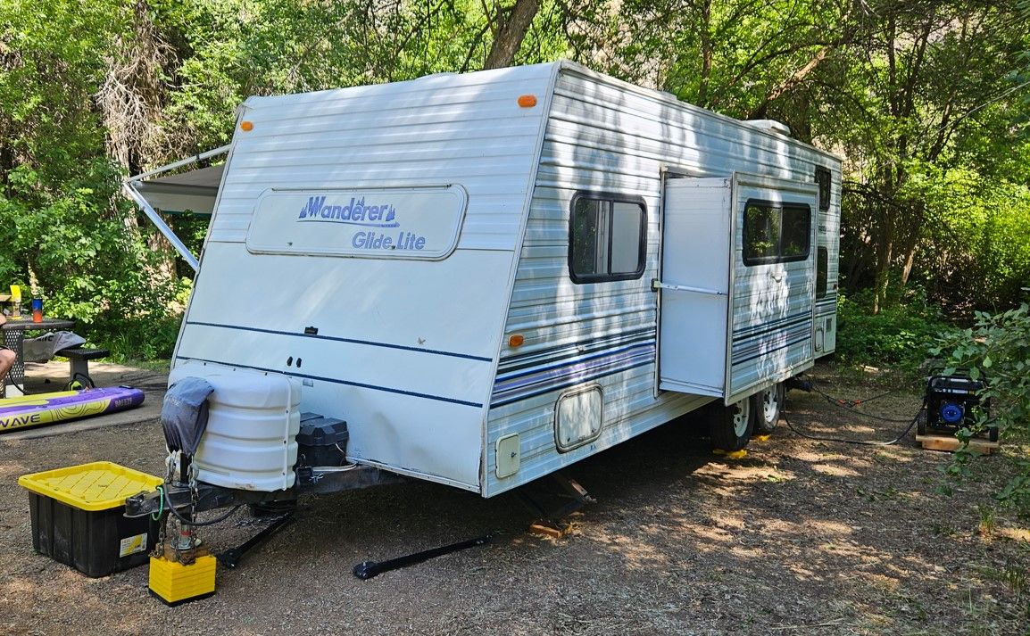 ZelleThis is a model "239MS GL" Wanderer Glide Lite Travel Trailer, that is in very good condition for its age. We just upgraded to a newer camper, but I've spent the 2 years we've had this making it really nice. This camper is an ideal entry-level camper. It weighs just 3580 lbs empty, with a max gross of 5600. The dual-axle design makes it very comfortable to tow. Includes mounted backup camera and monitor. Also includes anti-sway trailer bars and hitch. It is fully-functional (water heater, furnace, AC, stove, Bluetooth stereo, etc.). I upgraded the internal lighting to LEDs, including dimmers over the sleep areas. Added an electric hitch, for easy setup. I bought a new awning 2 years ago. New entry lock and outdoor shower. I added mirror tint to all the windows this year. I added 2 SAE wire pass-through ports to the front to easily connect solar panels. Water holds are 25g fresh, 15g gray, and 10g black. 3-burner stove with oven. Refrigerator works off 110V AC or propane. Comes with two 20lb propane tanks. Side pop-out for the inside couch/bed. This camper has lots of storage! I also added gas struts to all the vertical-opening cabinets.
